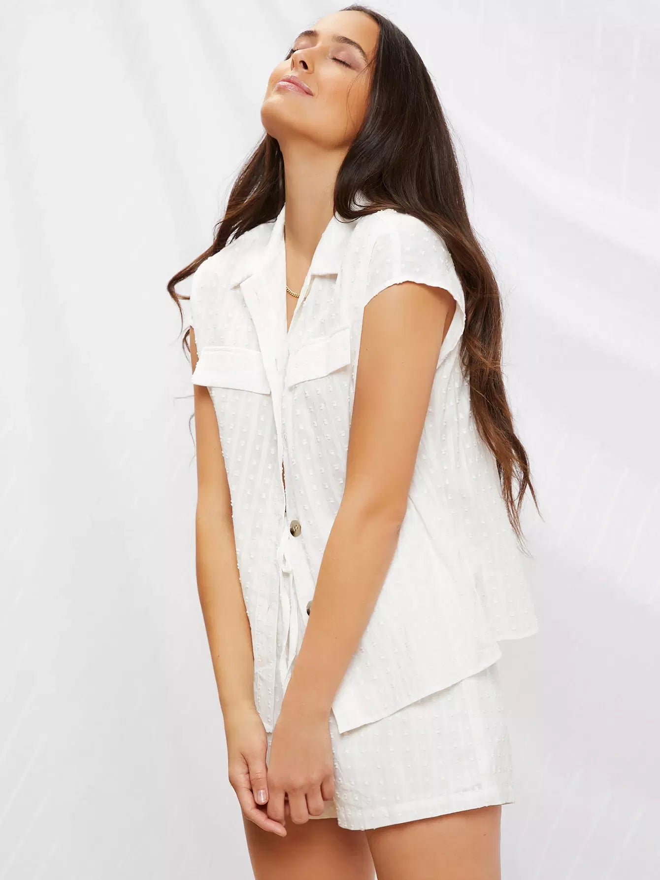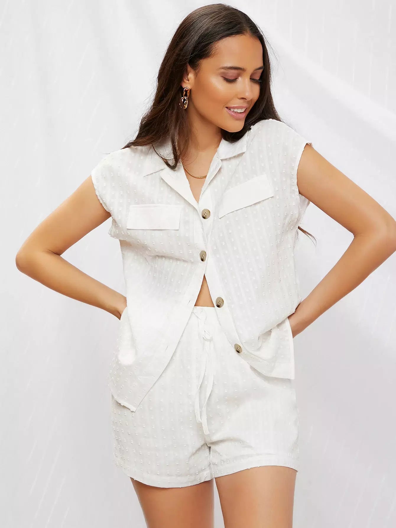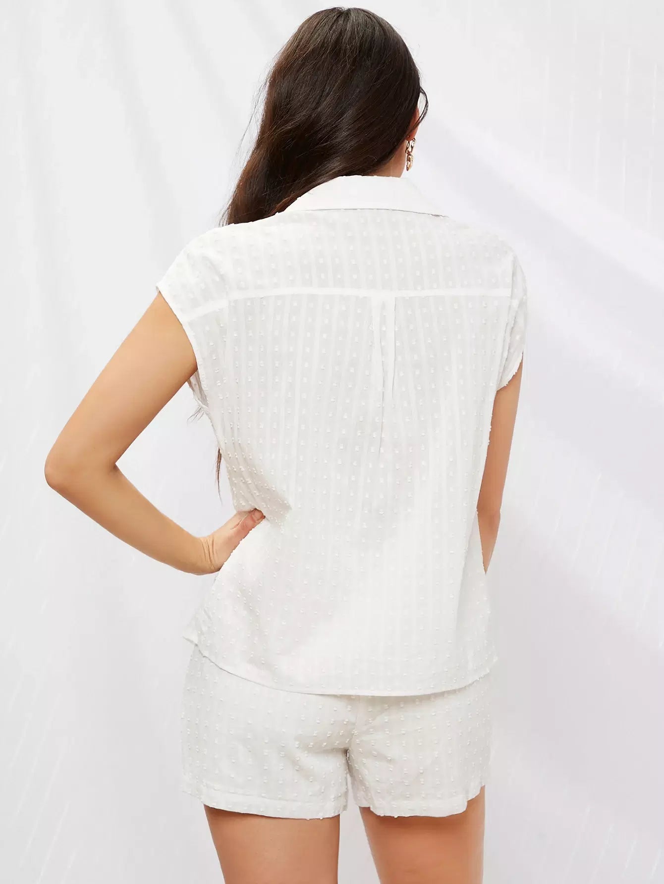 Notch Neck Flap Detail Swiss Dot Blouse & Shorts Set