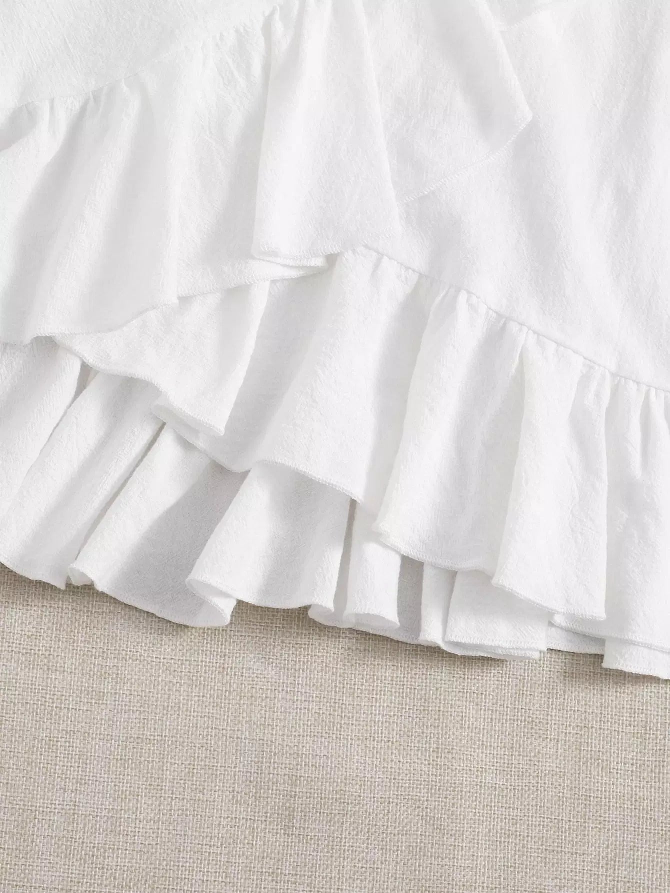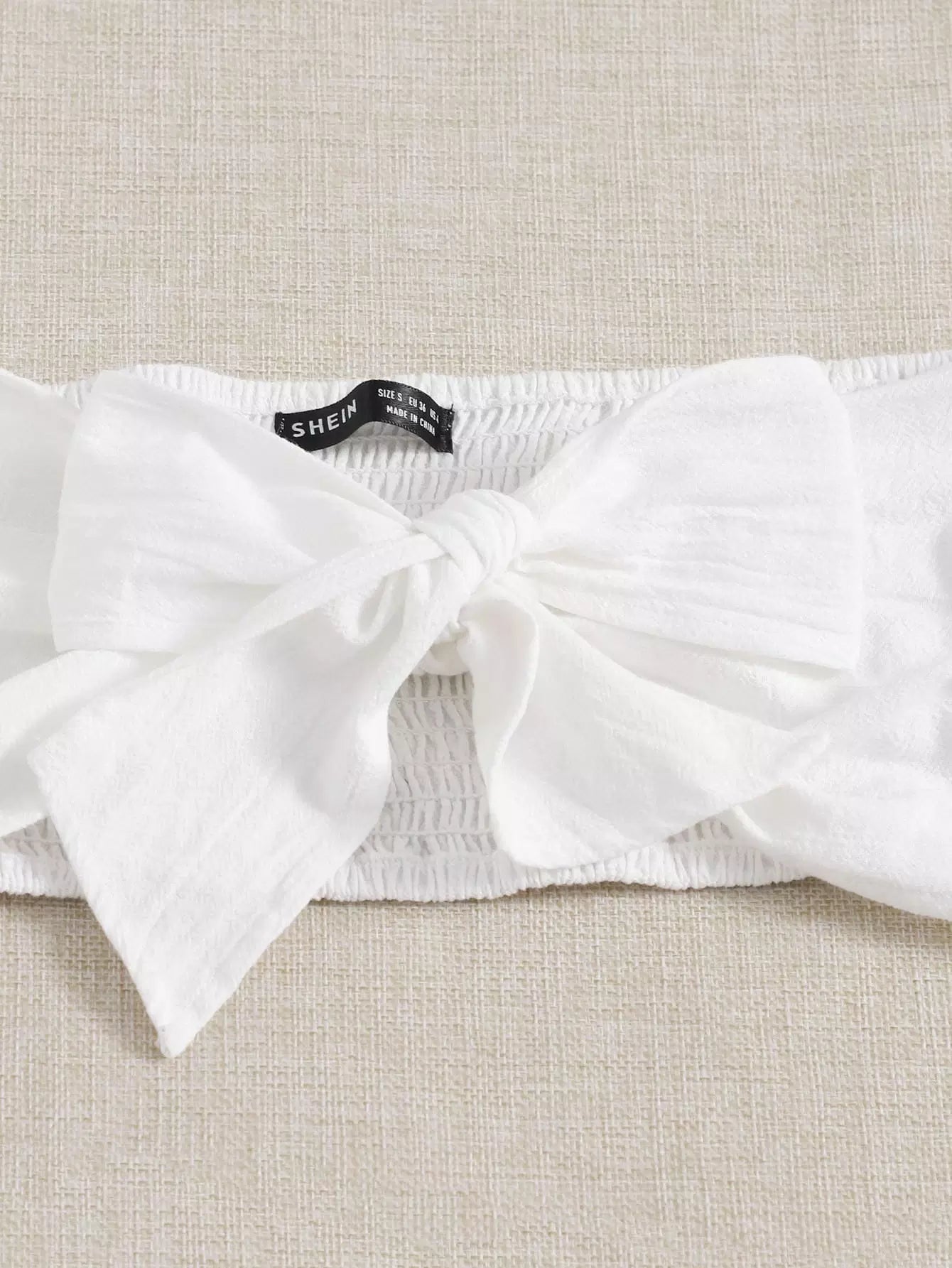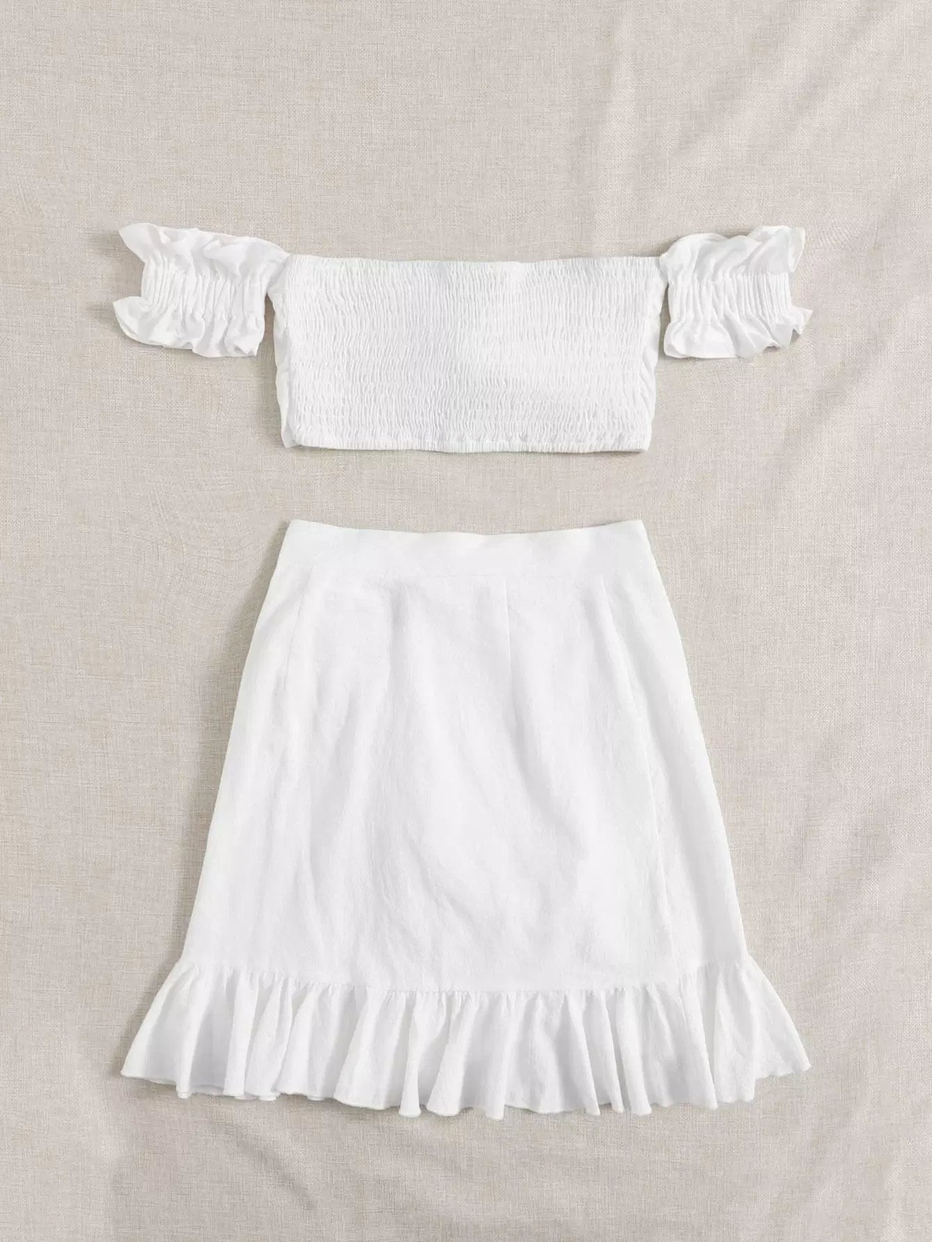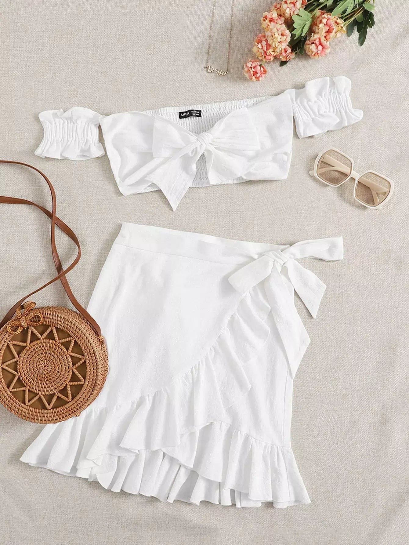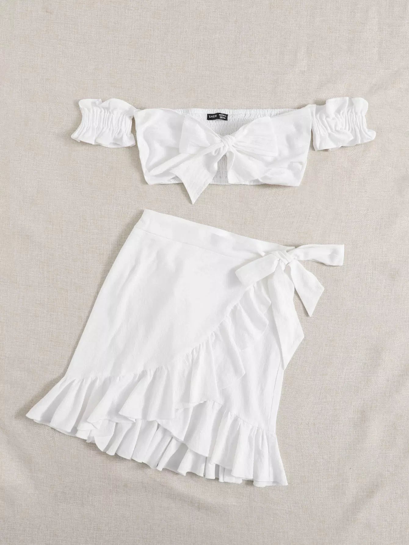 Off Shoulder Shirred Tie Front Top & Wrap Skirt Set