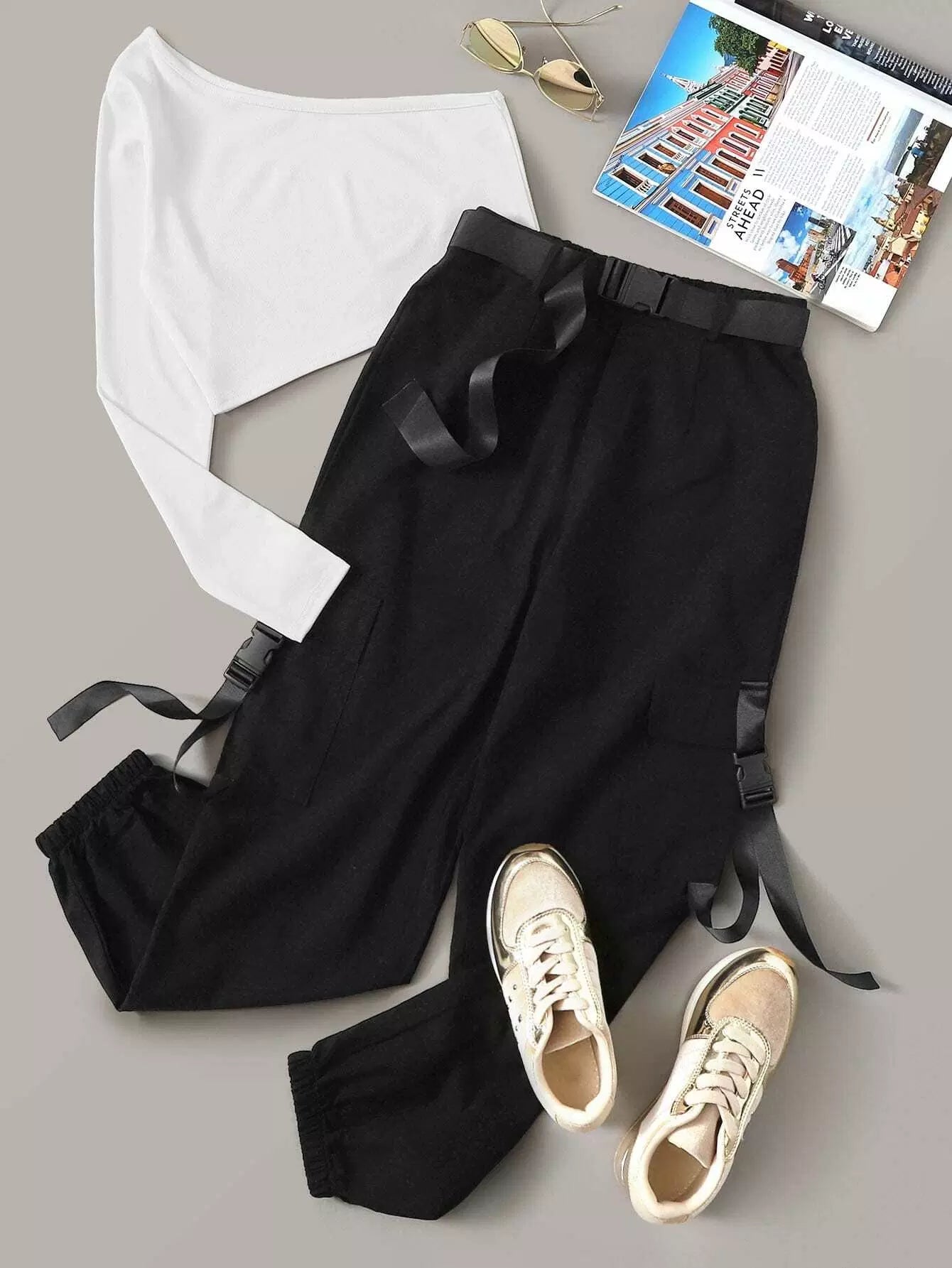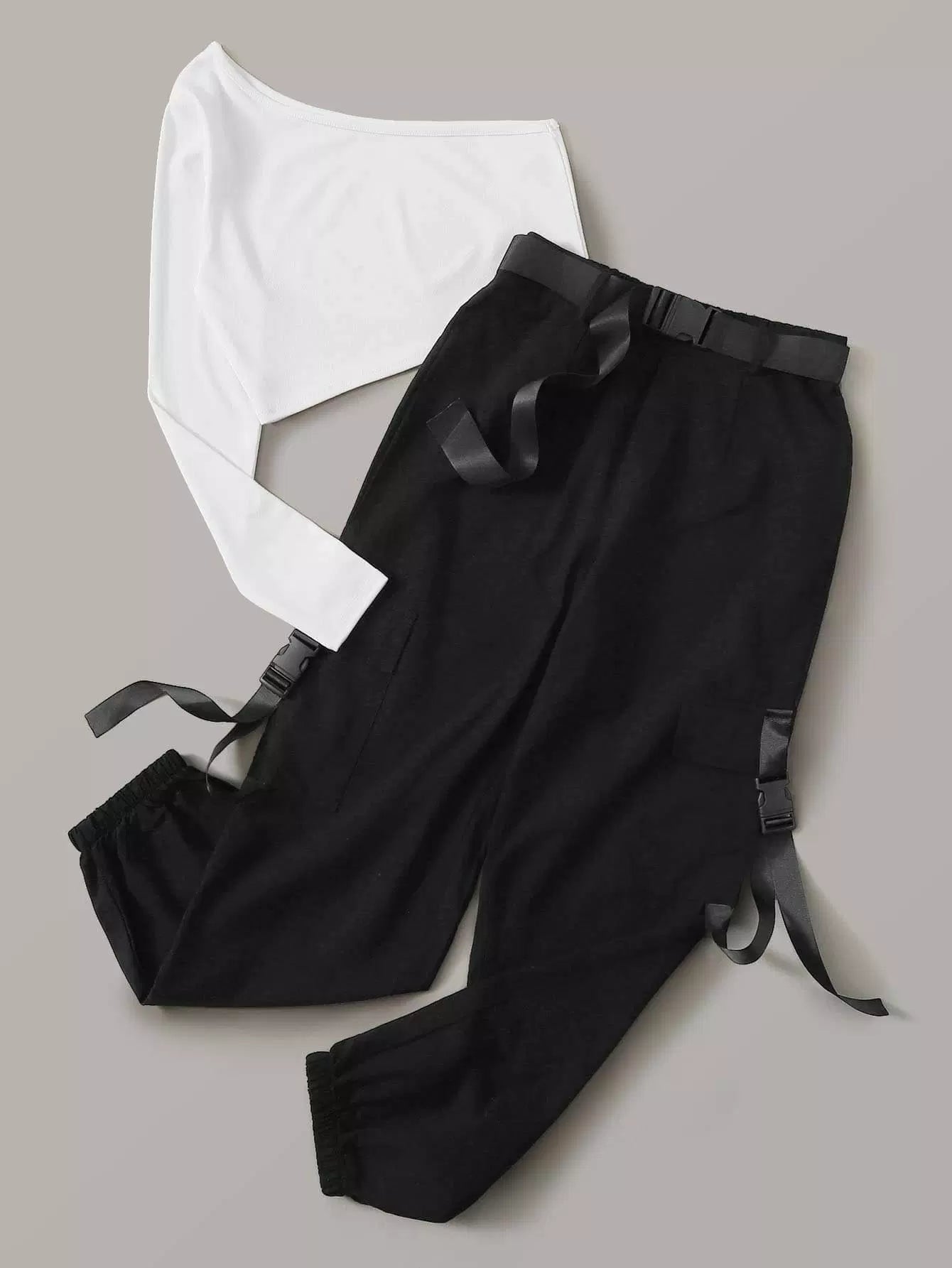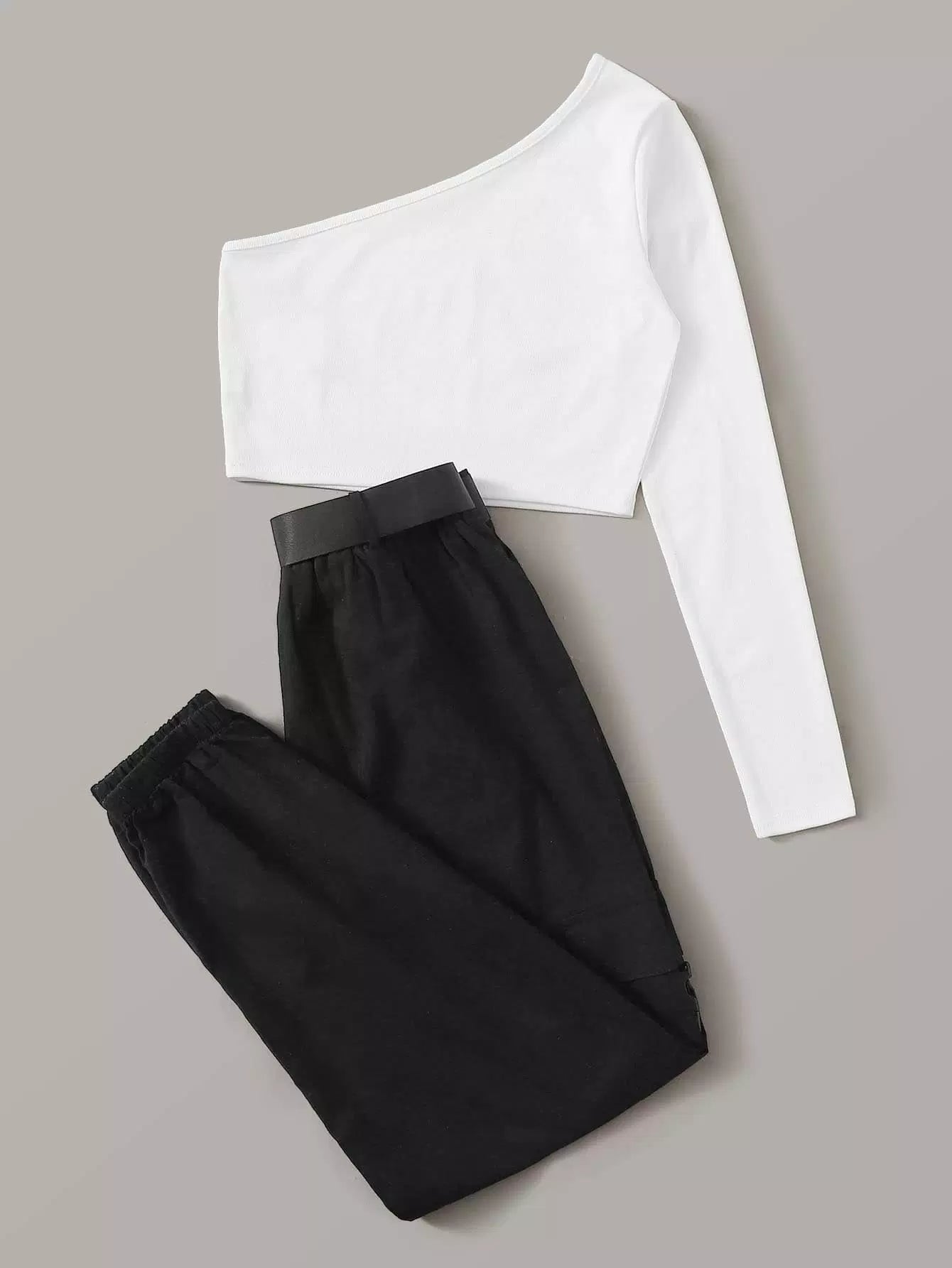 One-Shoulder Crop Top & Cargo Joggers Set Without Belt