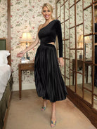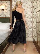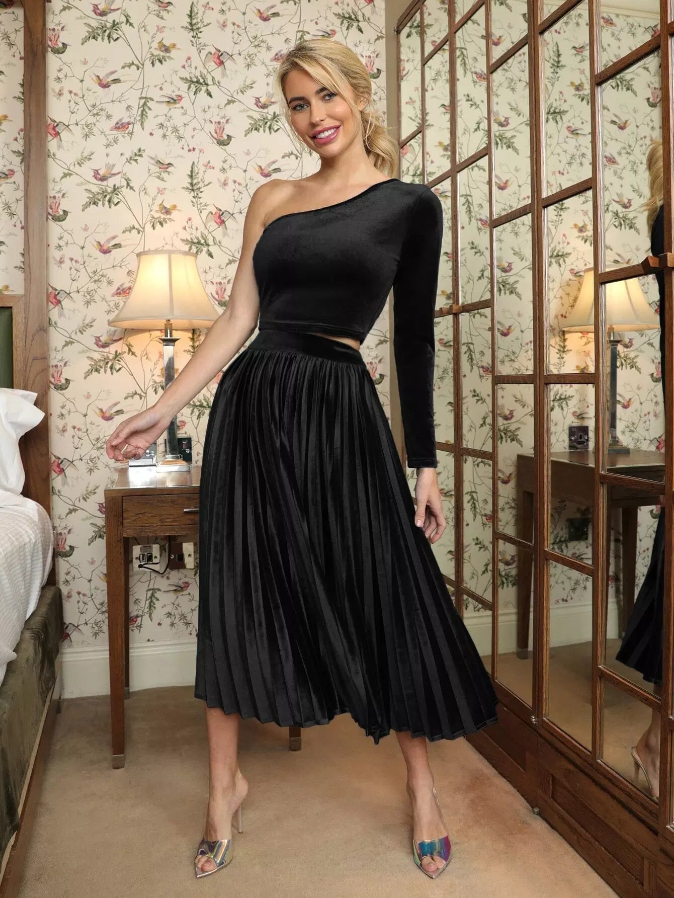 One Shoulder Crop Velvet Tee and Pleated Skirt Set