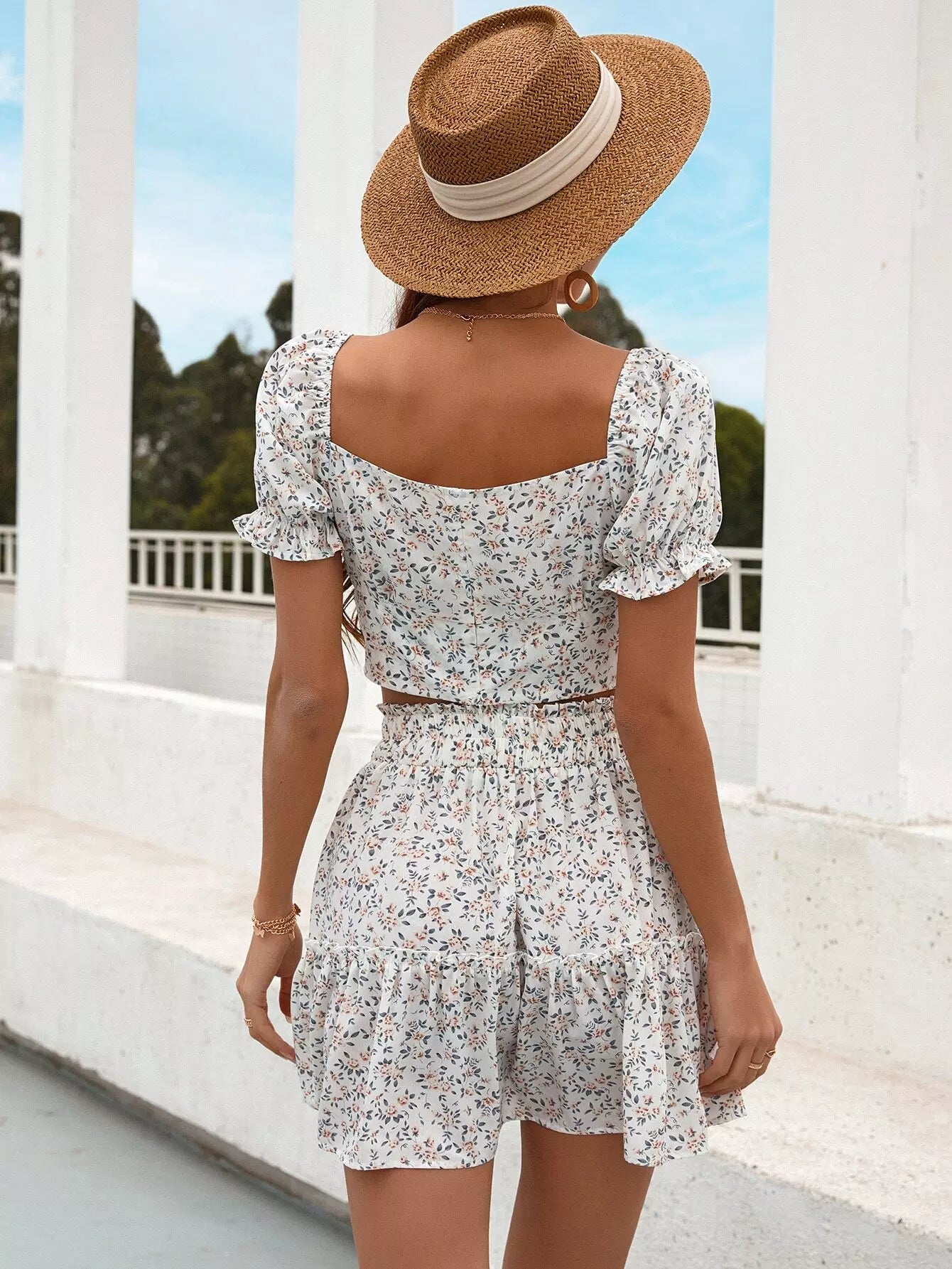 Puff Sleeve Ditsy Floral Crop Top & Ruffle Hem Skirt Set