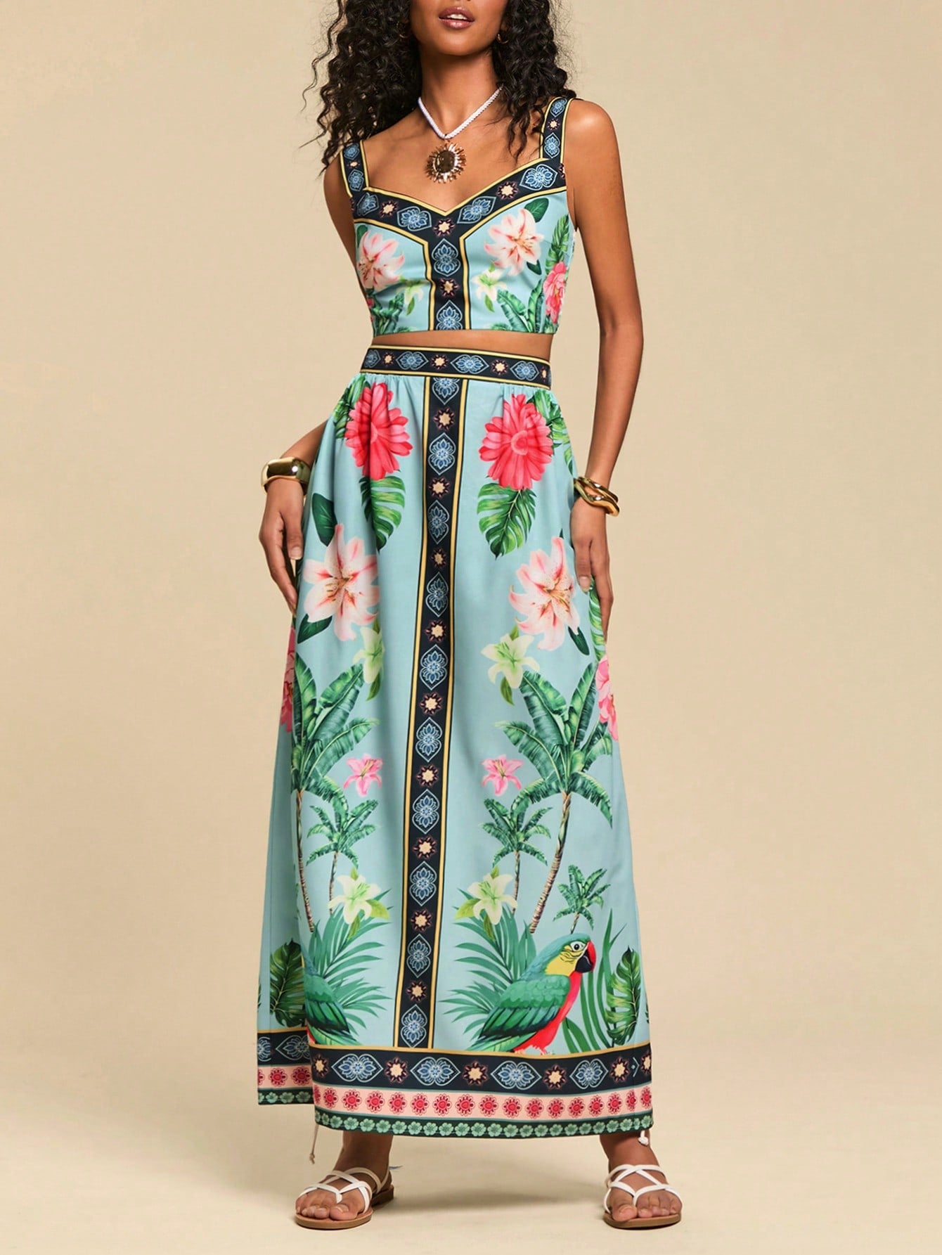 Travachic 2pcs/Set Women Woven Printed Cropped Camisole Top & High Waist Skirt,Summer Outfits For Women,Beachwear,Easter,Beach
