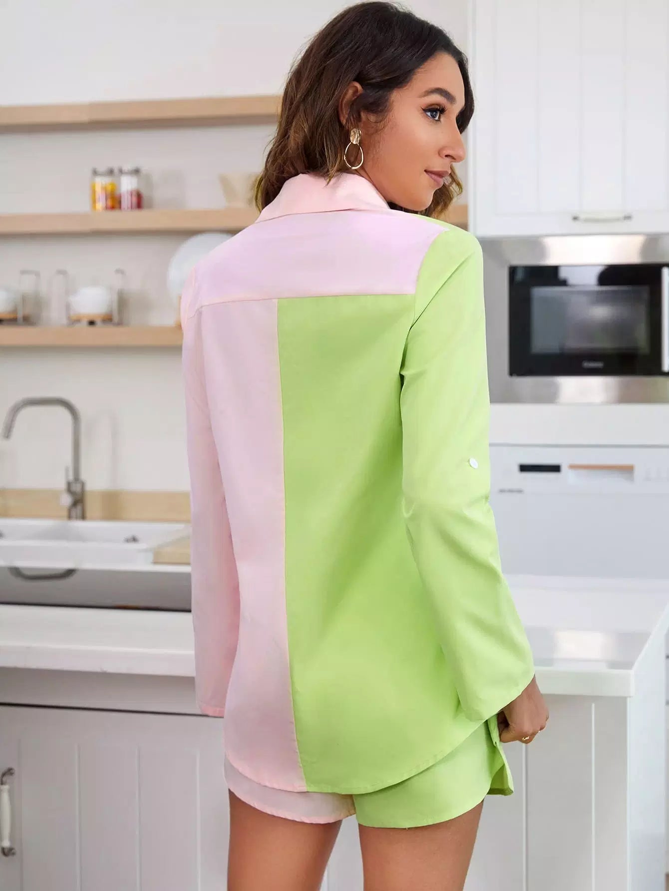 Two Tone Roll Tab Sleeve Blouse & Shorts