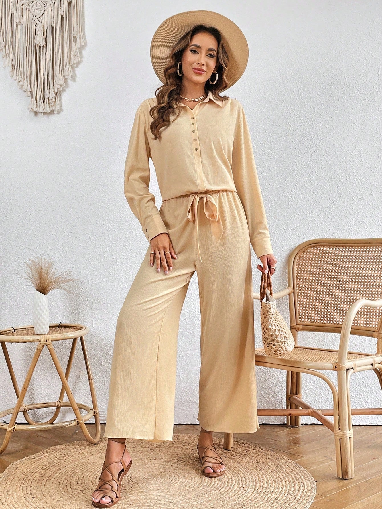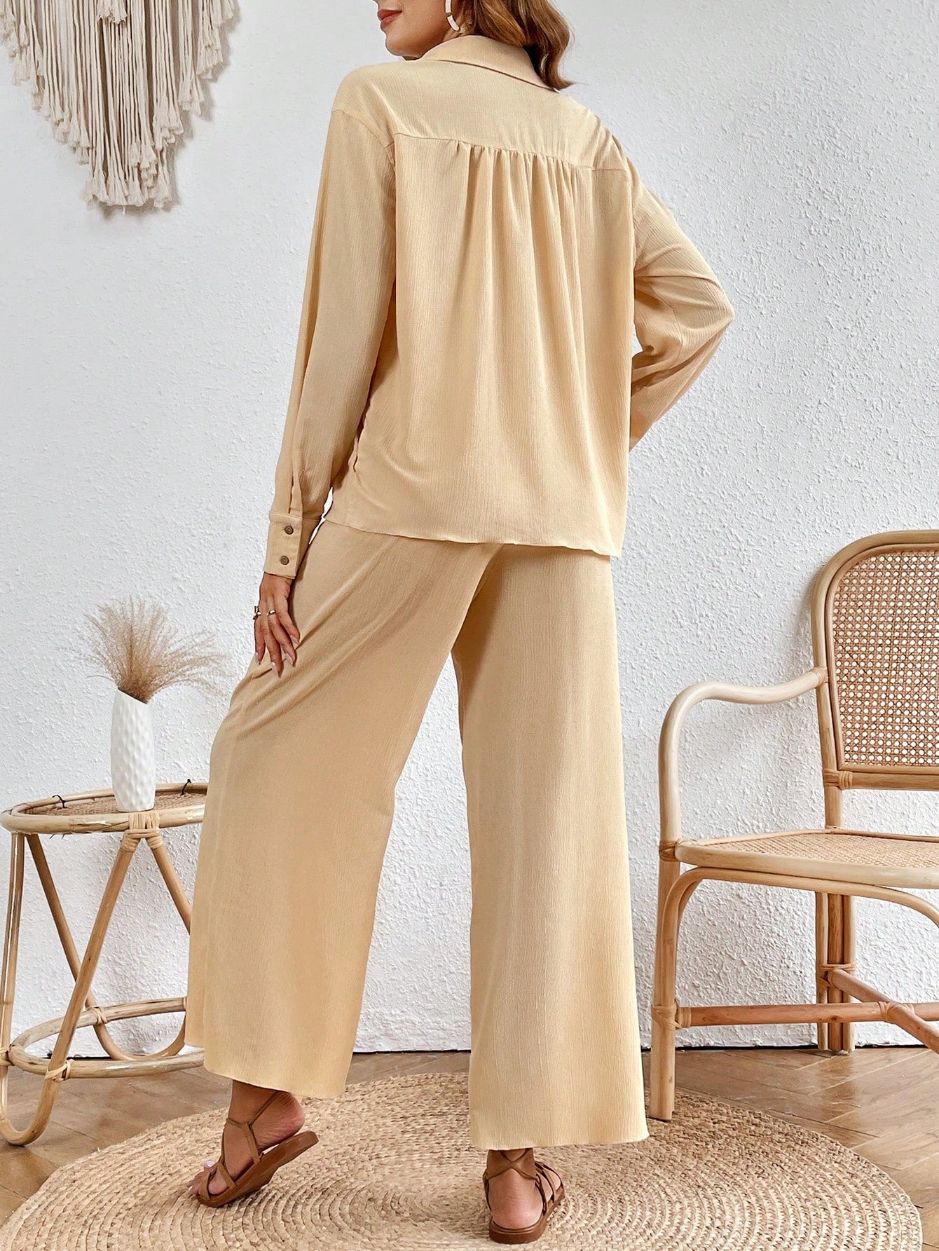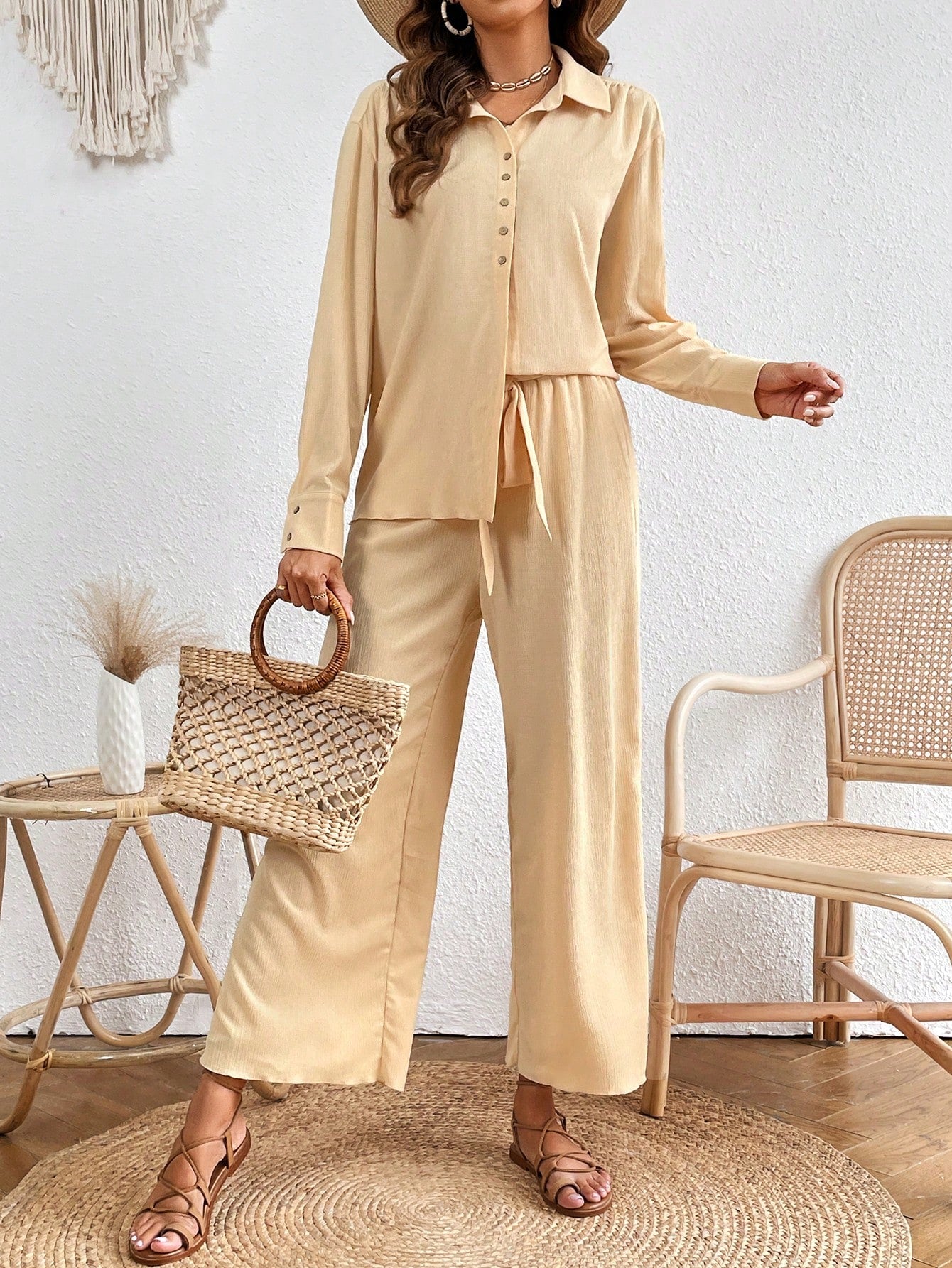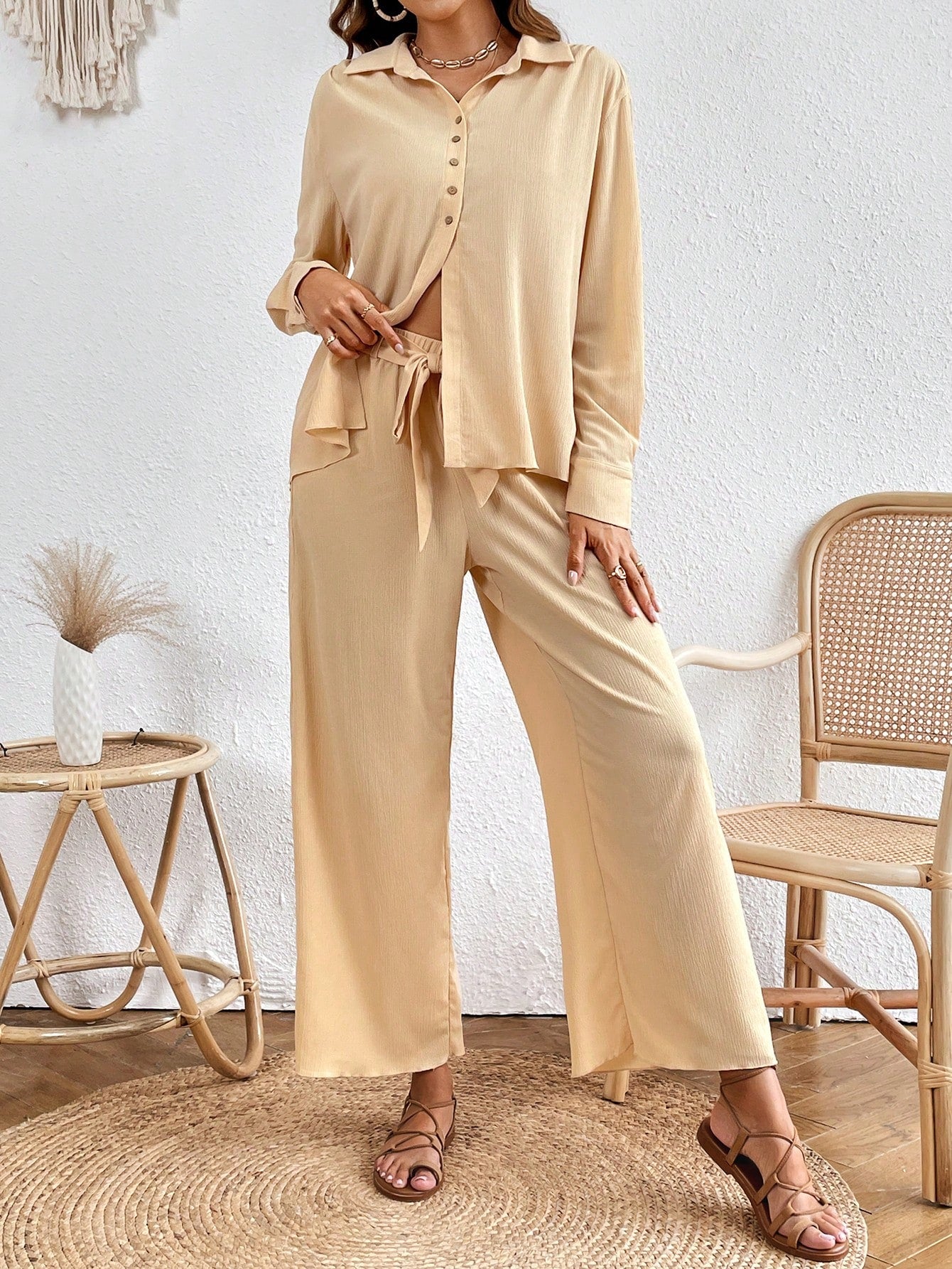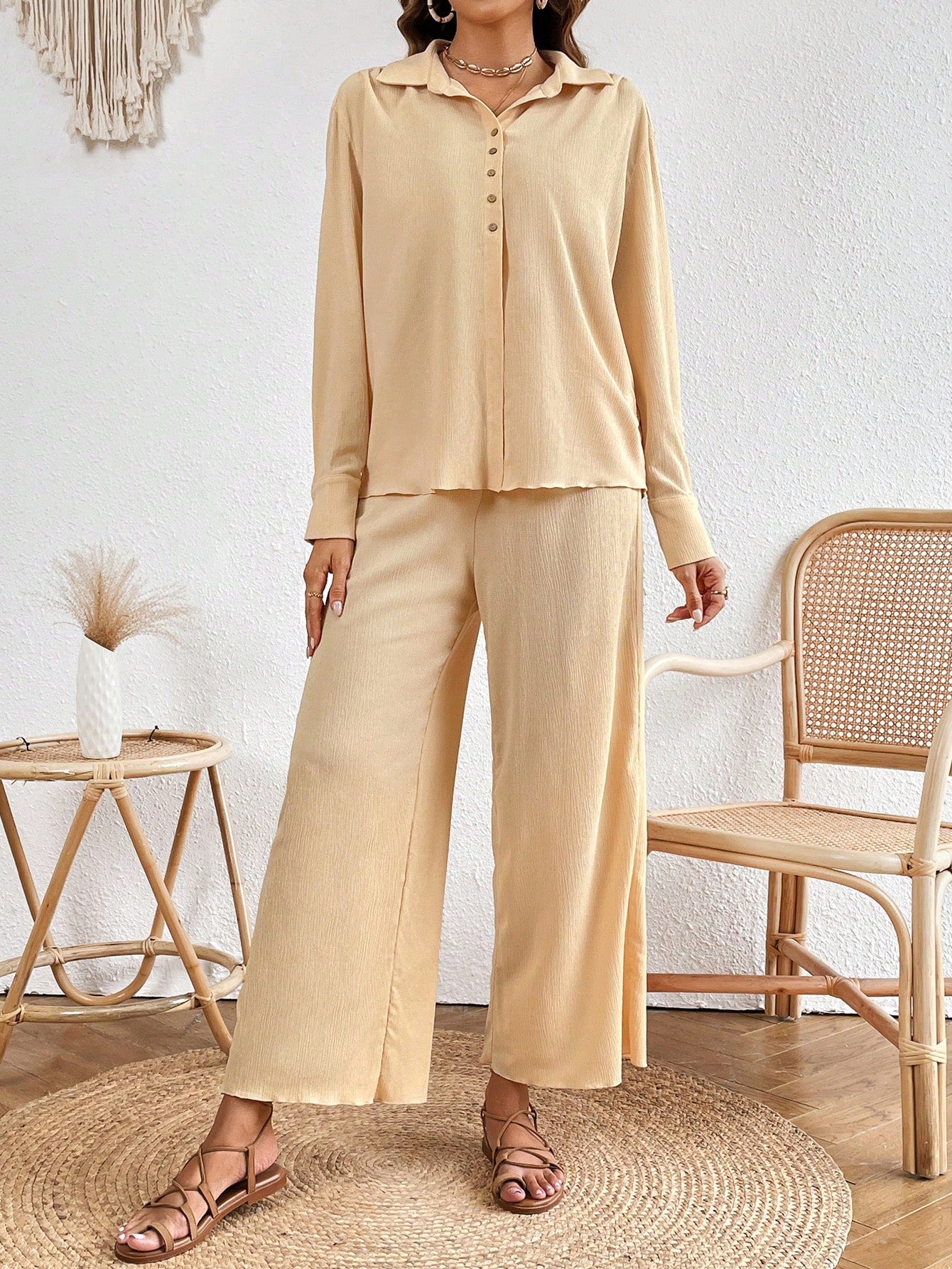VCAY Solid Button Front Shirt & Wide Leg Pants