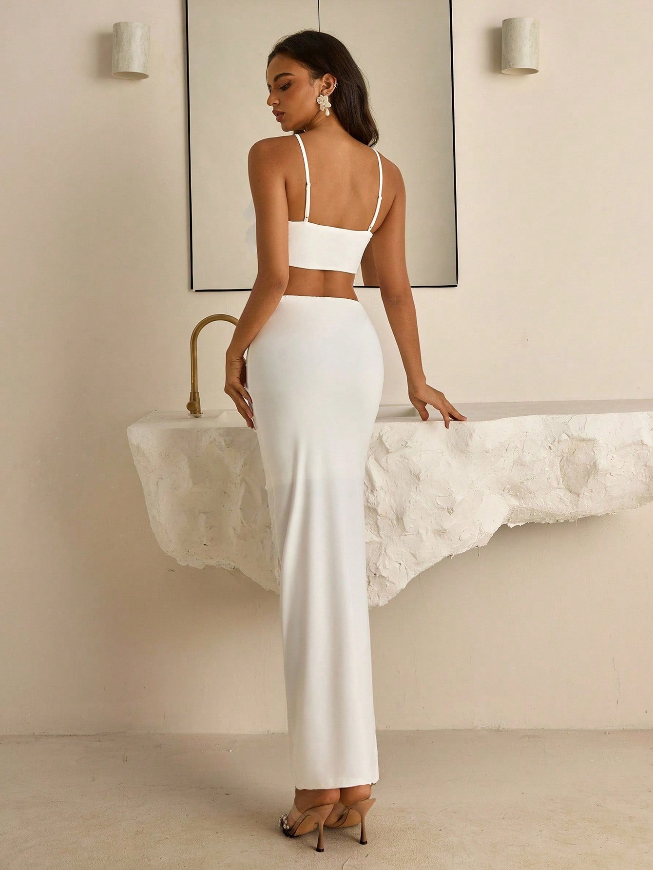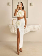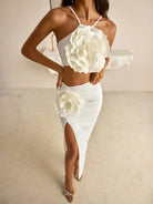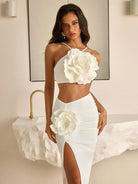 Vowa Elegant White Knitted 2 Pieces Set - Halter Neckline With 3D Flower
