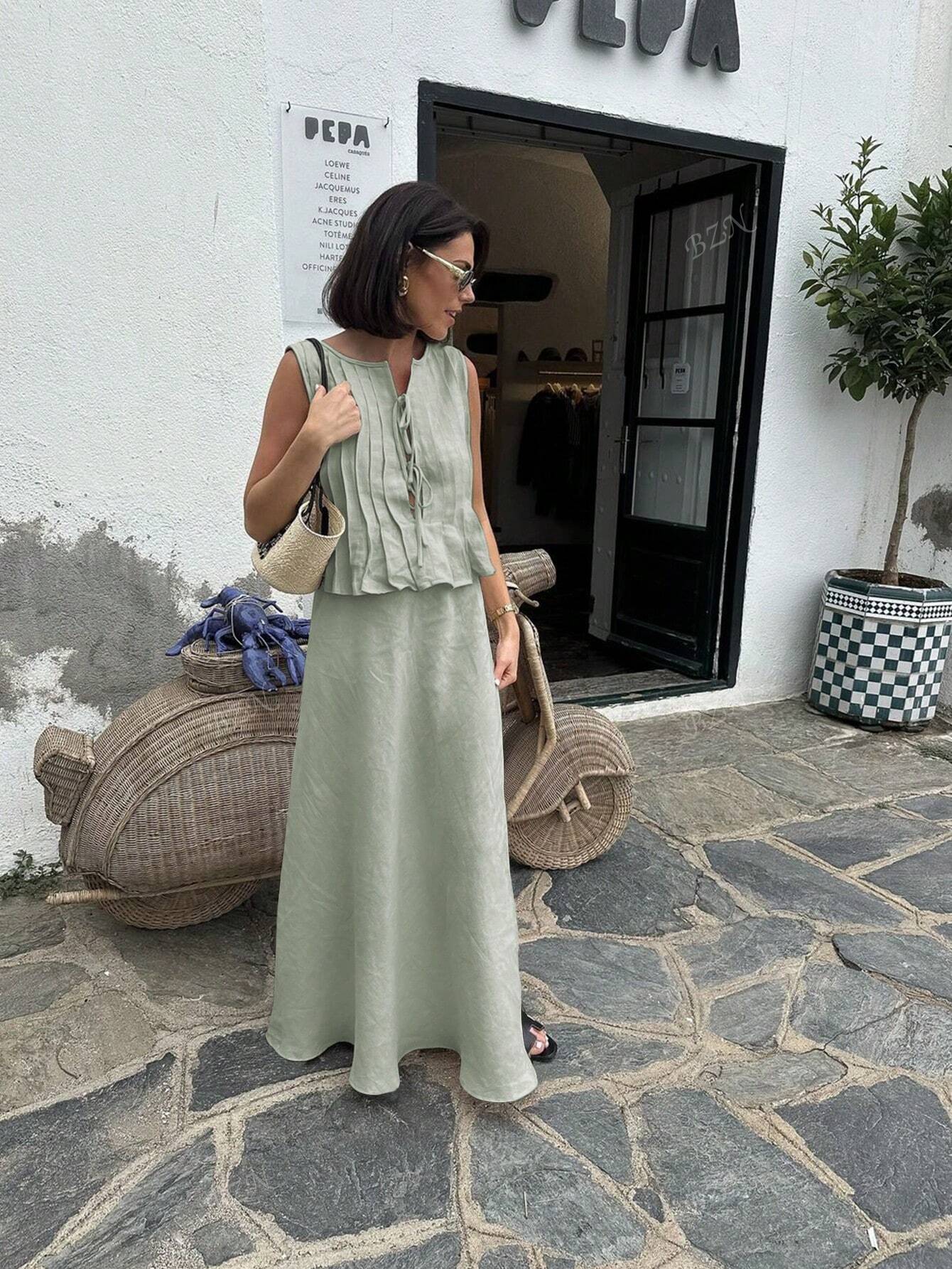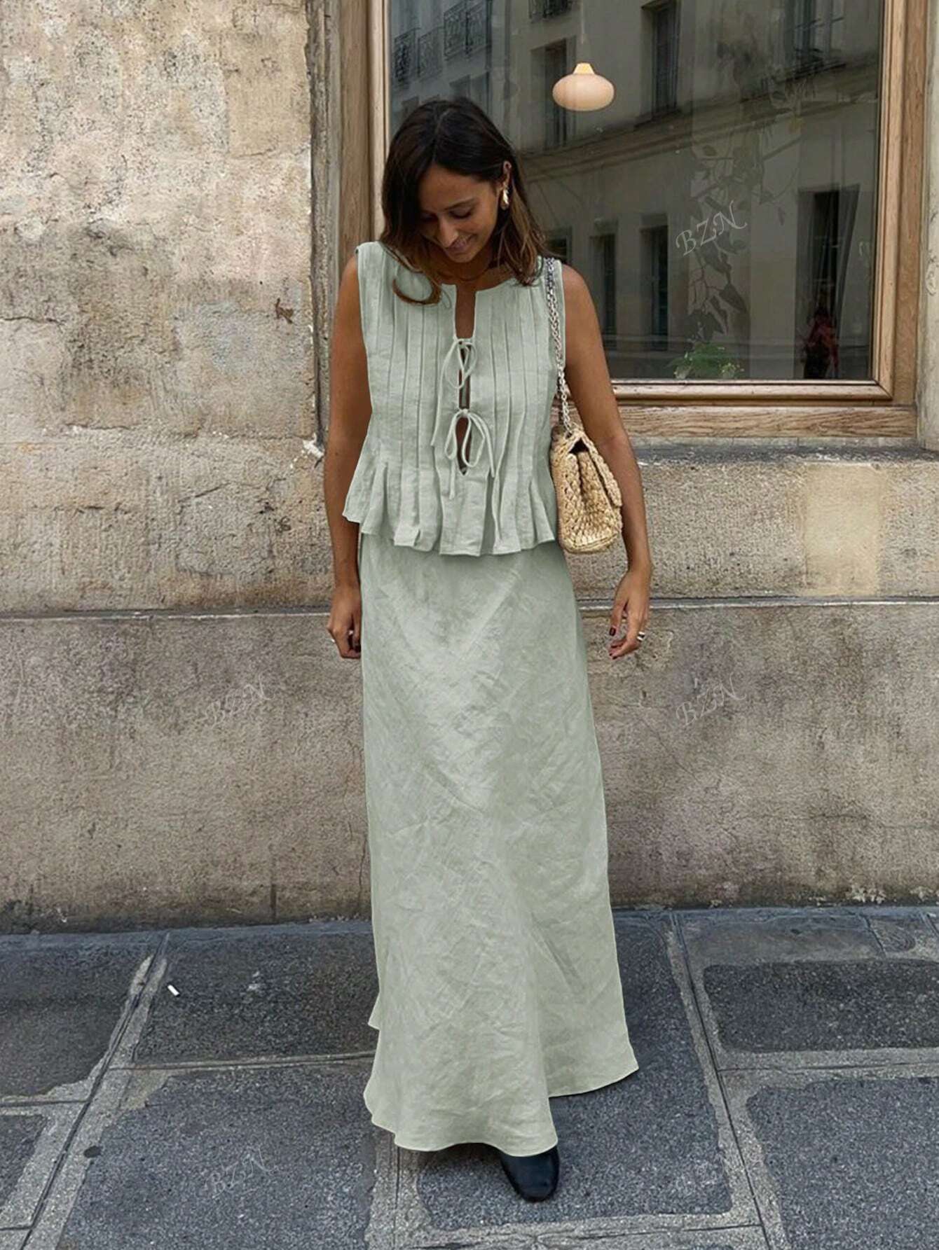 Women's Sleeveless Crew Neck Casual Pleated Tie-Up Crop Top And Low Waist Mermaid Maxi Skirt 2 Pieces