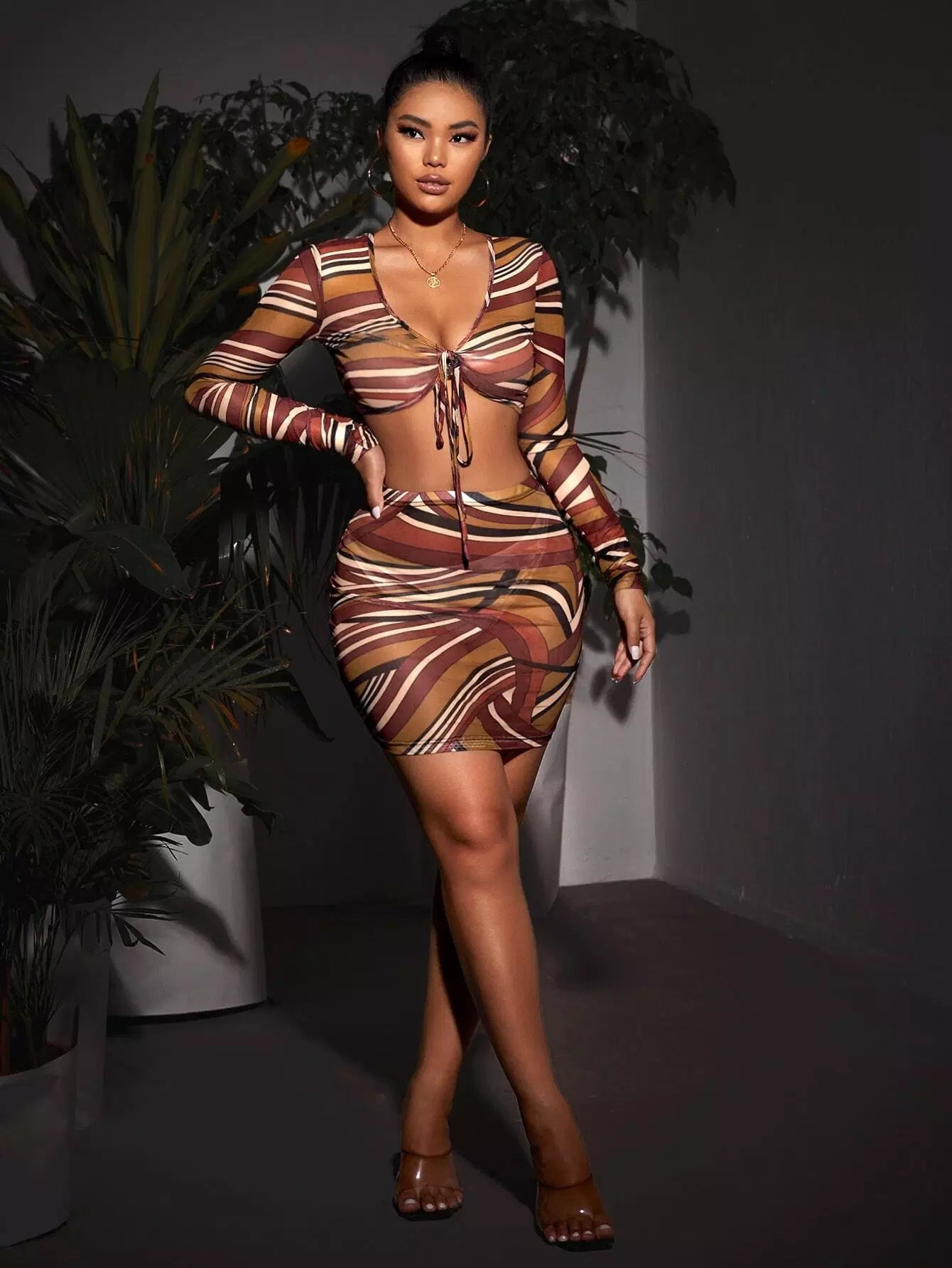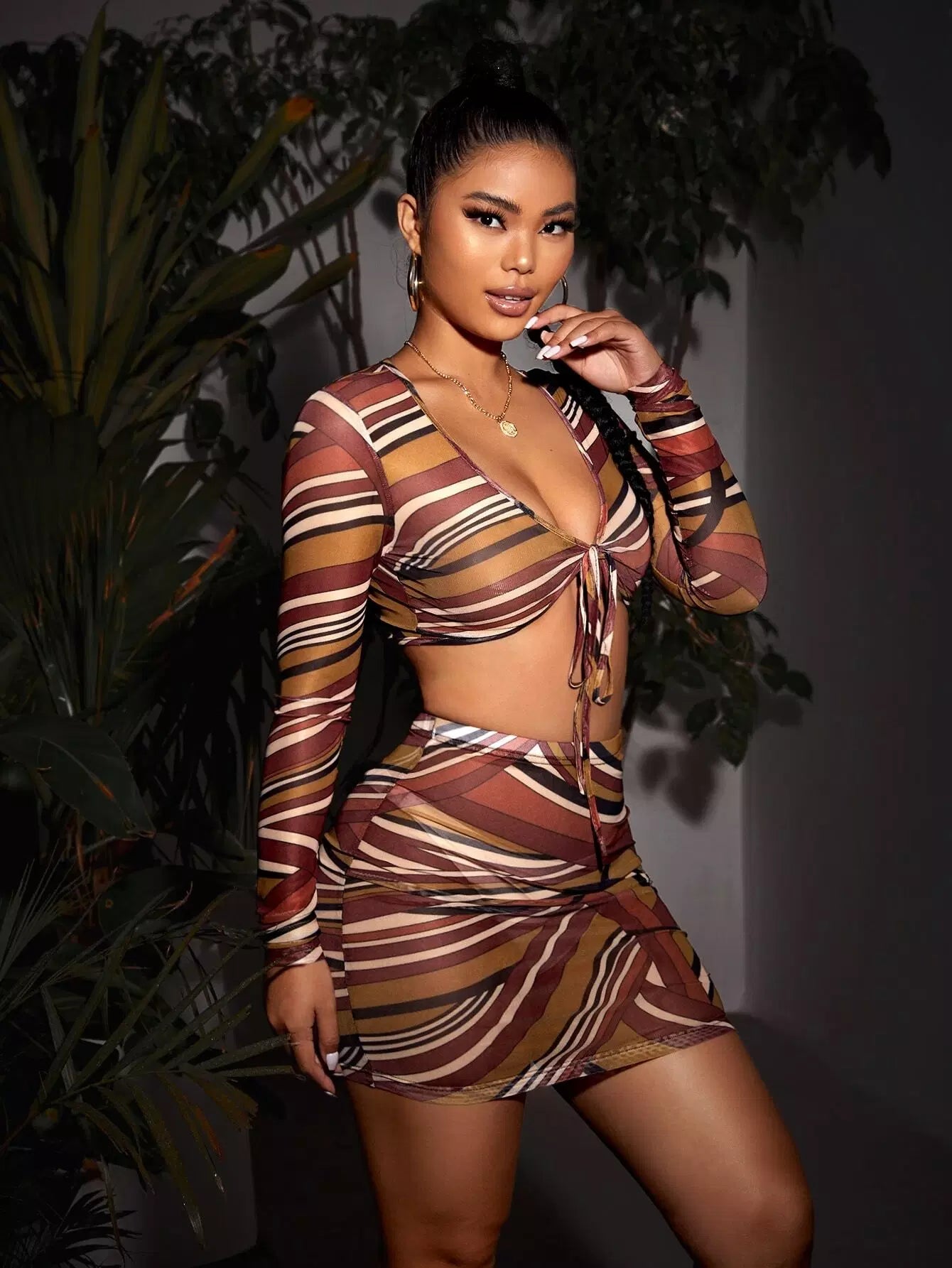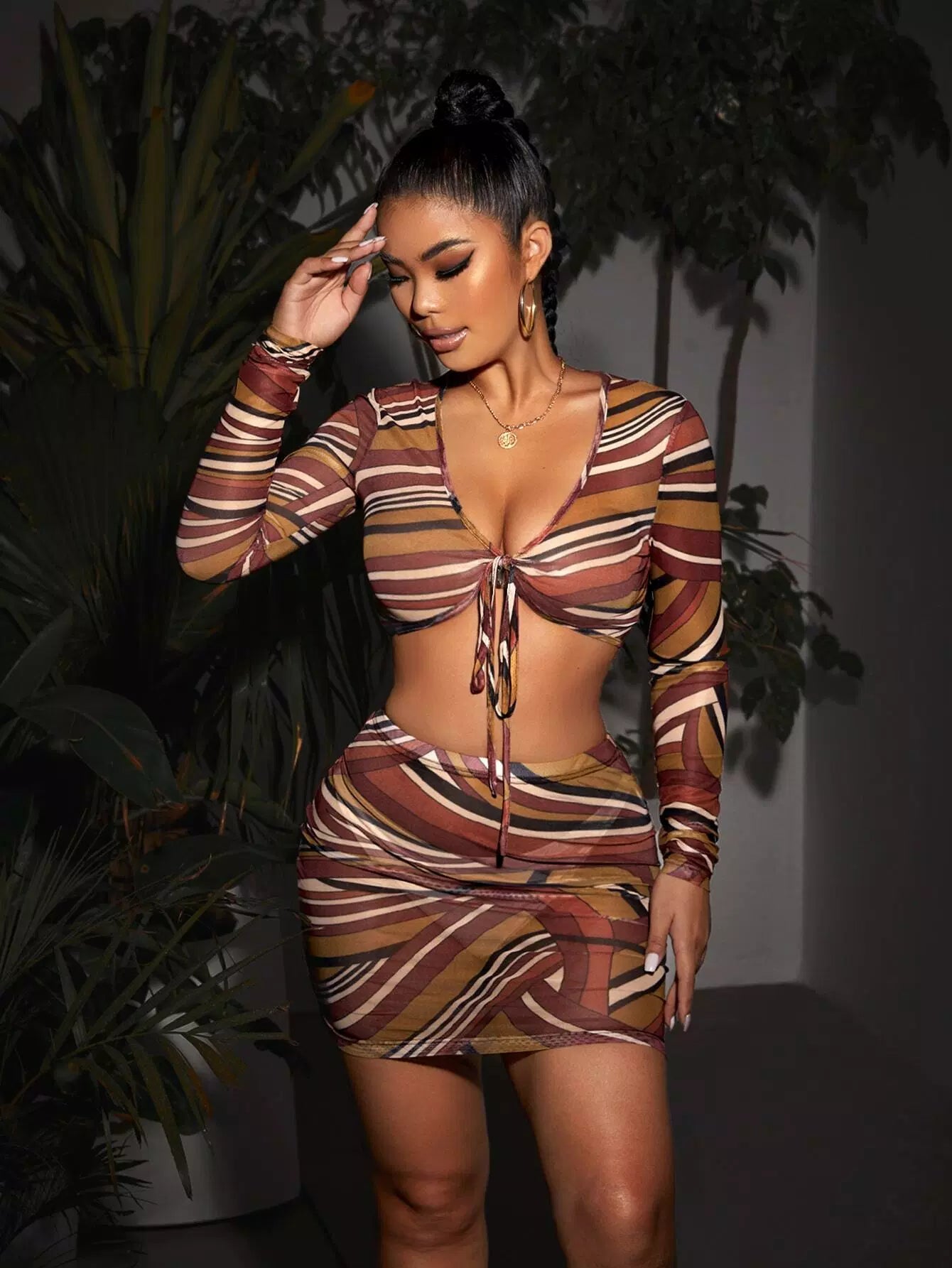 Block Striped Knot Front Crop Top & Bodycon Skirt Without Panty