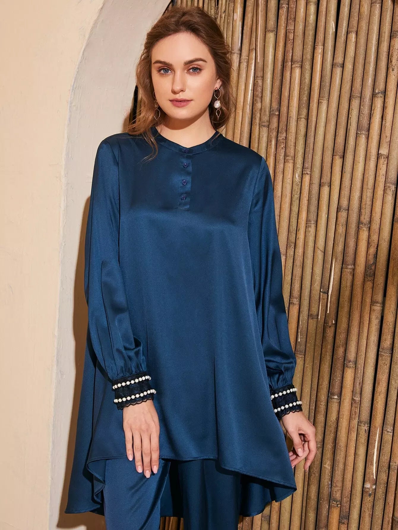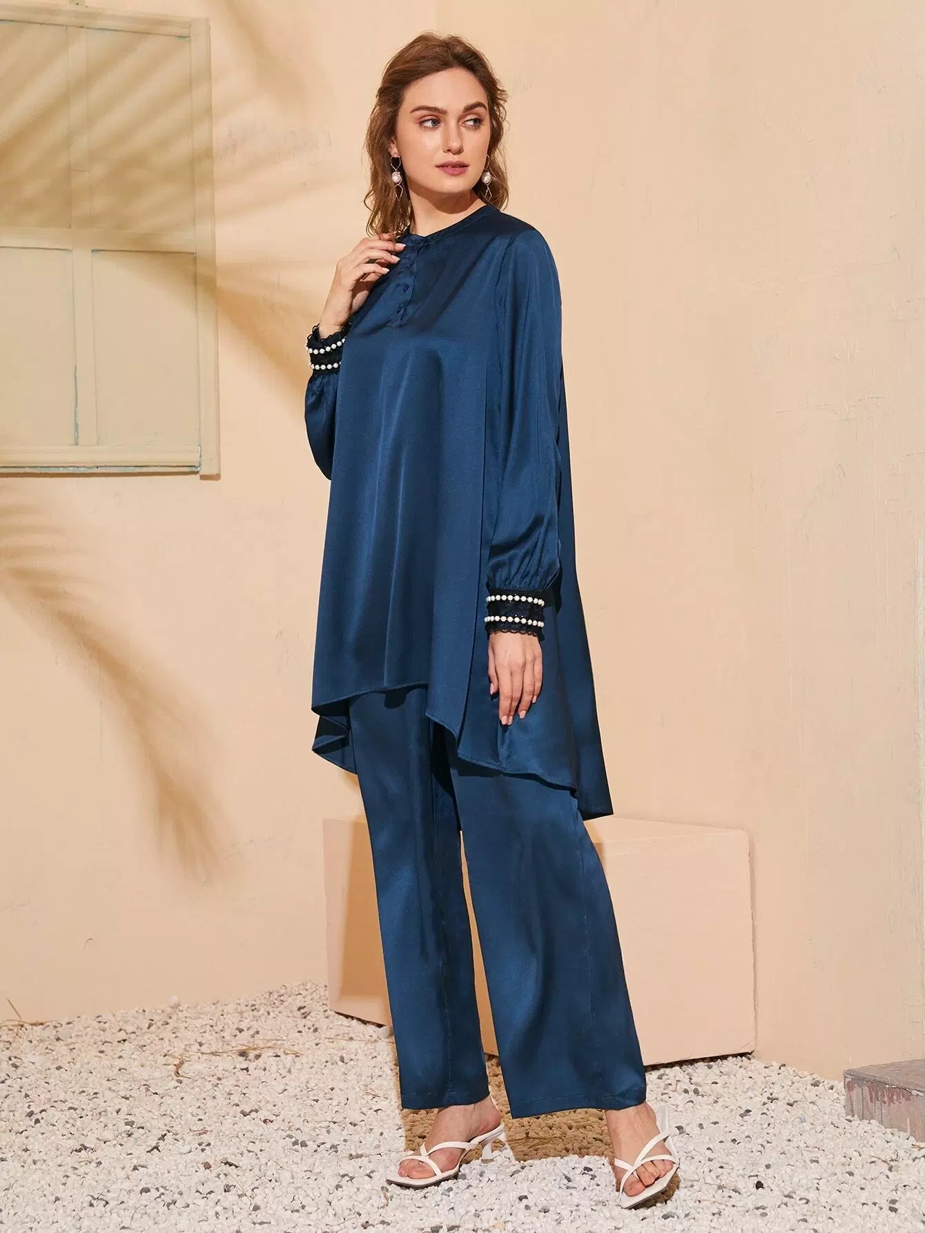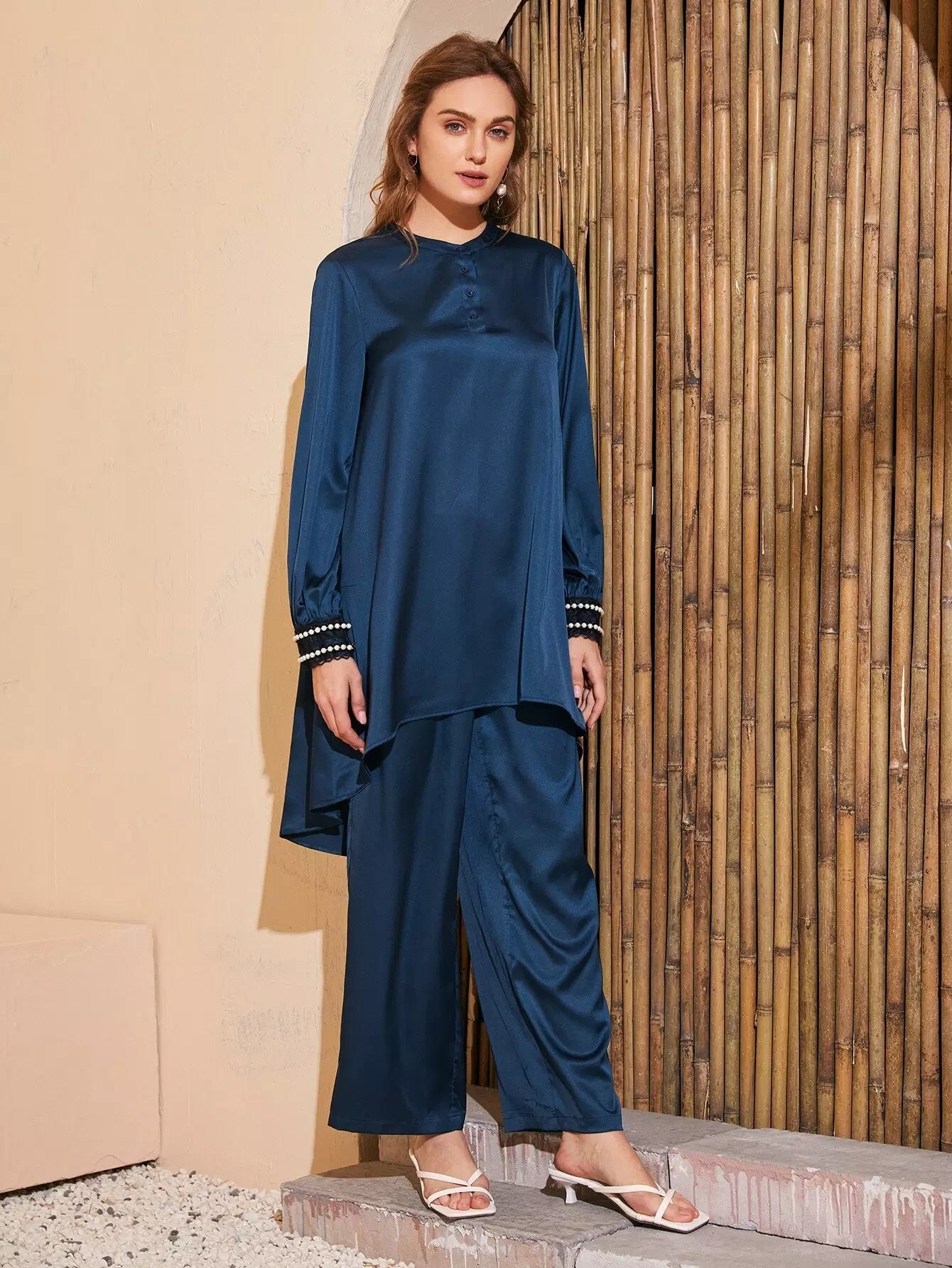 Buttoned Front Beaded Cuff Dip Hem Satin Top & Pants Set