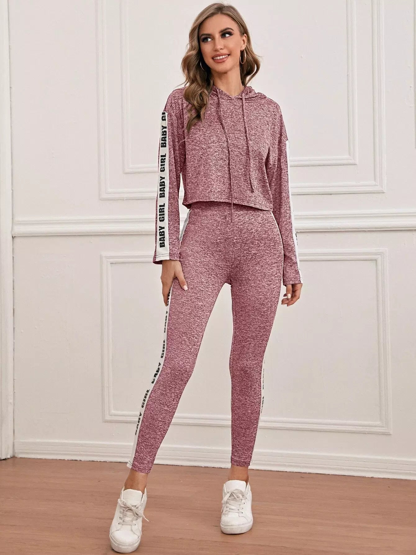 Contrast Letter Side Seam Marled Hoodie and Leggings Set