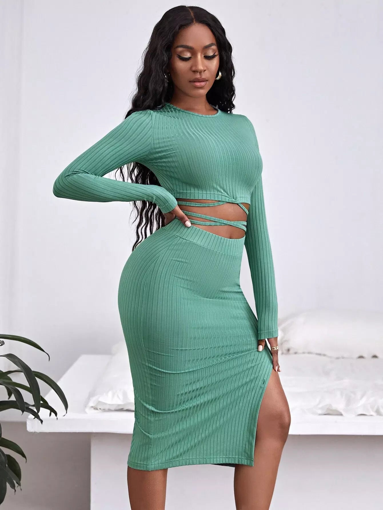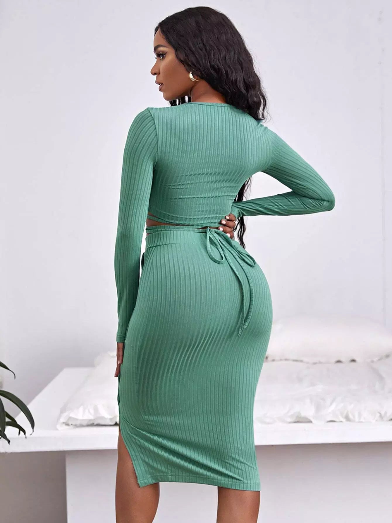 Crisscross Tie Back Ribbed Crop Top & Pencil Skirt