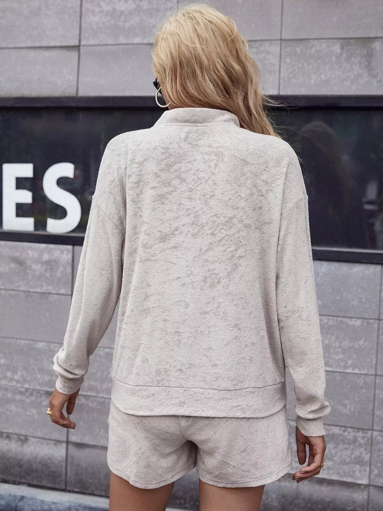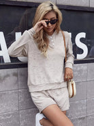 Drop Shoulder Button Detail Velvet Sweatshirt & Drawstring Waist Shorts