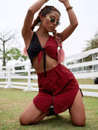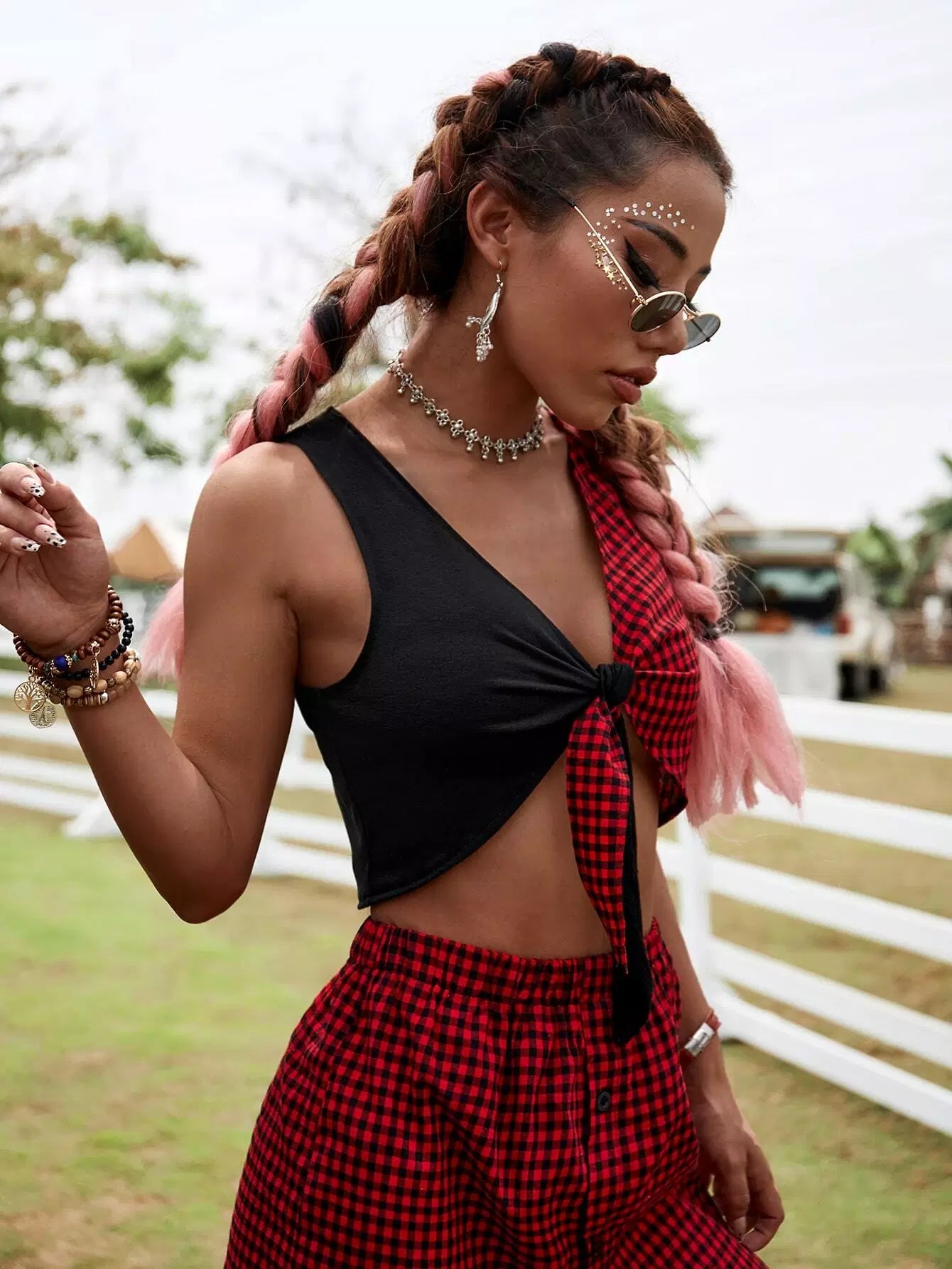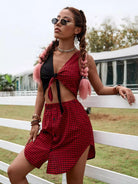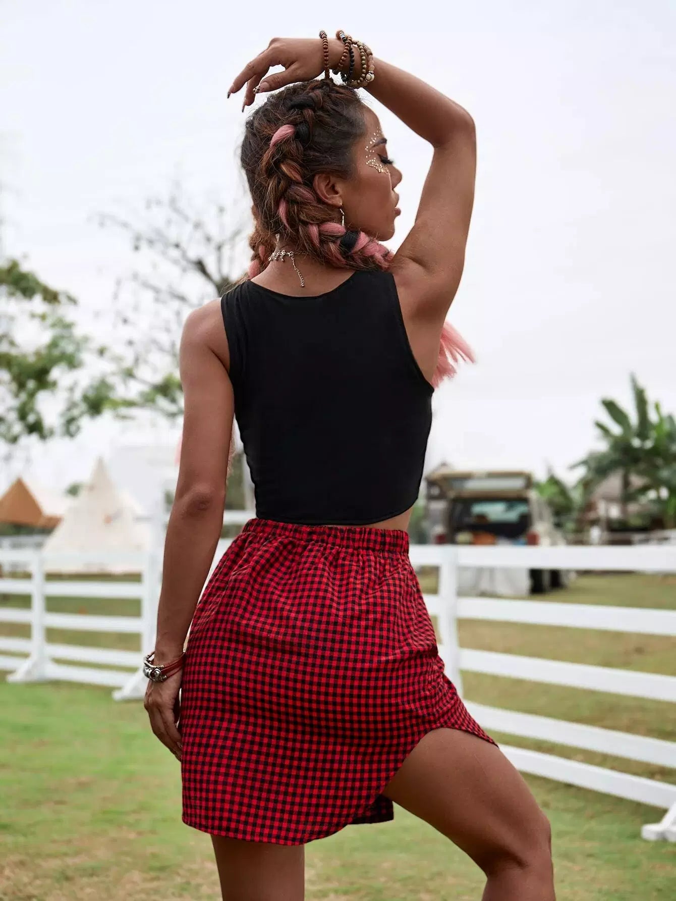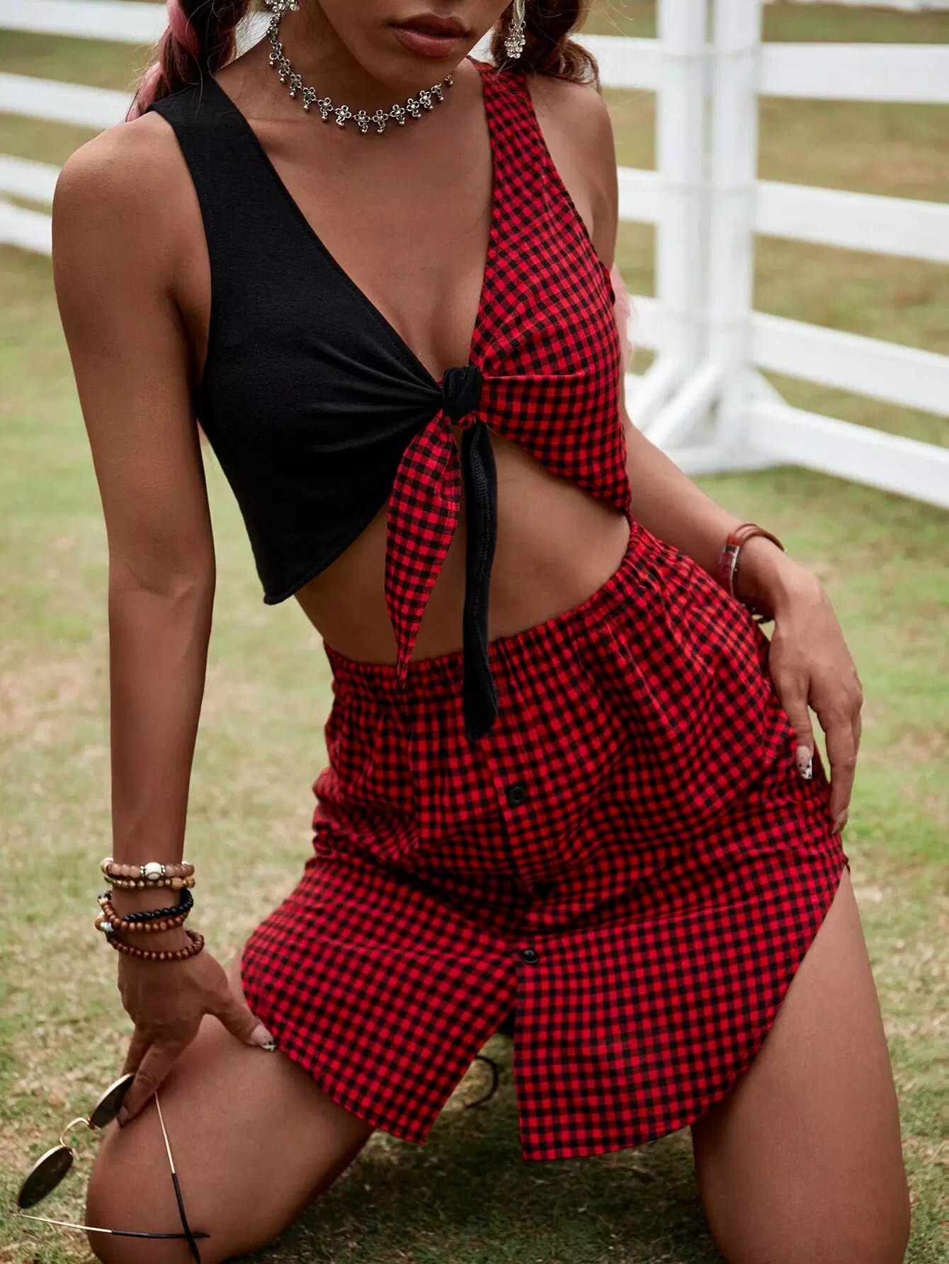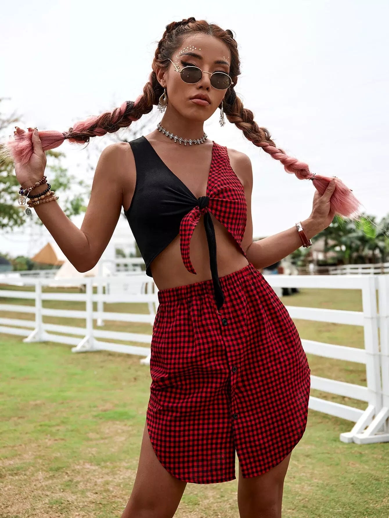 Gingham Print Knot Front Crop Top With Button Front Skirt