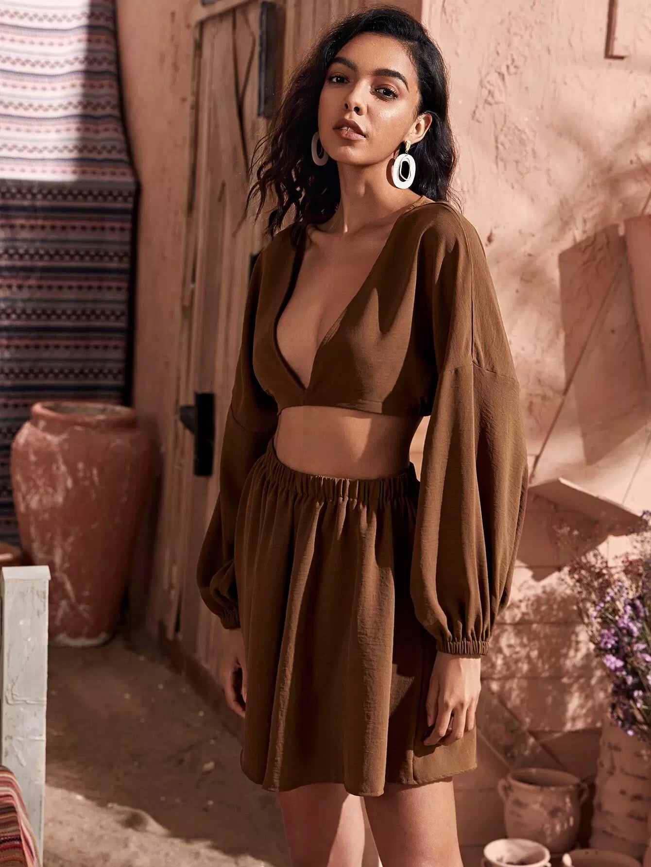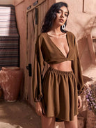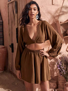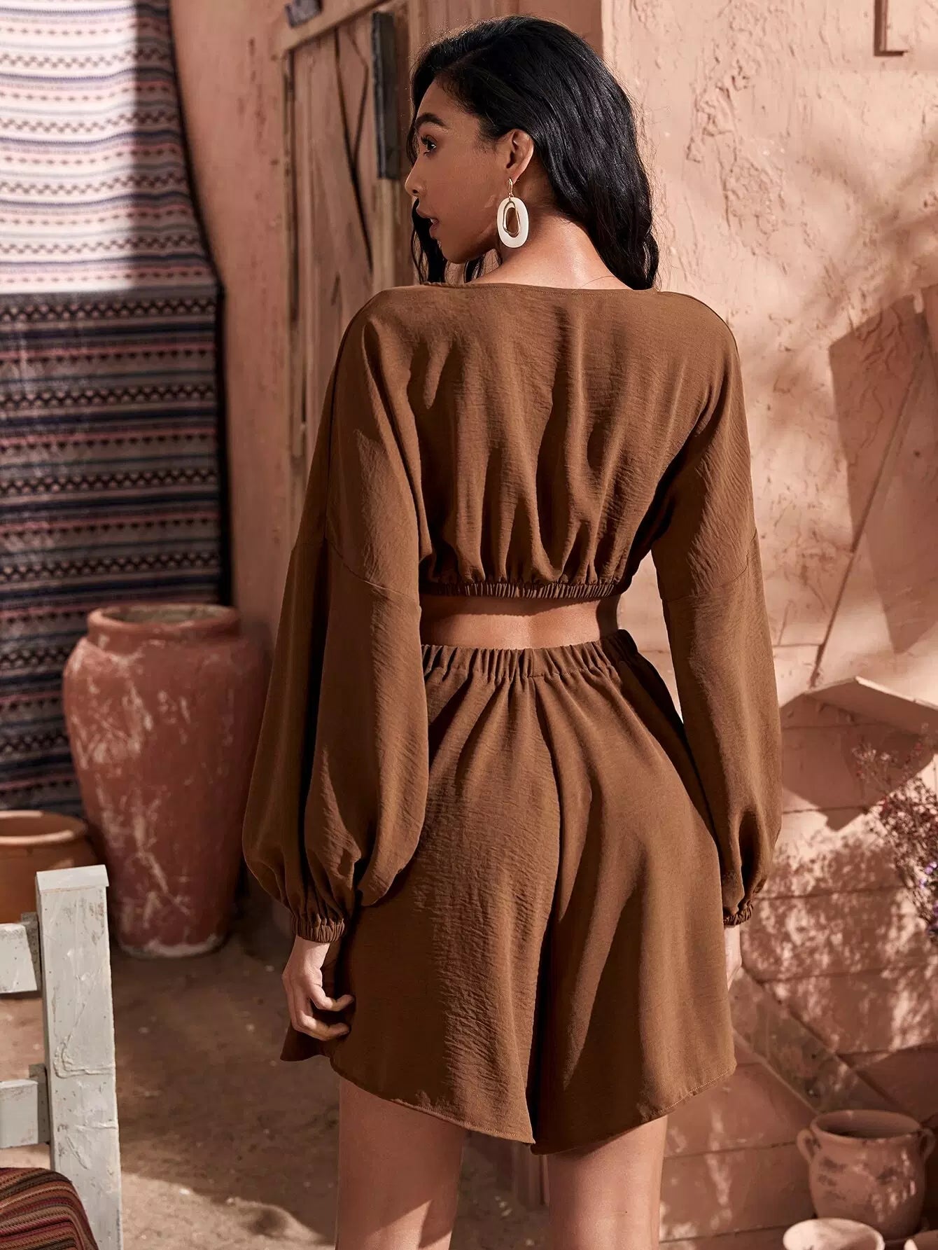 Plunging Neck Bishop Sleeve Top & Wide Leg Shorts Set