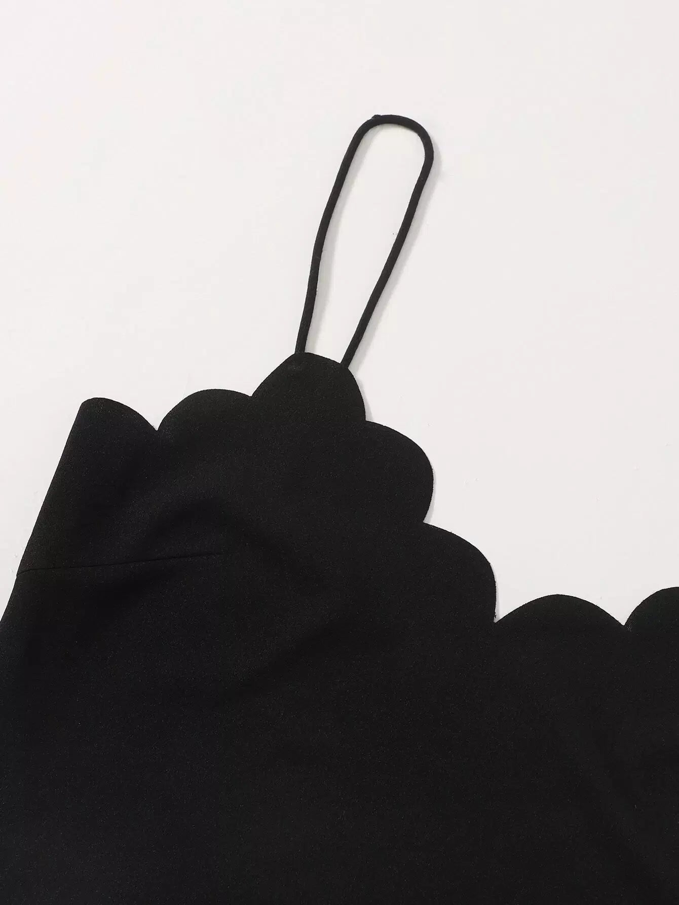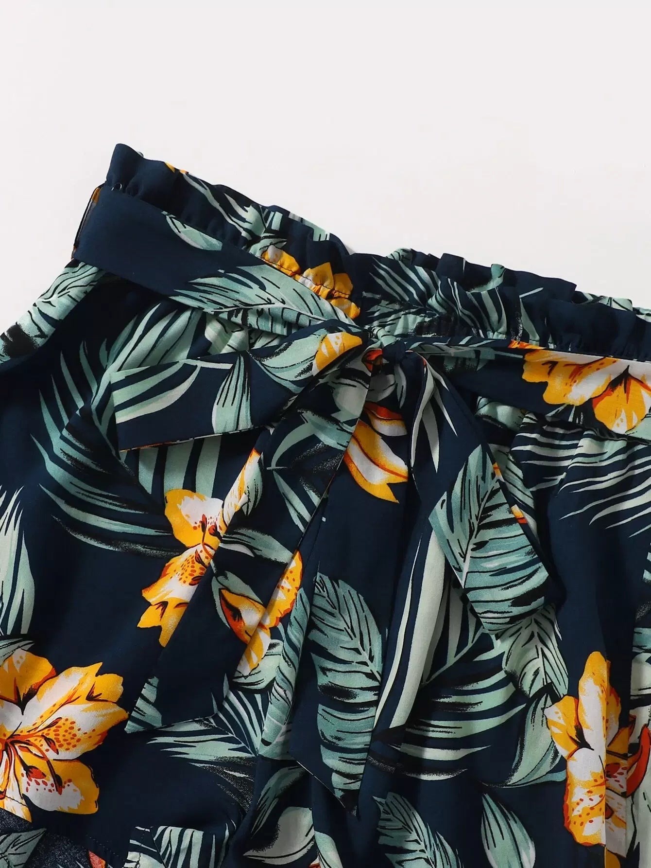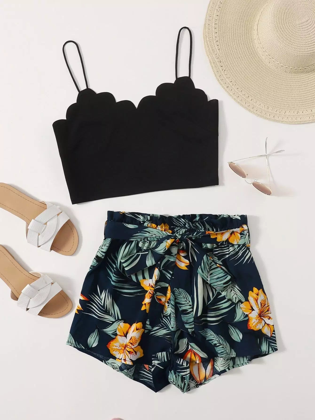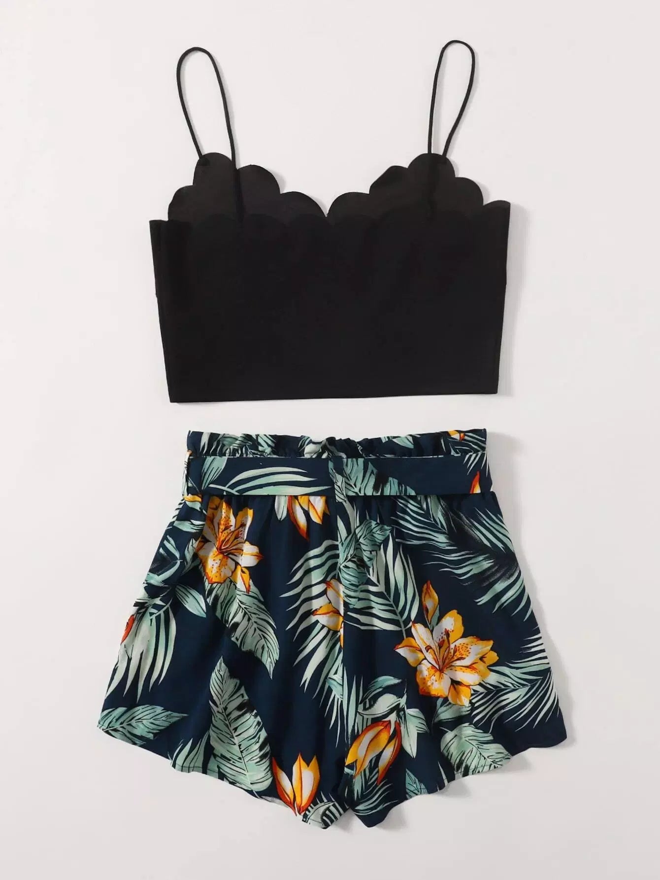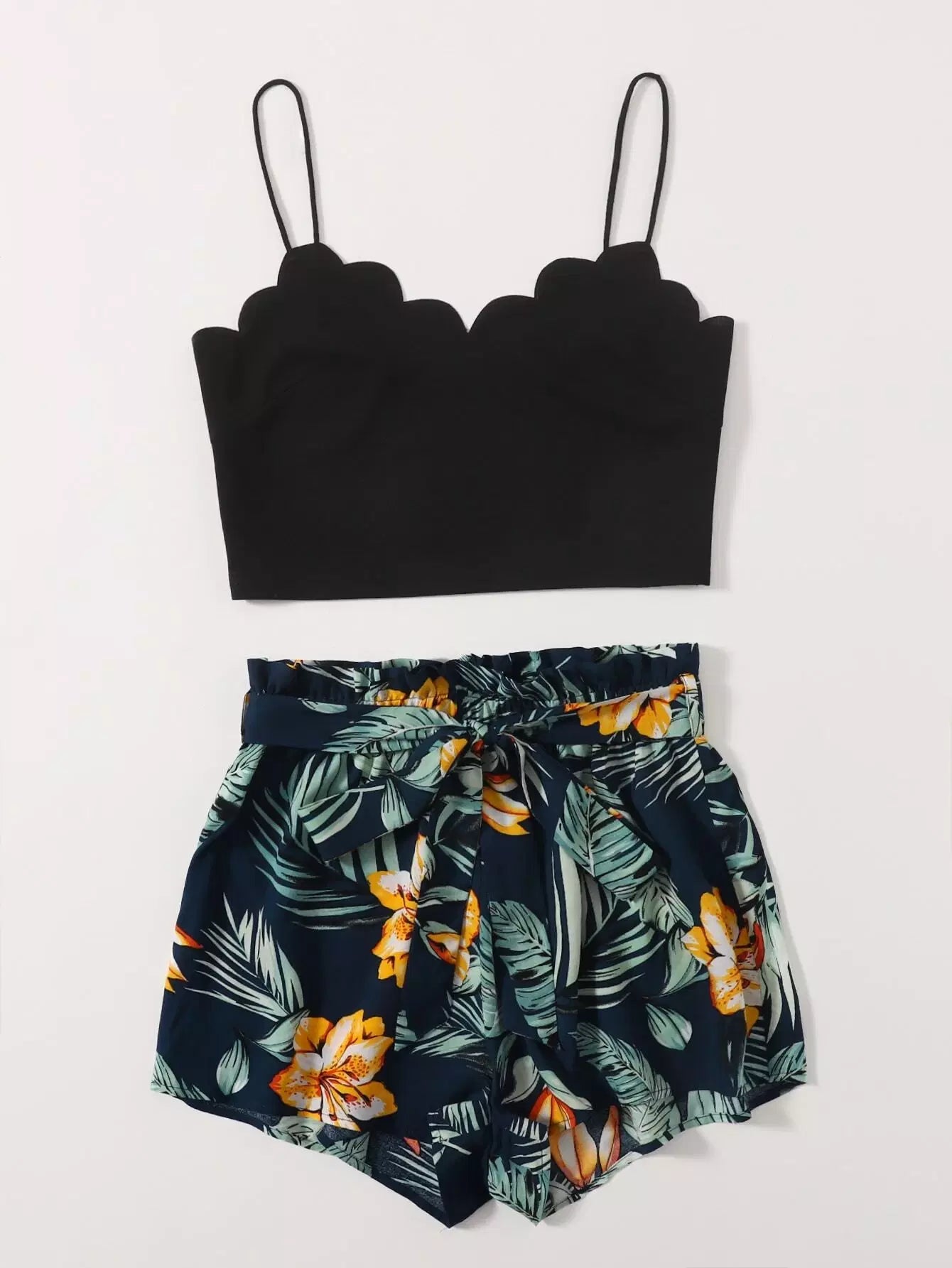 Scallop Edge Cami Top & Self Tropical Print Shorts Set Without Belt
