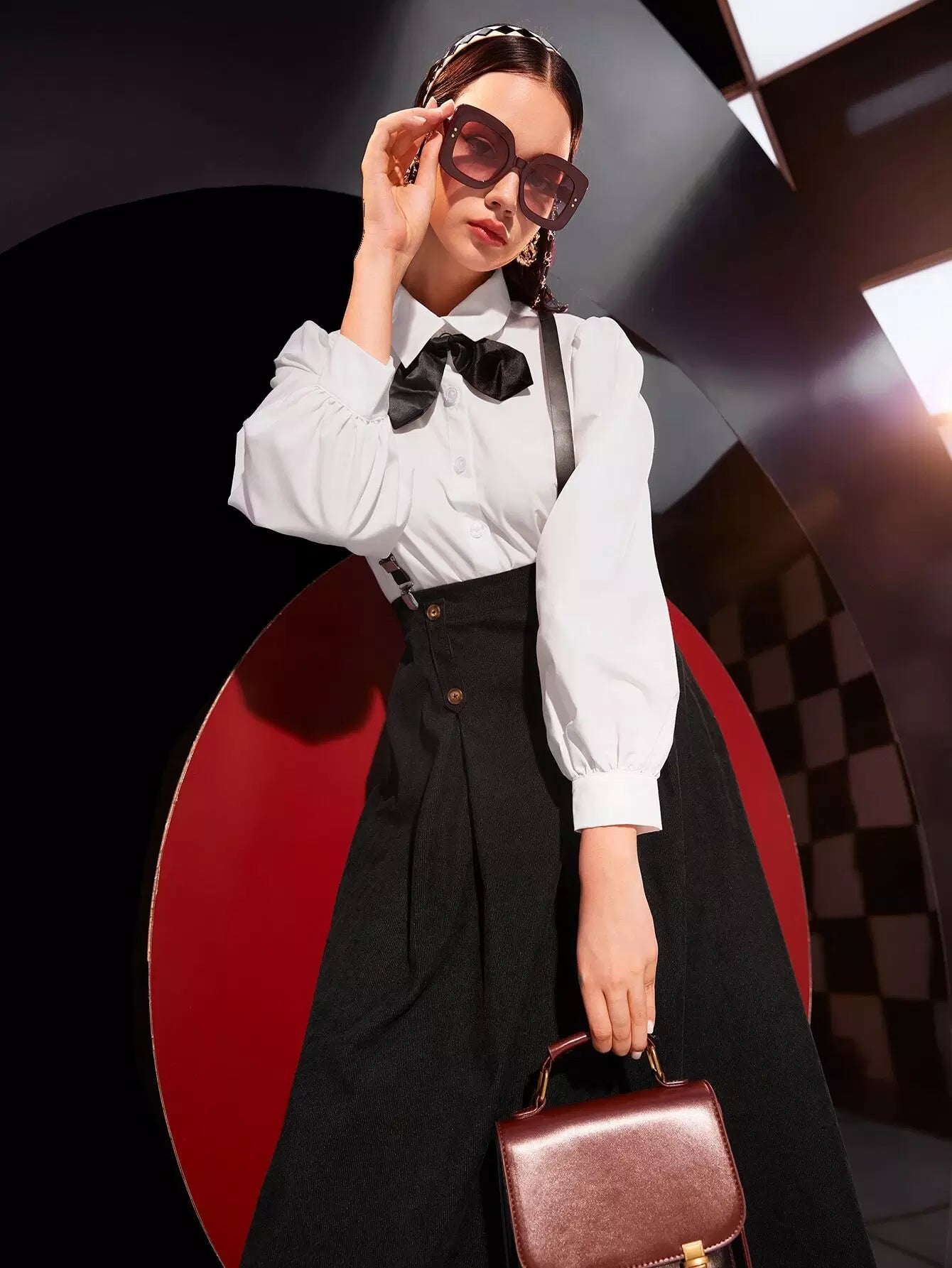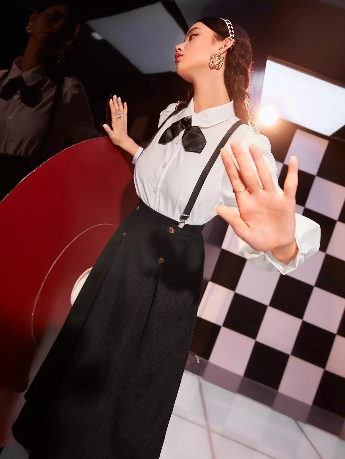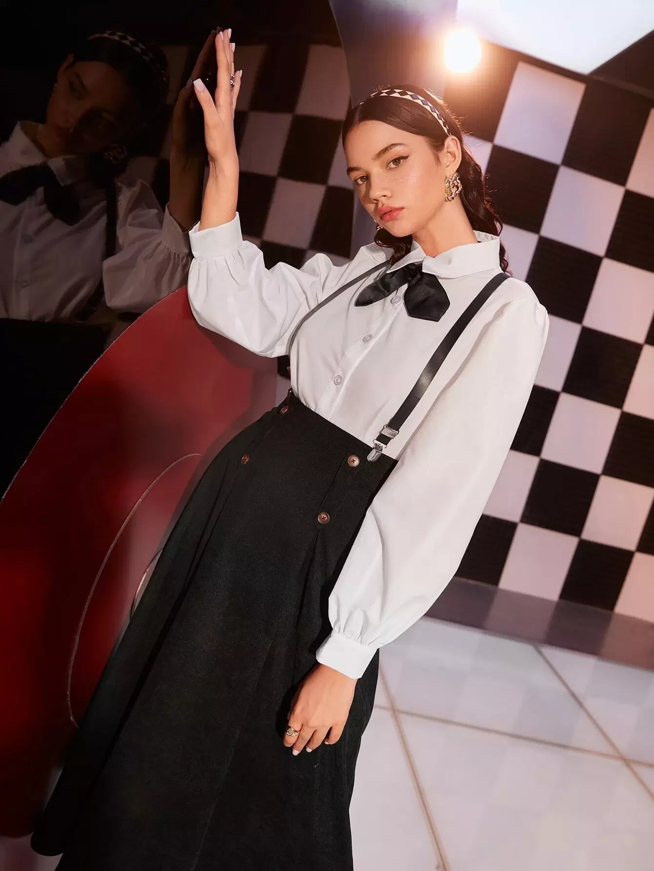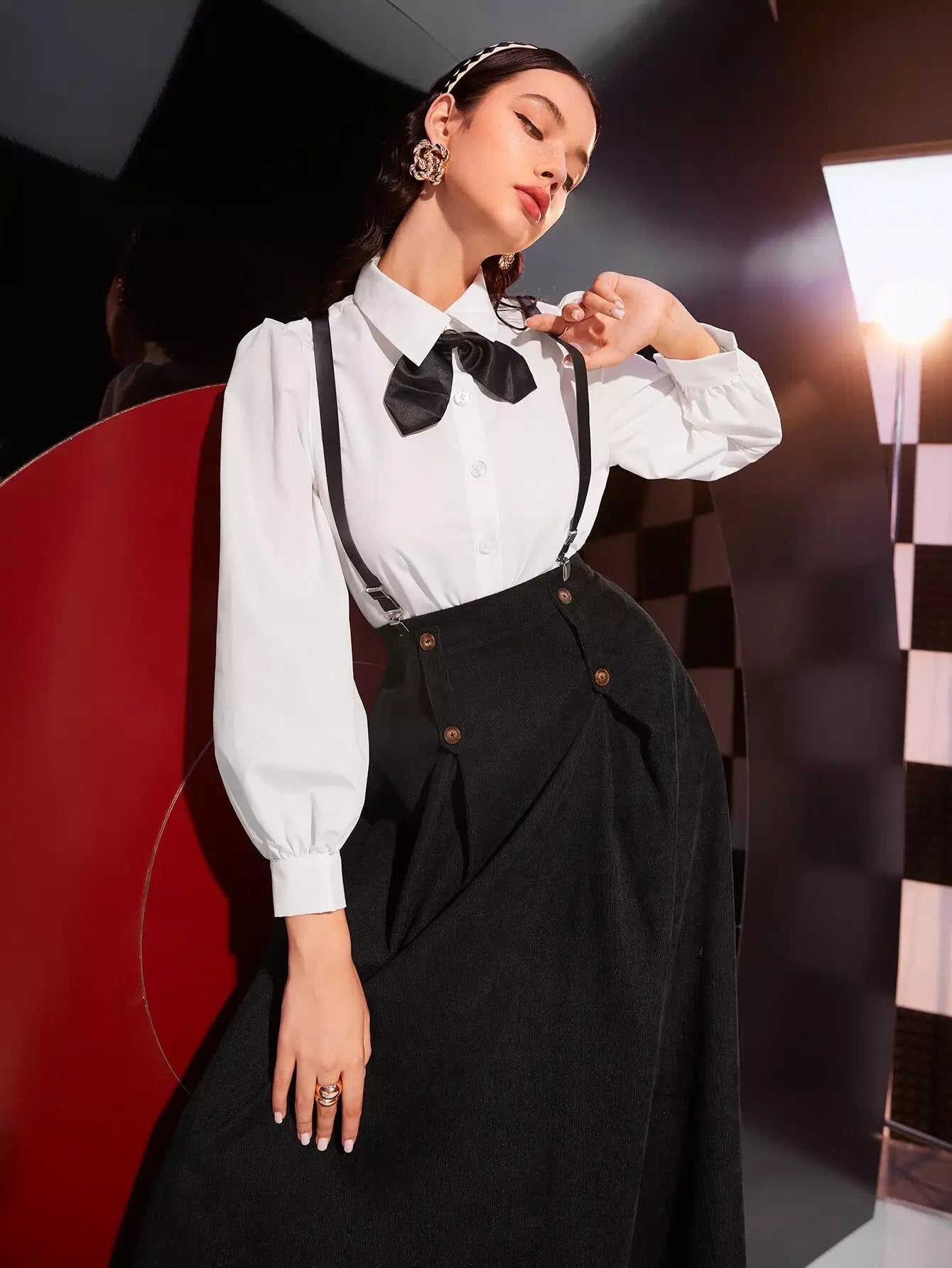 Solid Bow Front Lantern Sleeve Blouse & Plicated Pinafore Skirt Without Belt