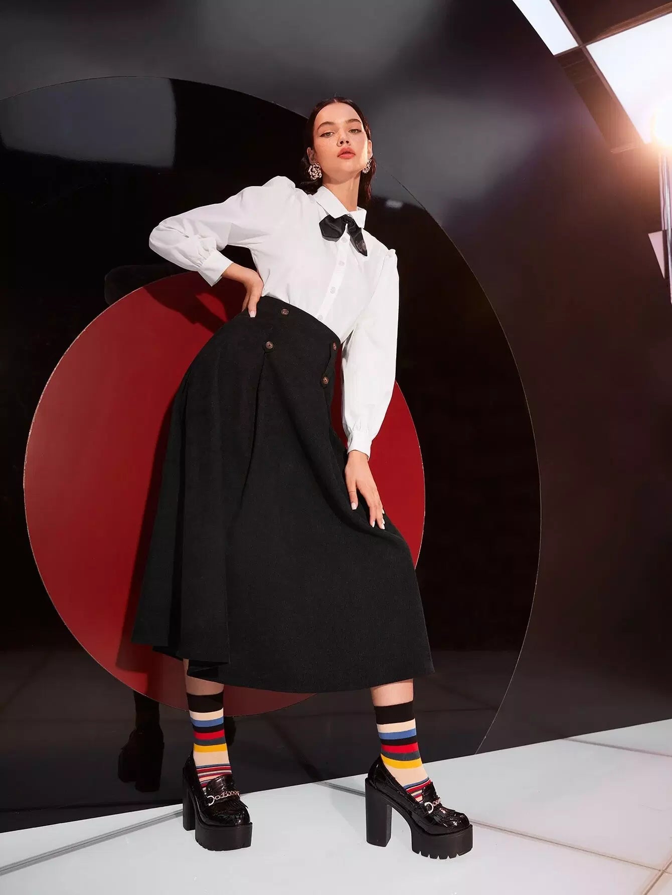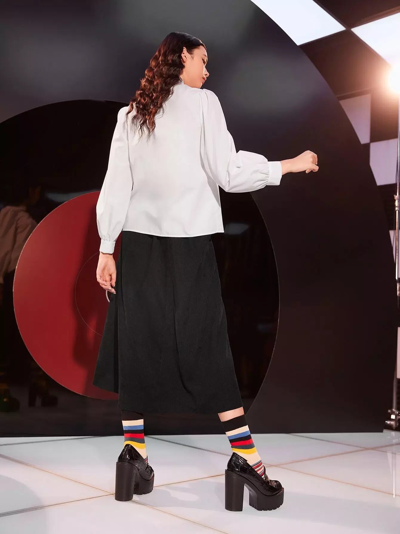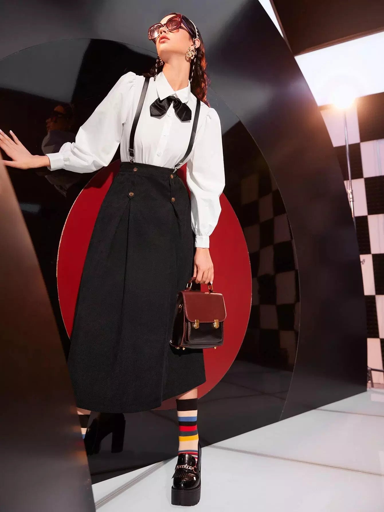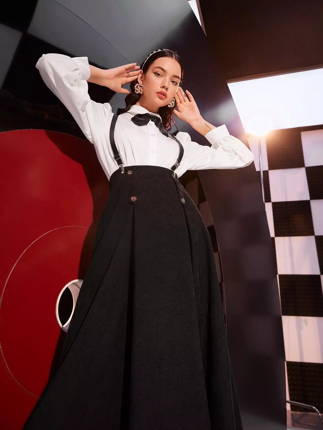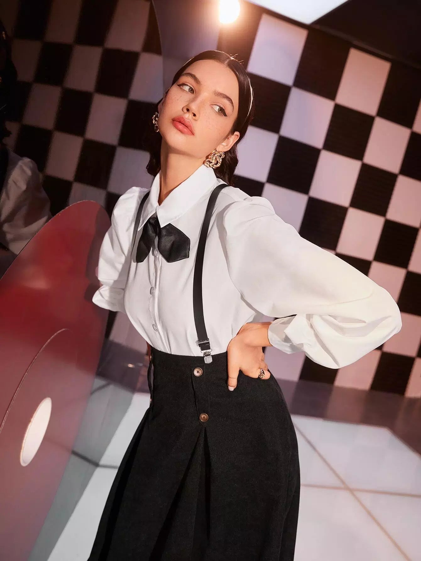 Solid Bow Front Lantern Sleeve Blouse & Plicated Pinafore Skirt Without Belt