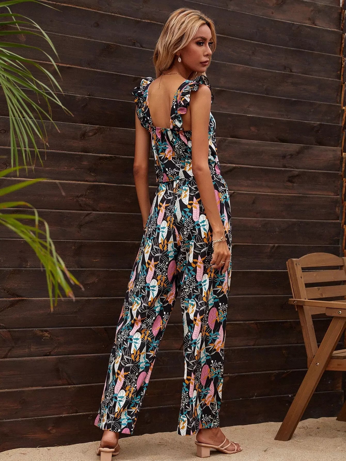 Tropical Print Ruffle Trim Top & Wide Leg Pants Set