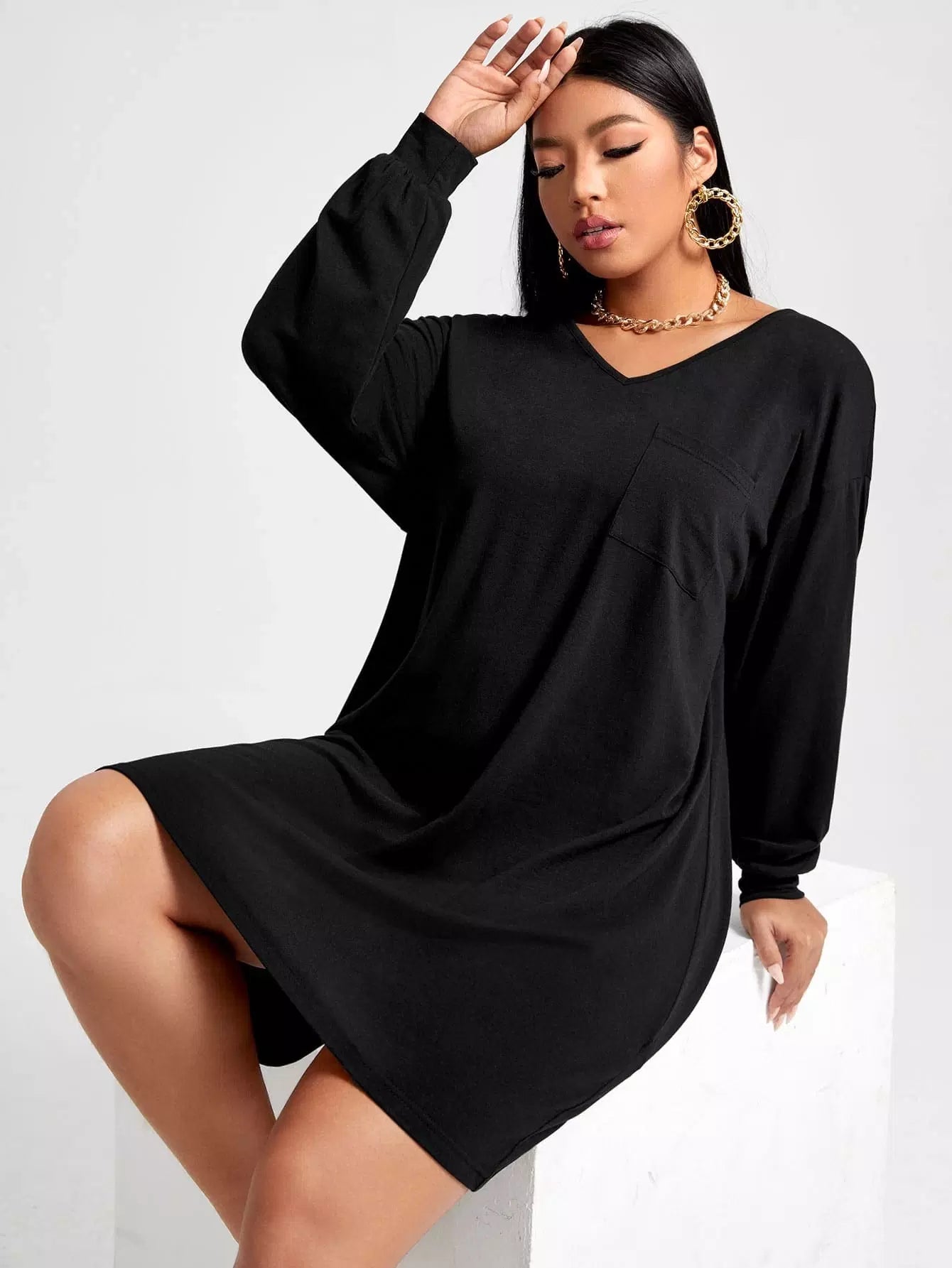 Plus Solid V-Neck Dress