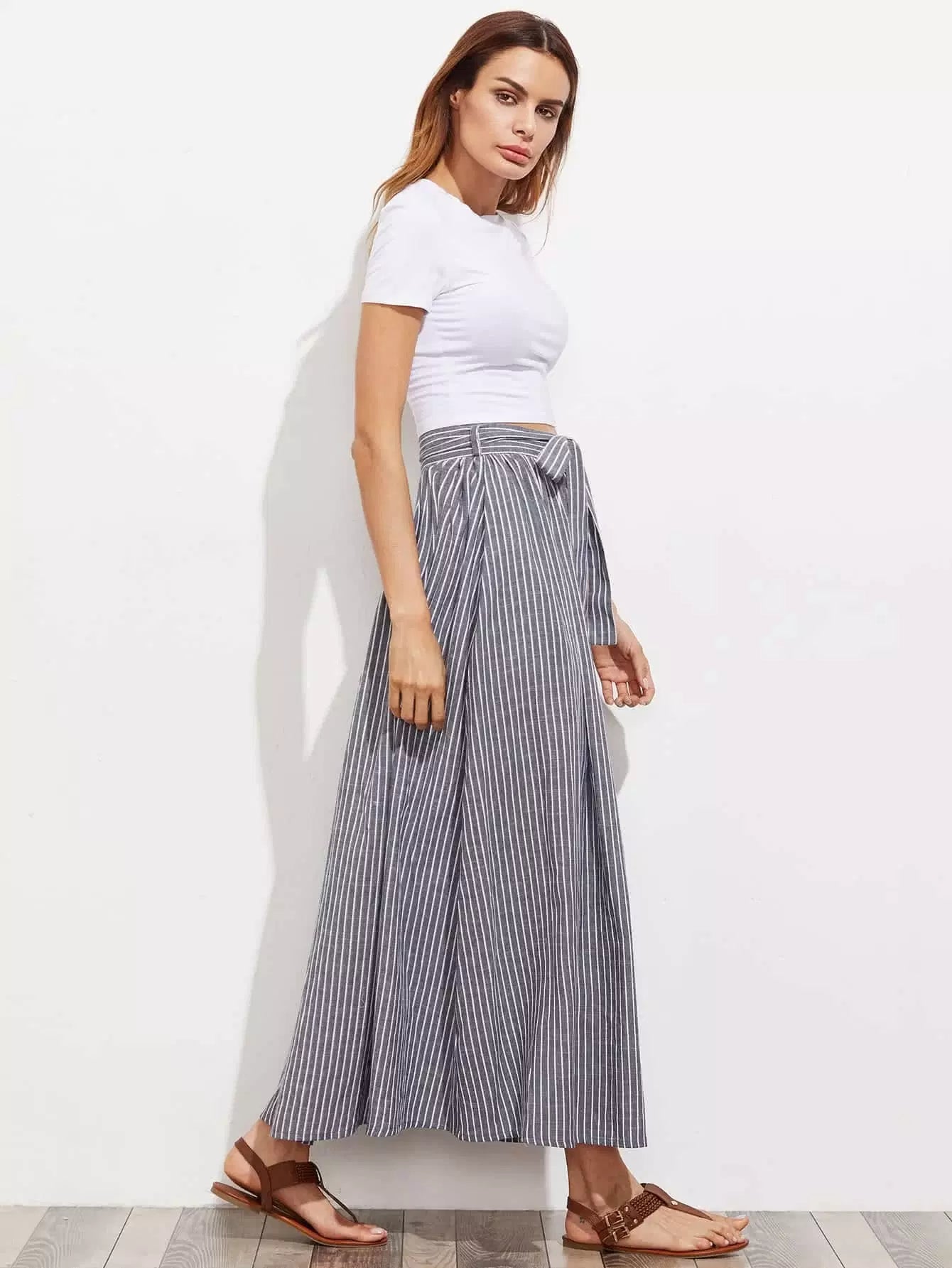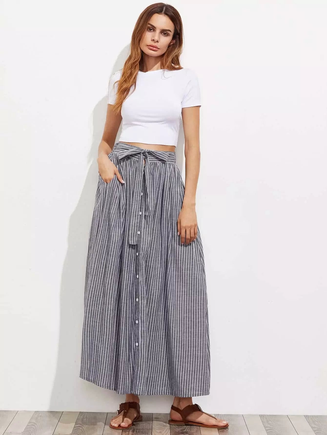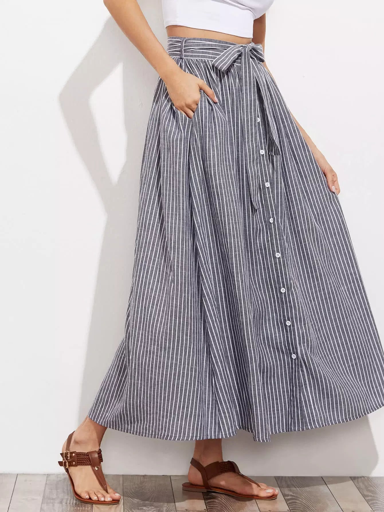 Self Tie Hidden Pocket Detail Button Up Pinstripe Skirt