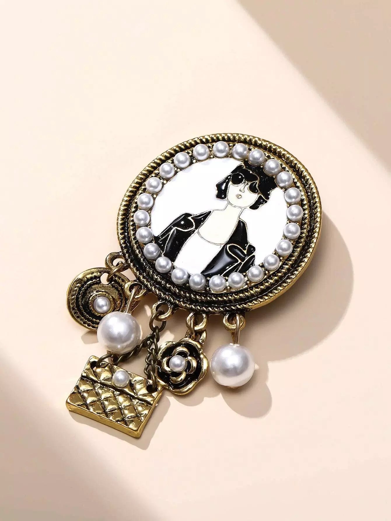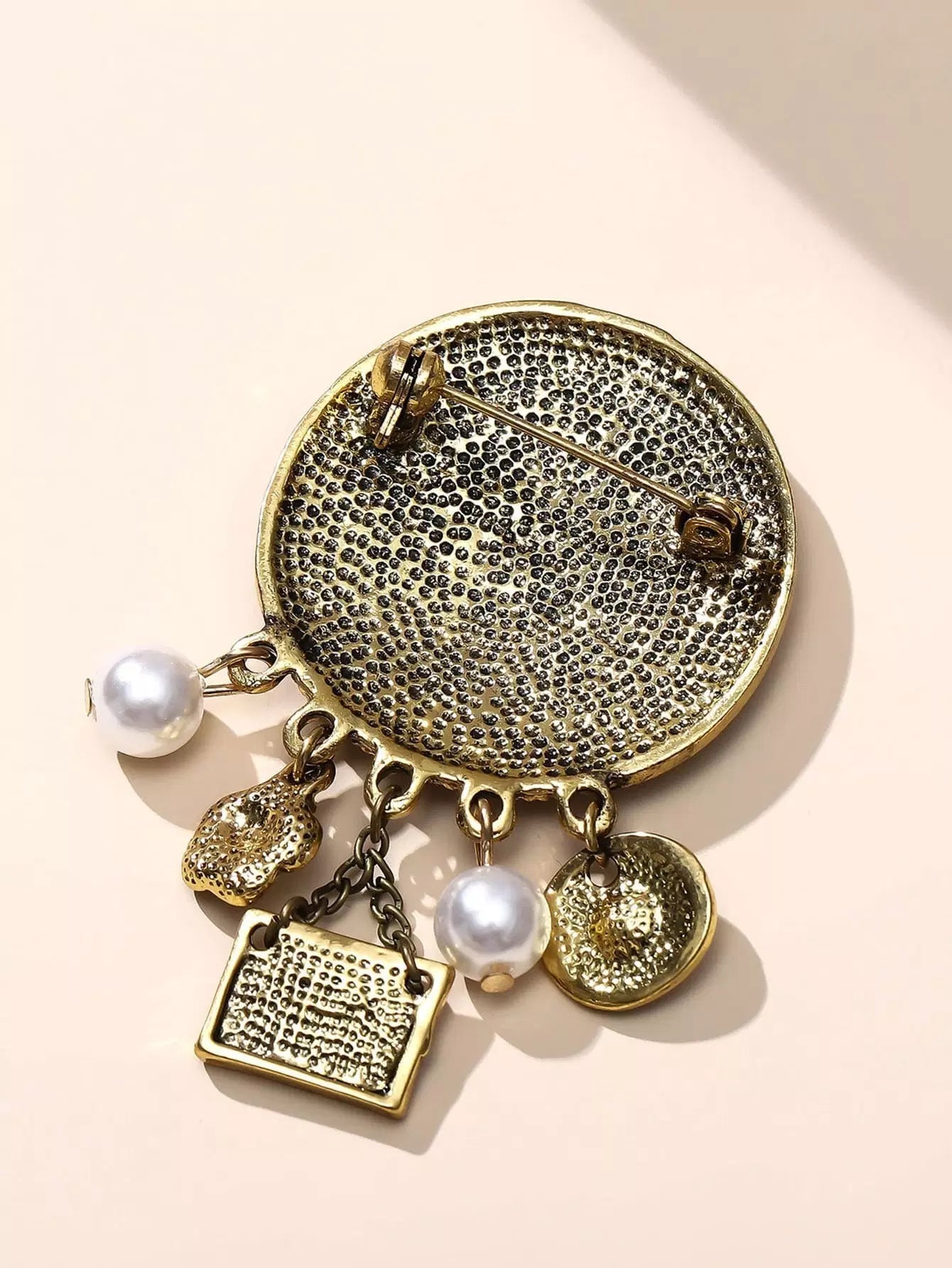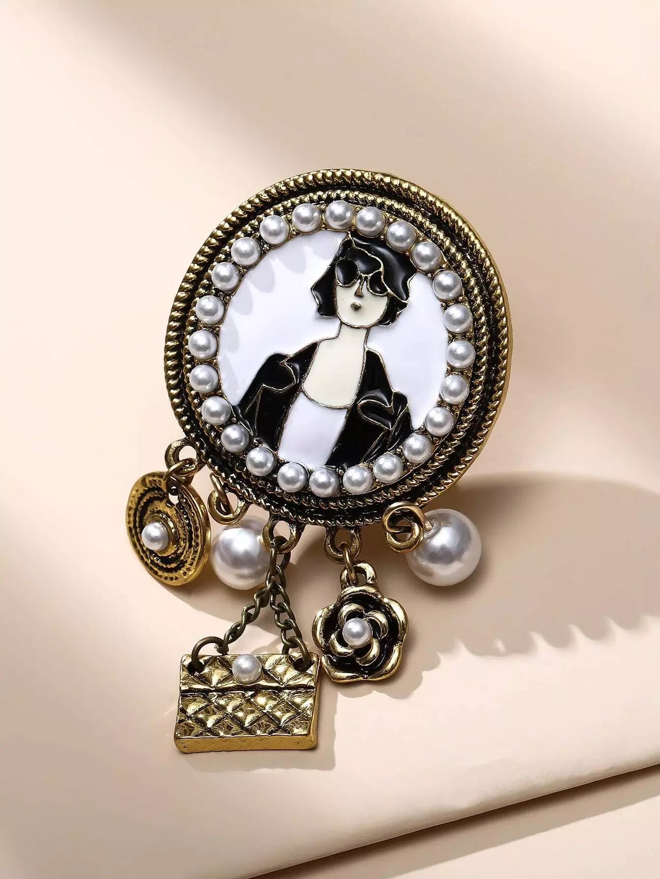 Women - Faux Pearl Decor Figure Design Round Brooch