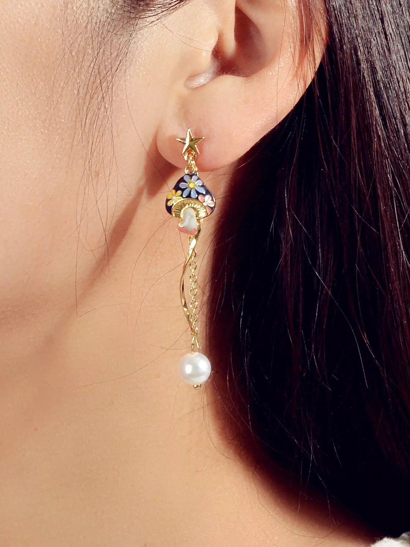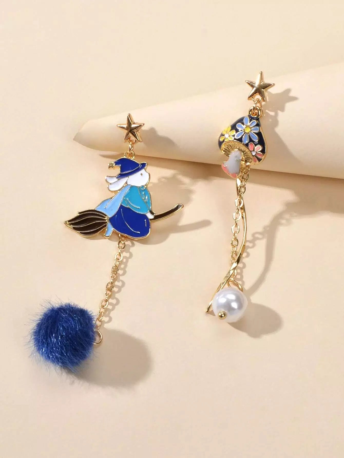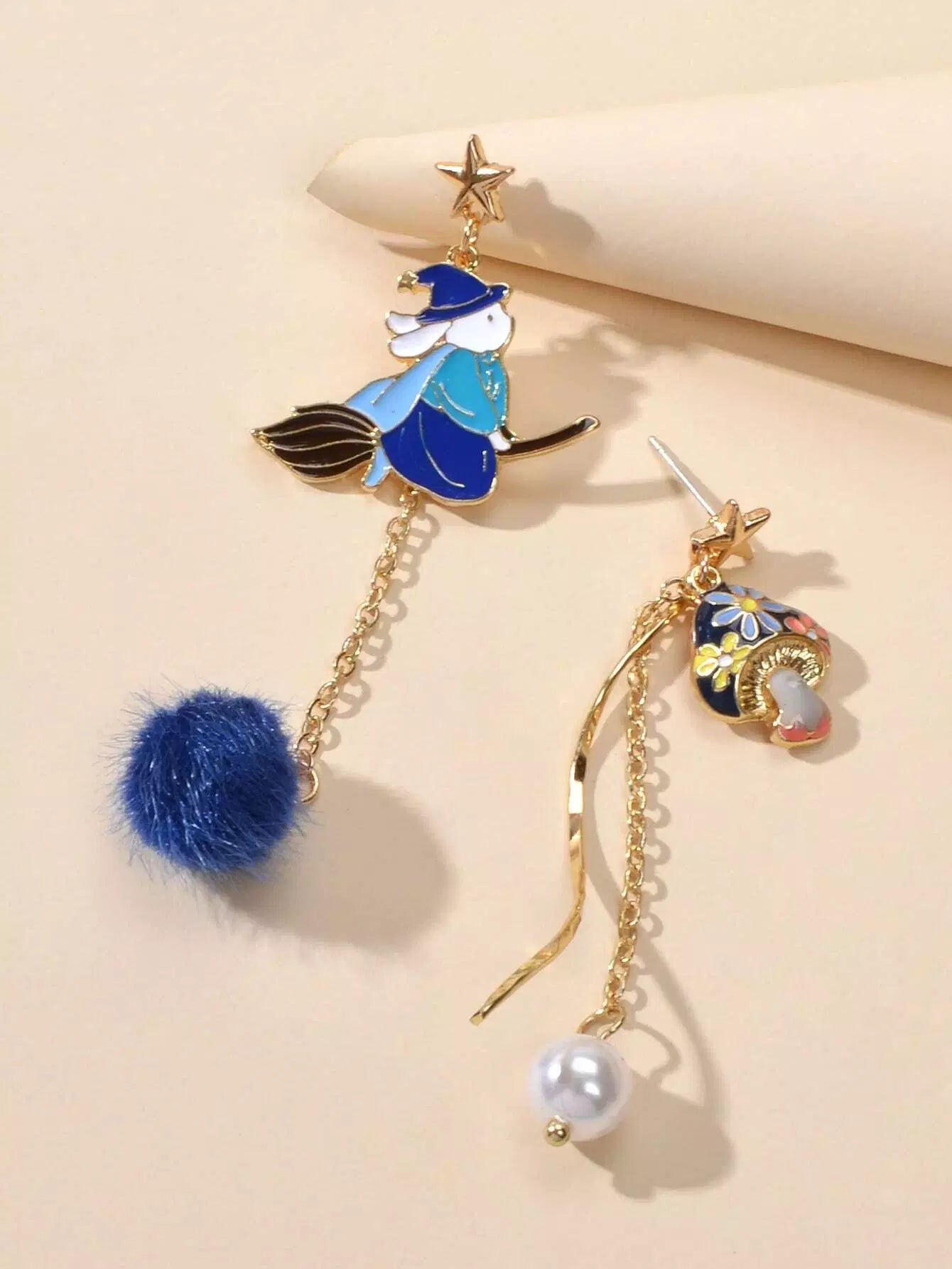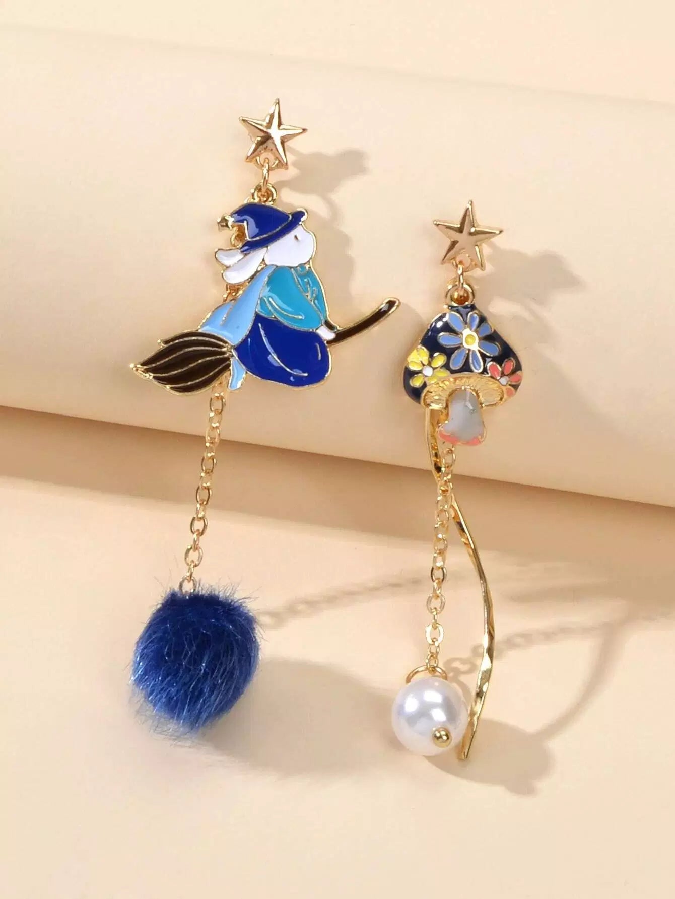 Faux Pearl Decor Fluffy Pom Pom Mismatched Drop Earrings