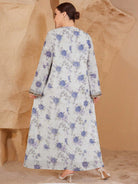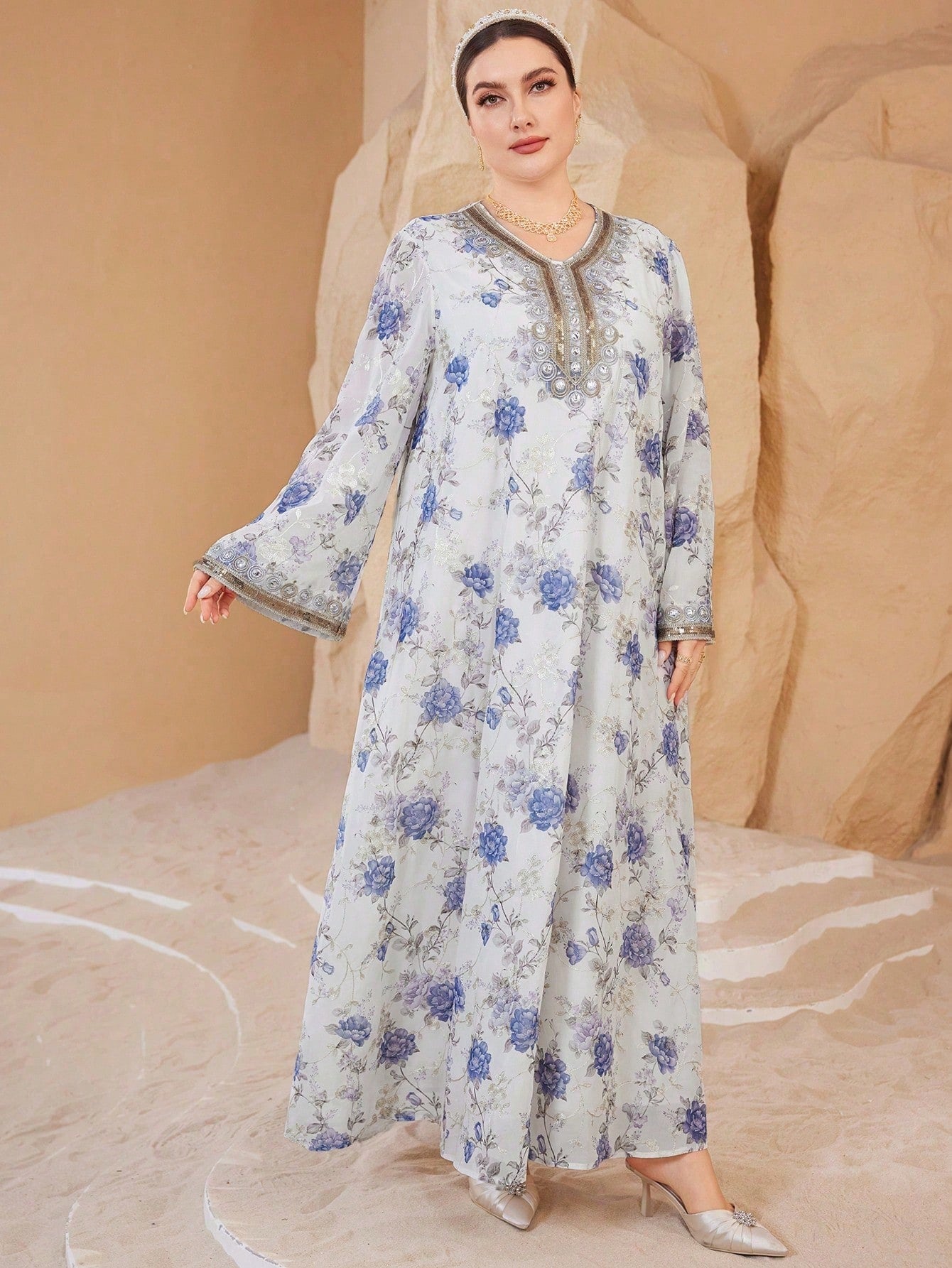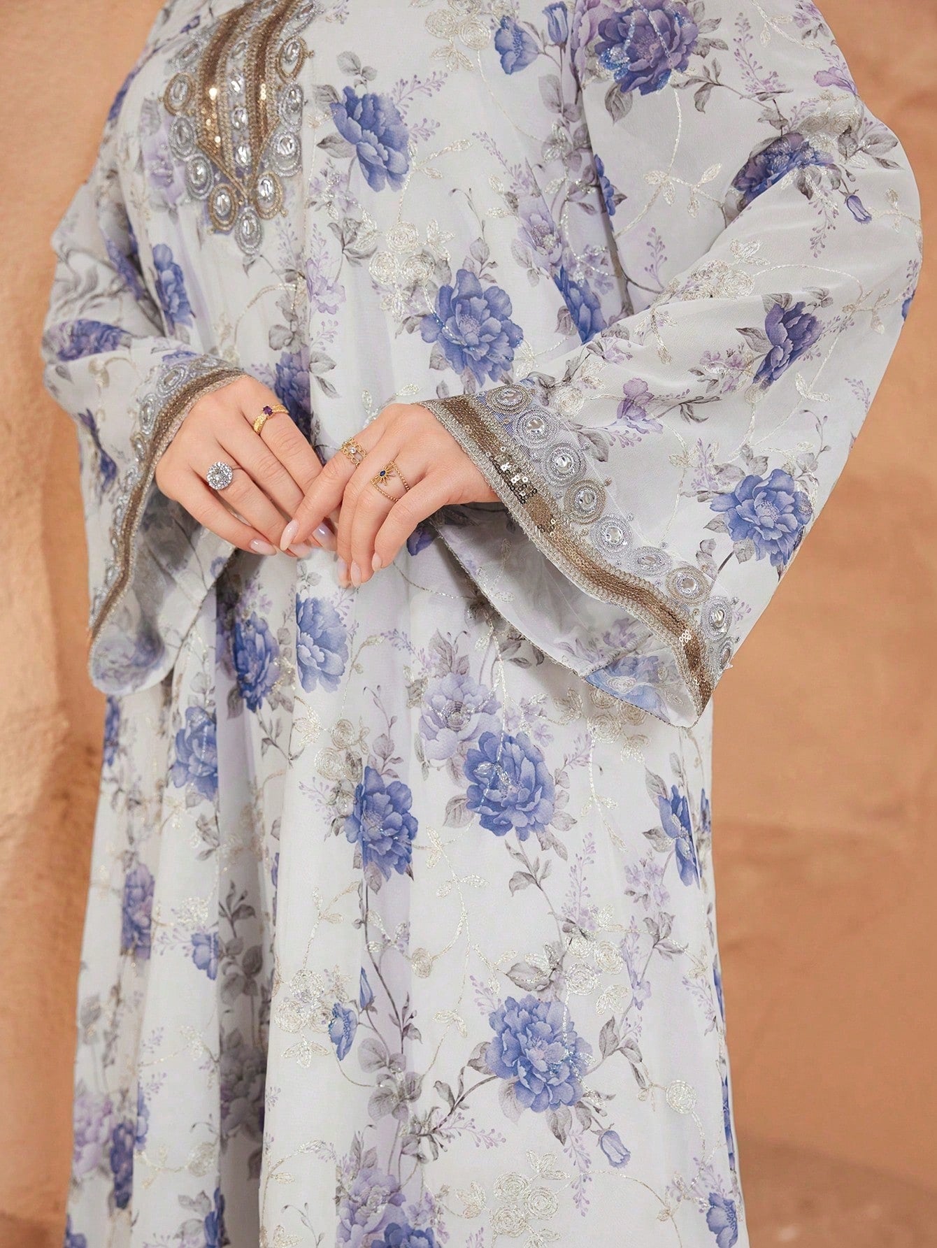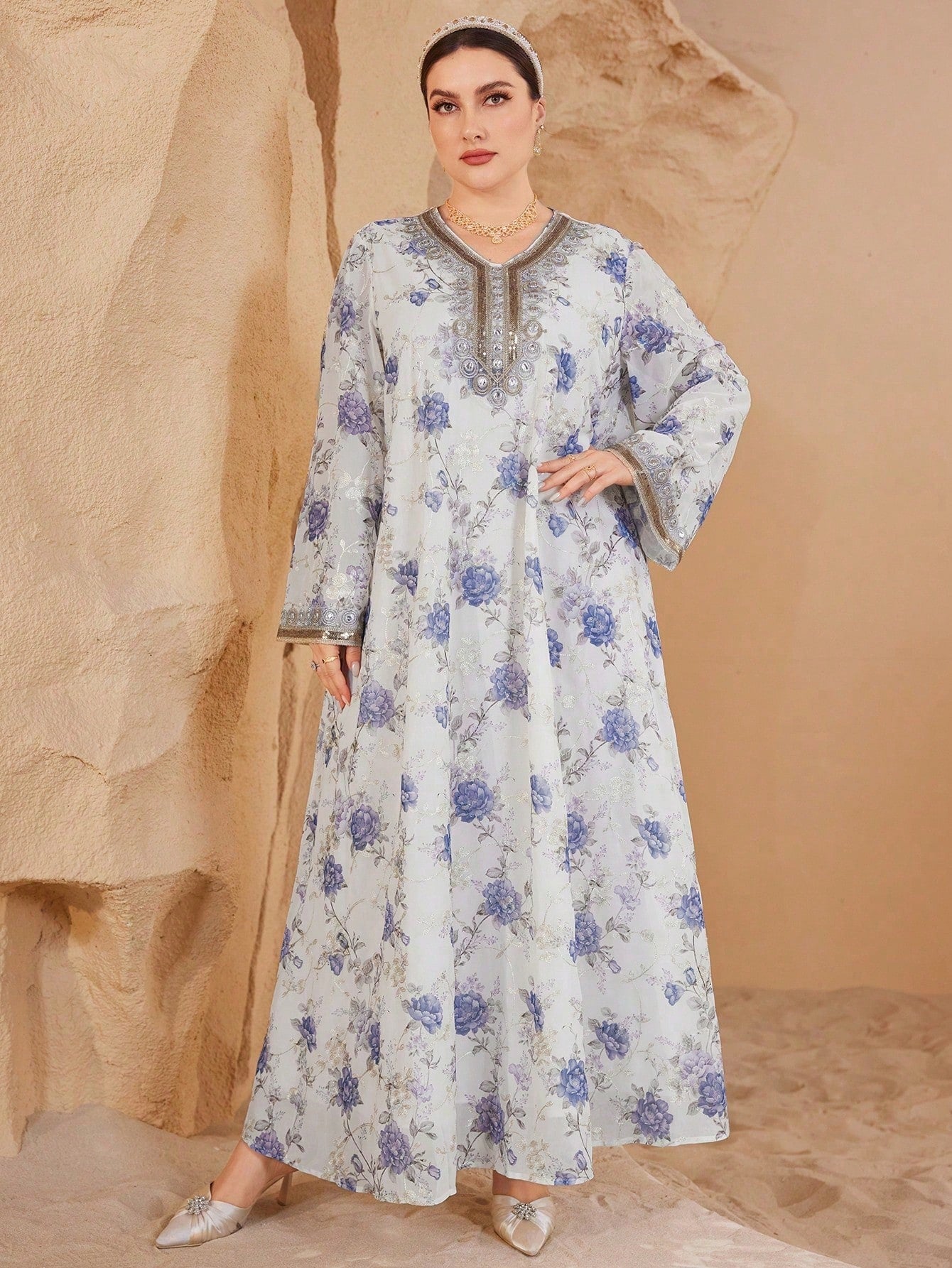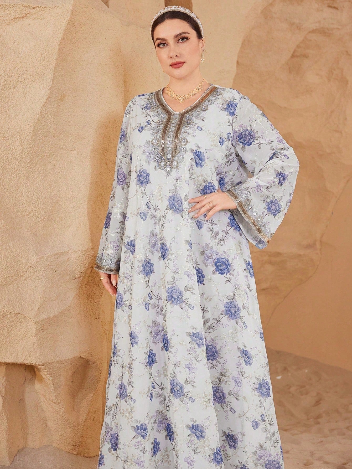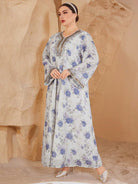 Al Najma Women's V-Neck Long-Sleeved Chiffon Printed Embroidery Gold Lace Rich Elegant Romantic Gorgeous