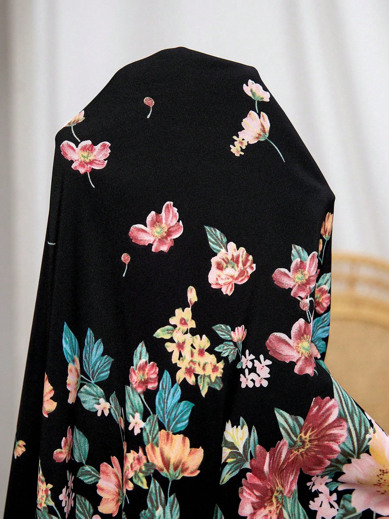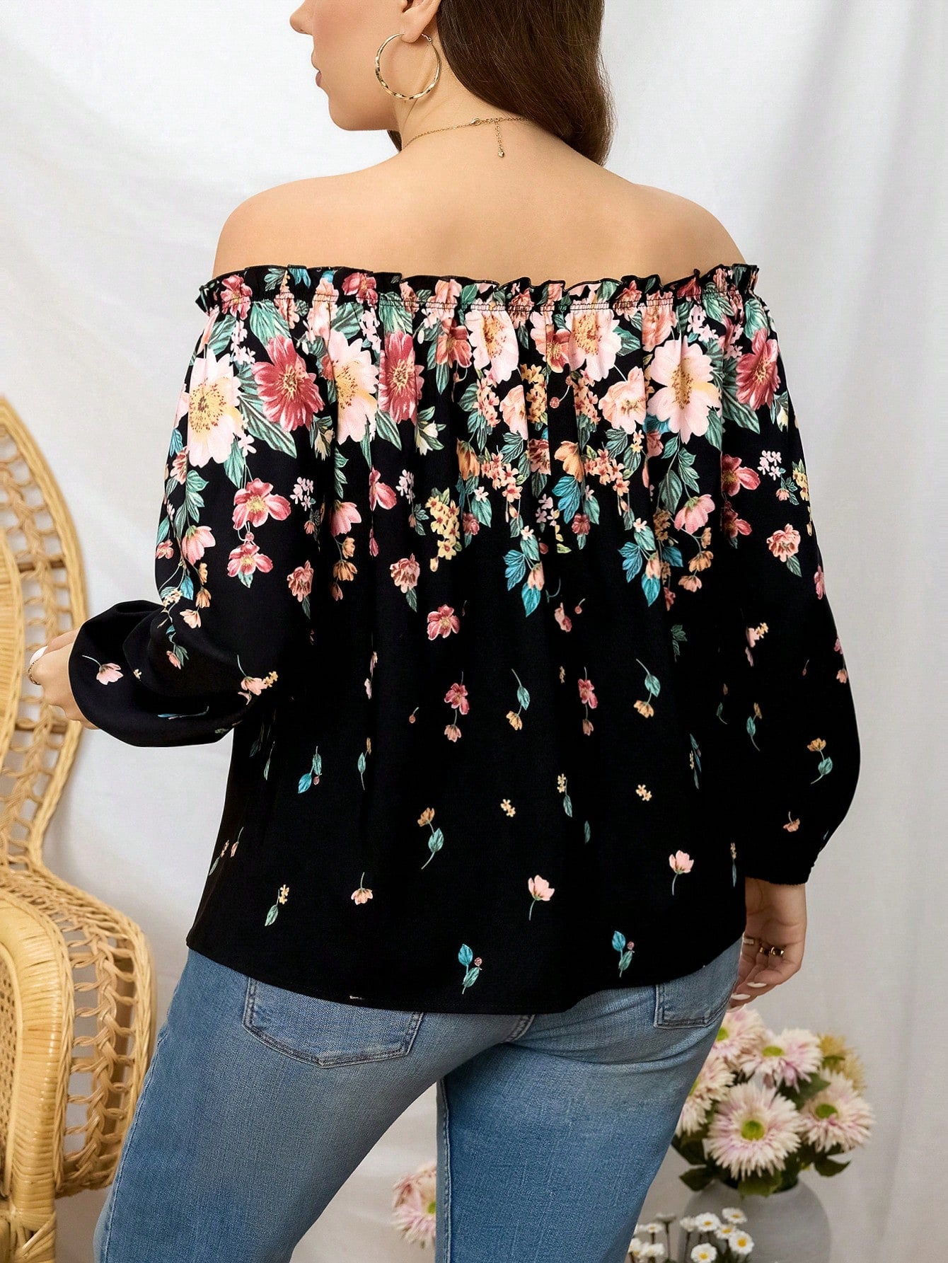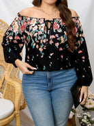 Clasi Plus Size Women Floral Print Off Shoulder Curved Neck Elastic Cuff Blouse, Suitable For Vacation