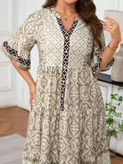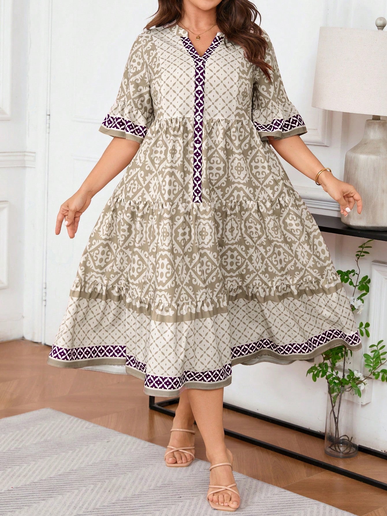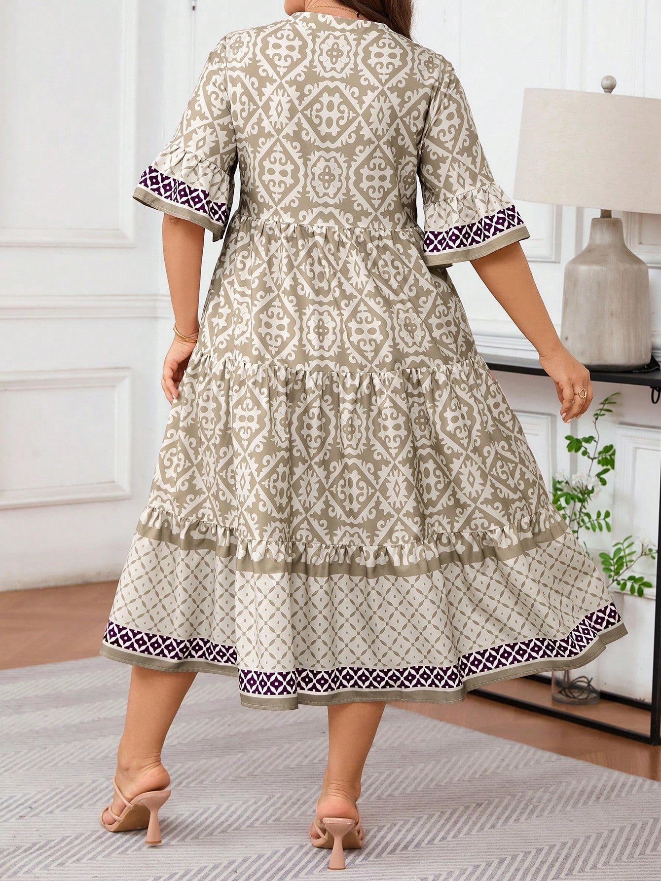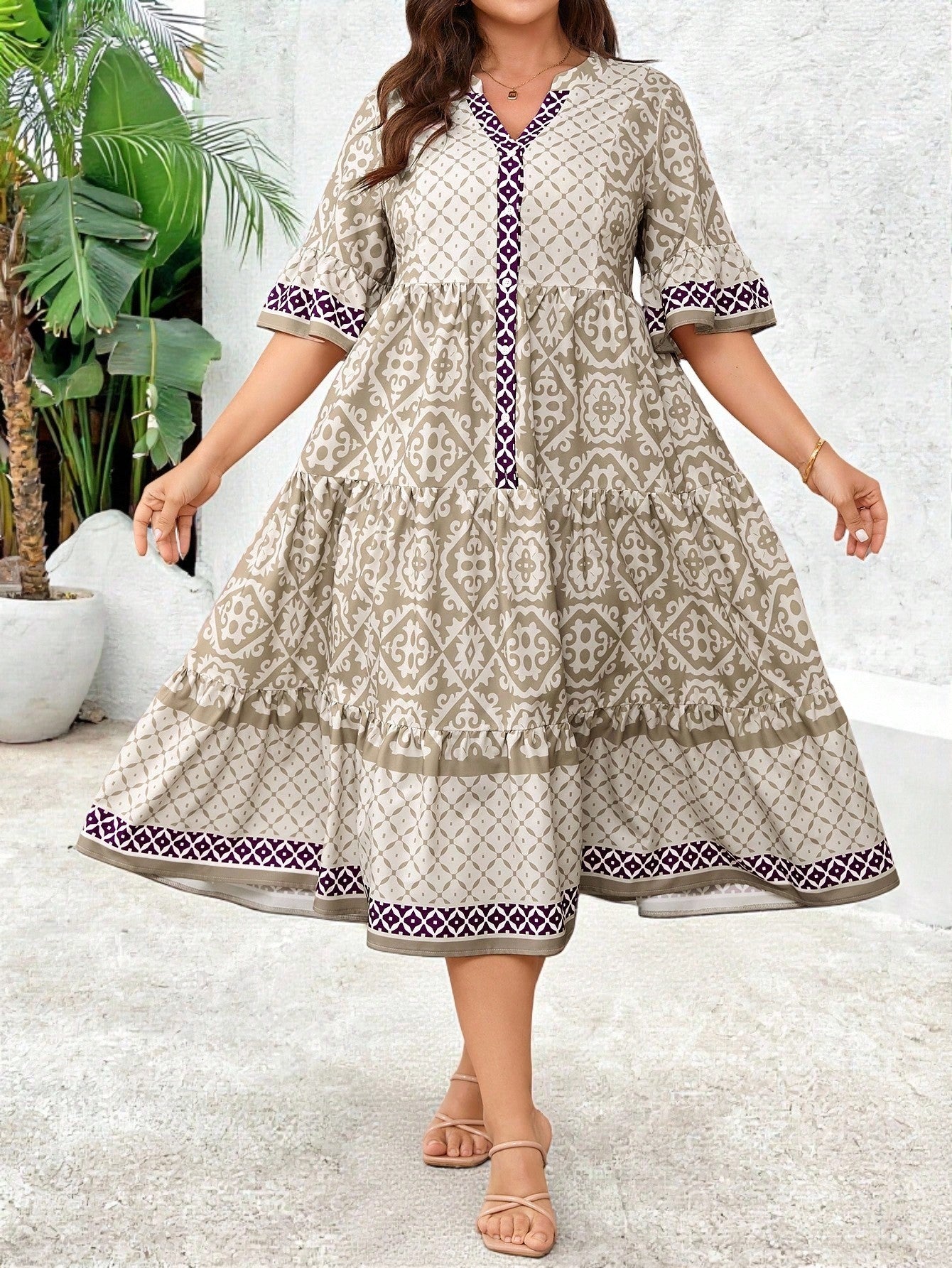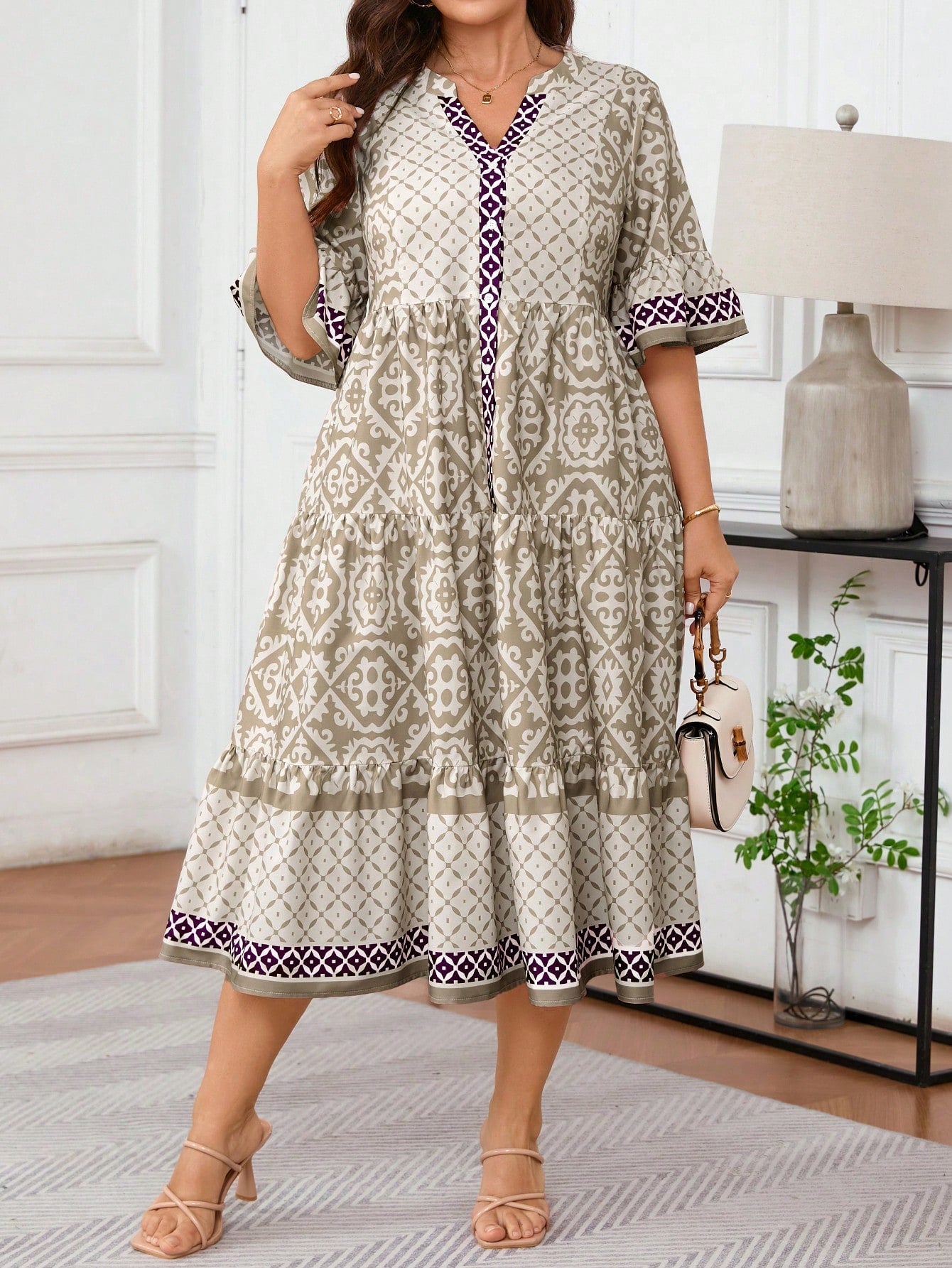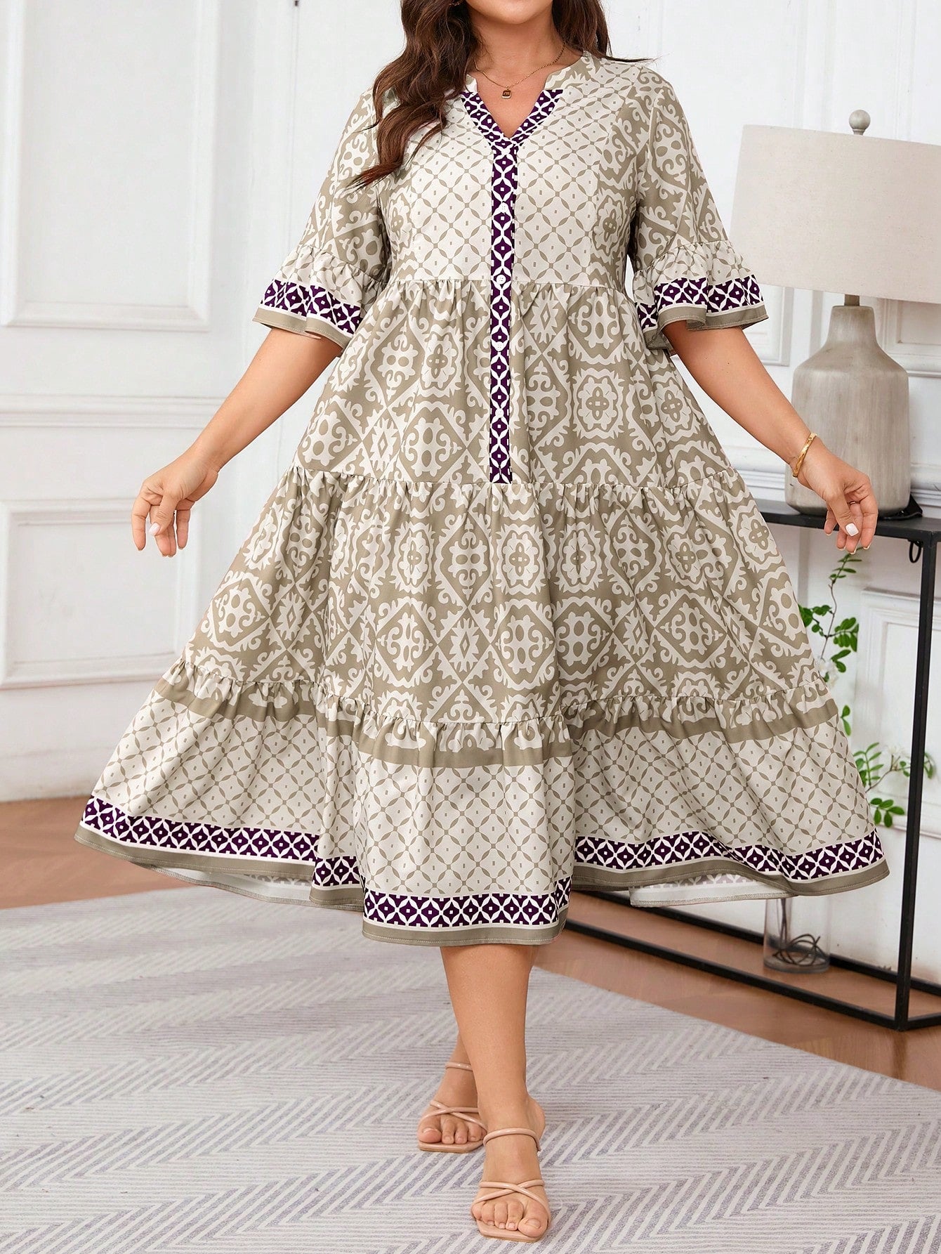 EMERY ROSE Plus Size Women Stand Collar Button Placement Print Midi Dress