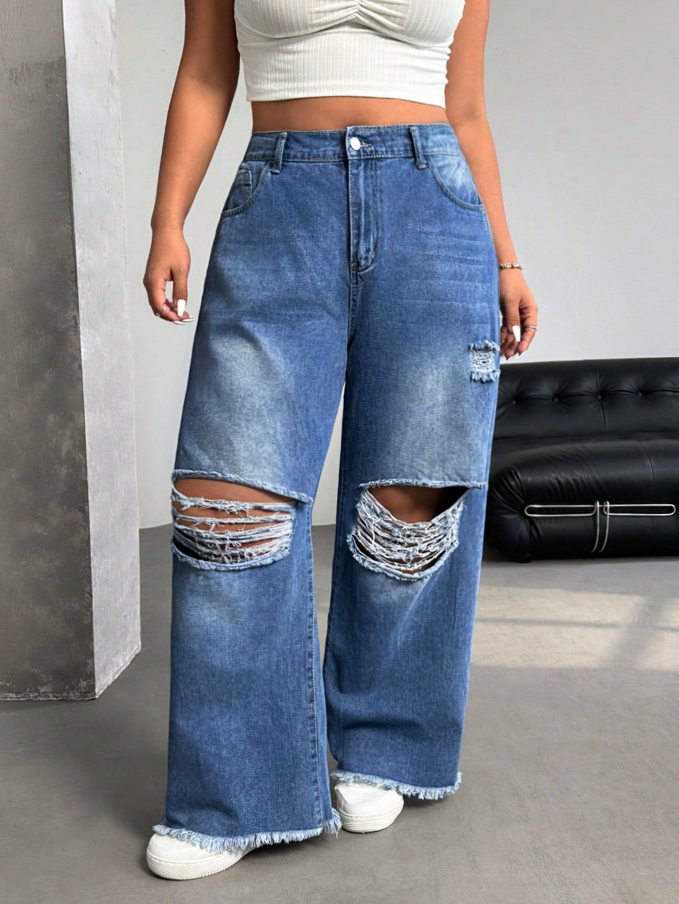 Essnce Plus Size Women's Distressed Denim Jeans, Minimalist Fashion Suitable For Summer