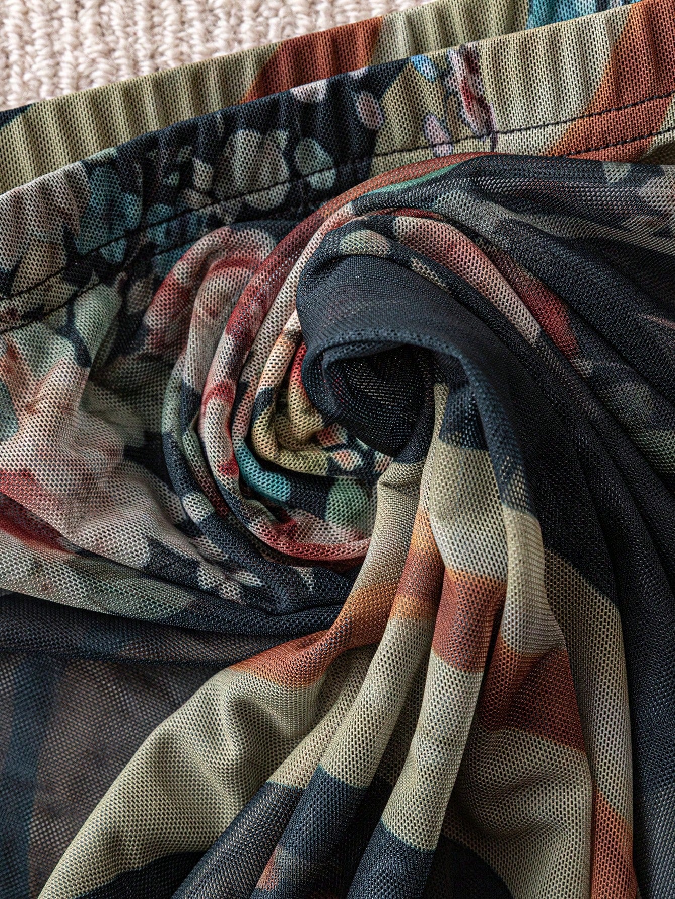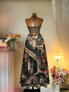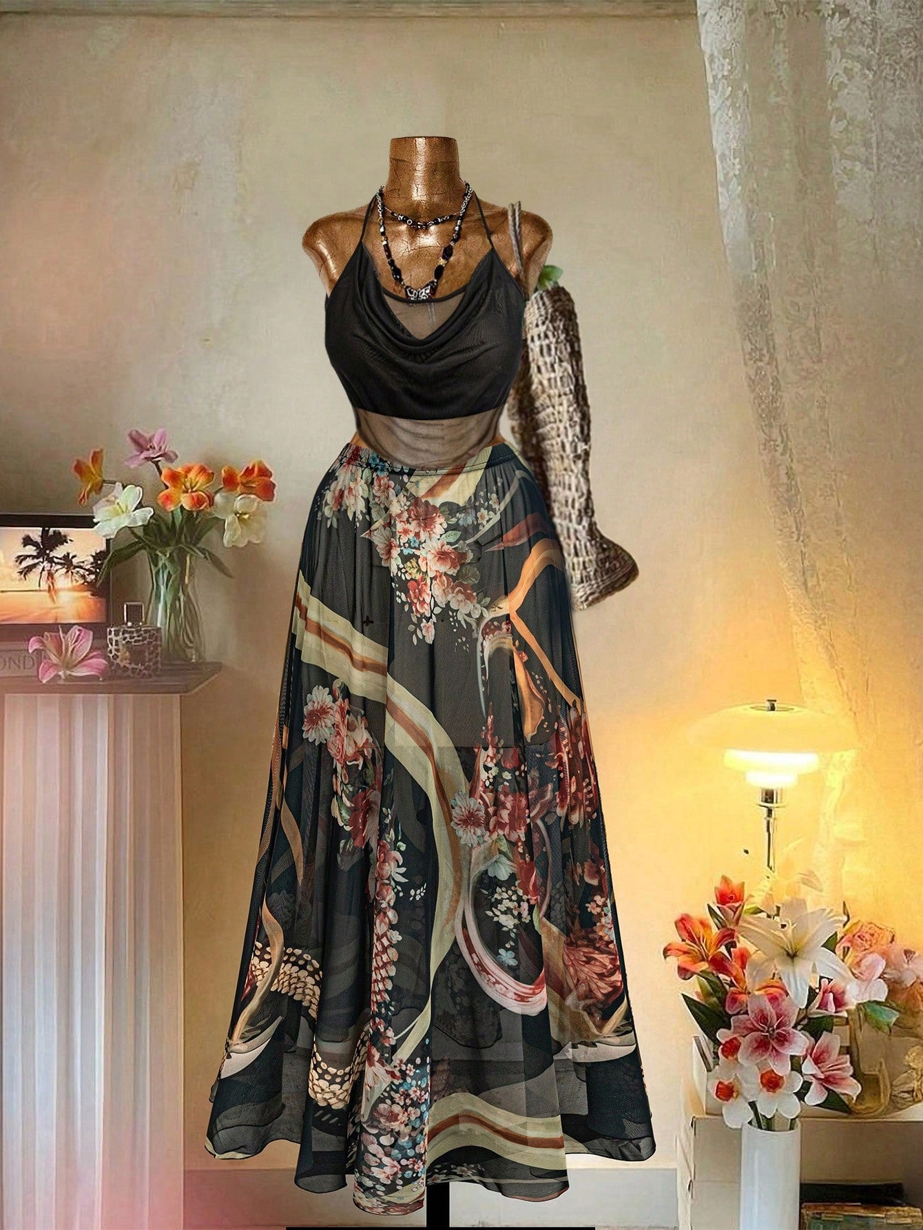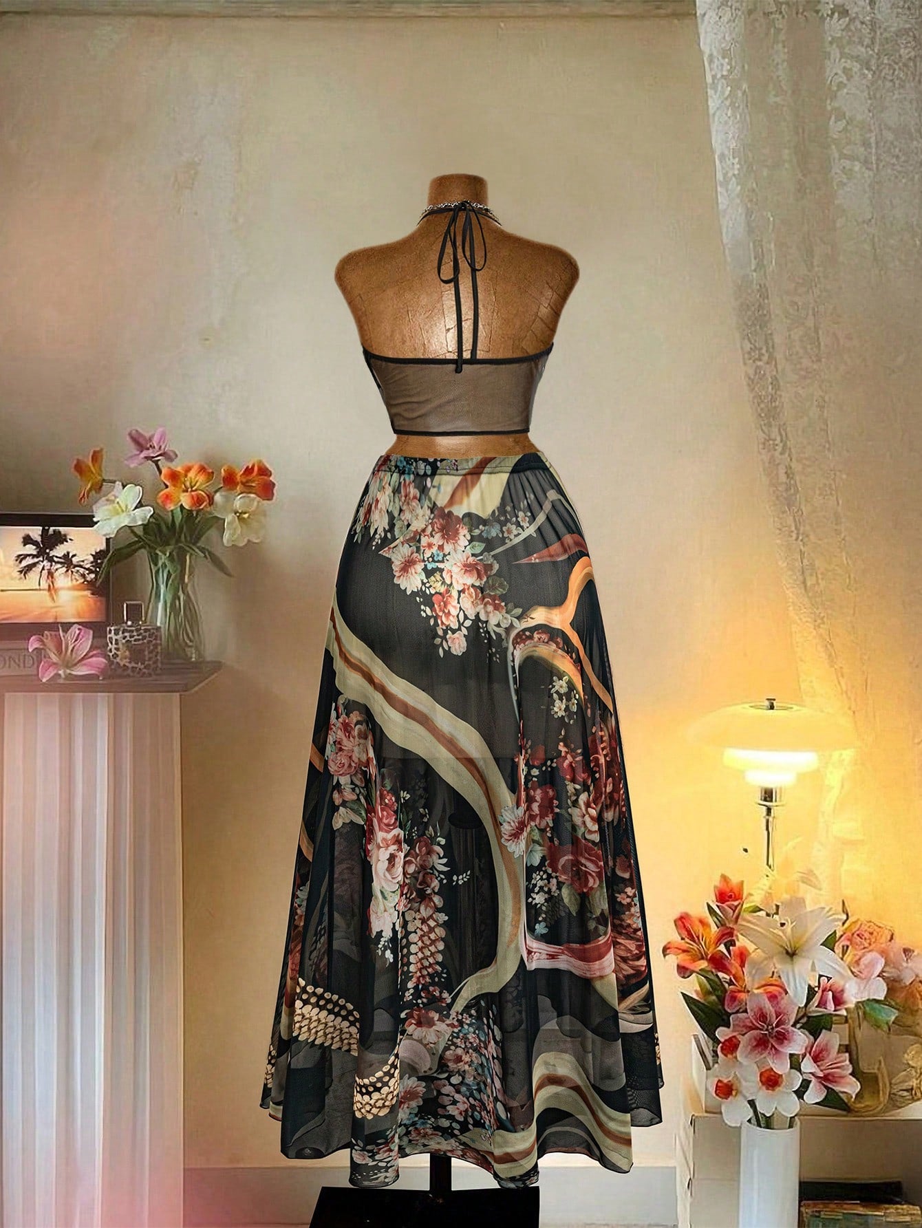 Flirla Plus Size Women's 2 Pcs Floral Tie A Knot Halter Top And Asymmetrical Flounder Slit Skirt Set,