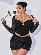 ICON Plus Size Women's Shoulder Strap & Halter Neck Cups Long Sleeve Black Corset T-Shirt