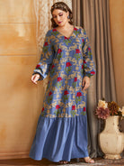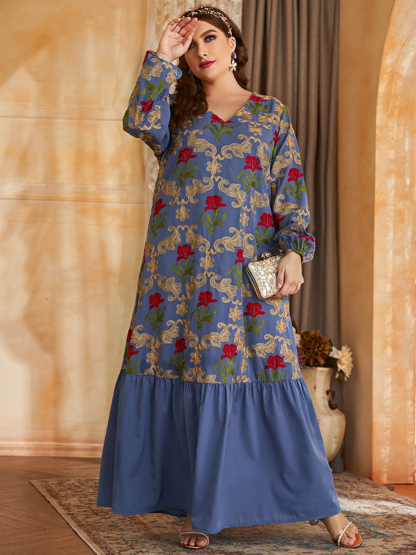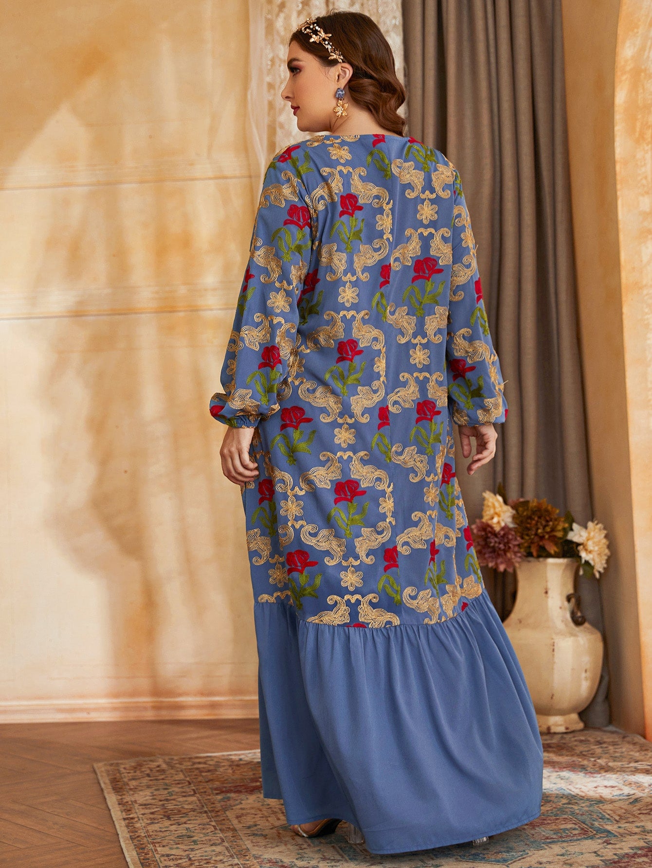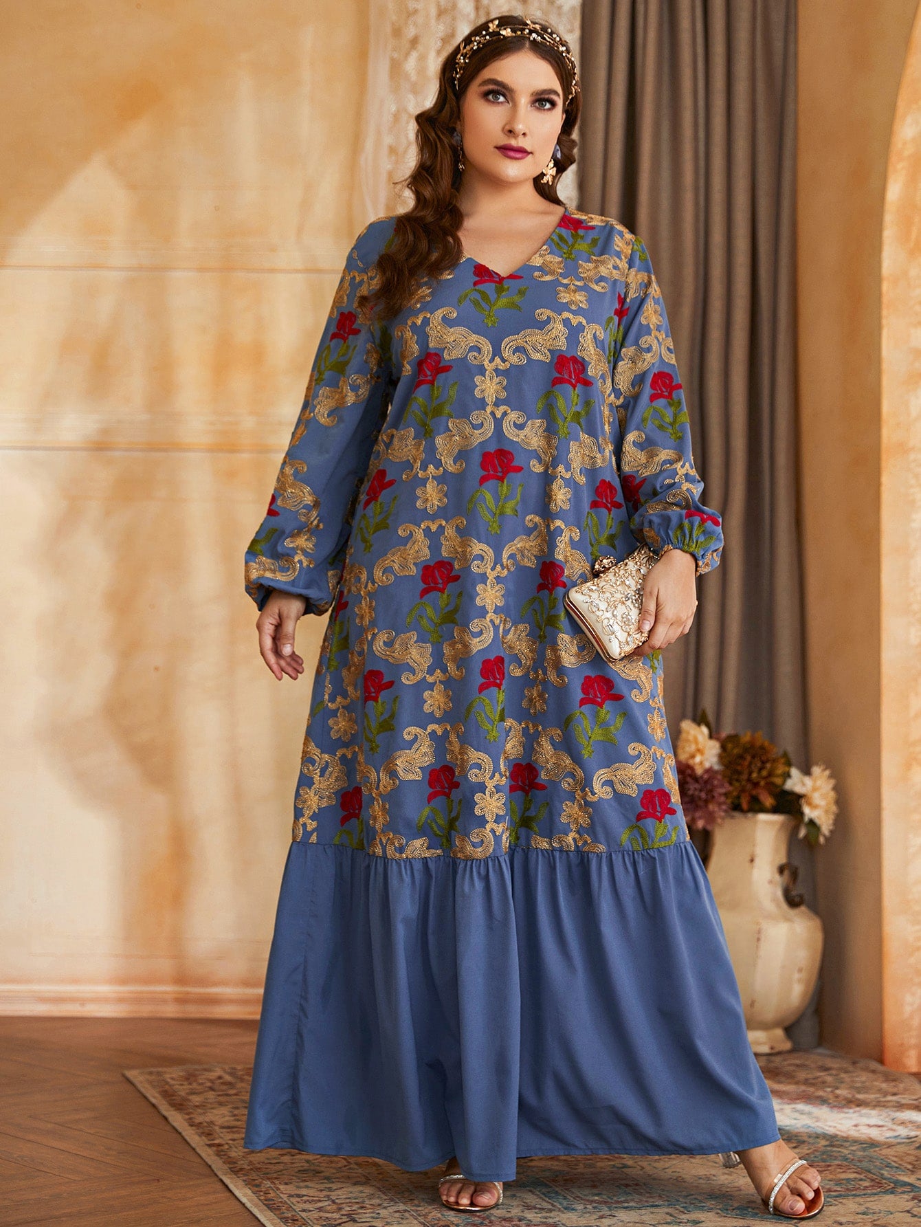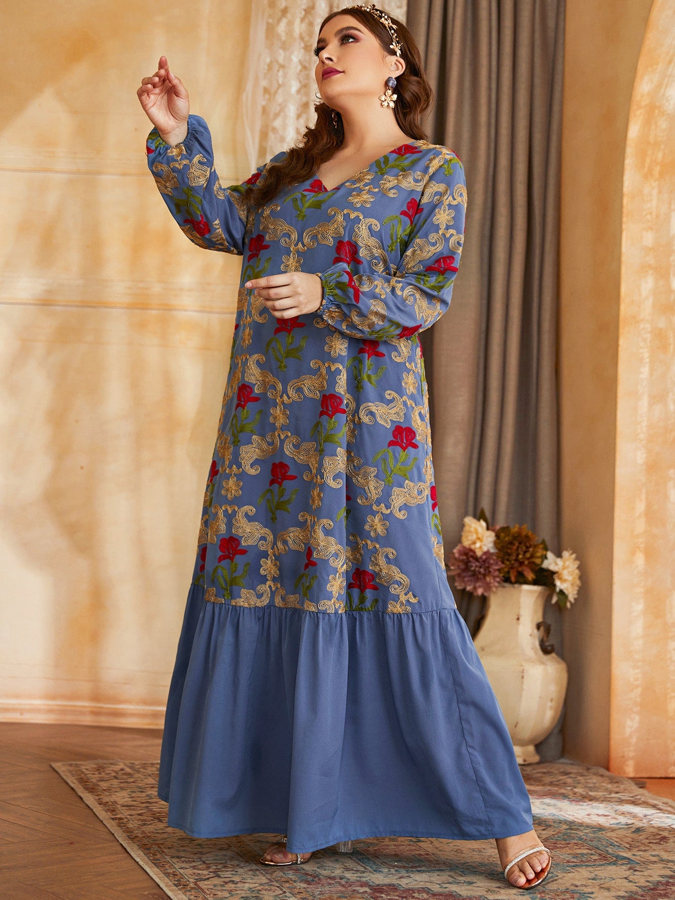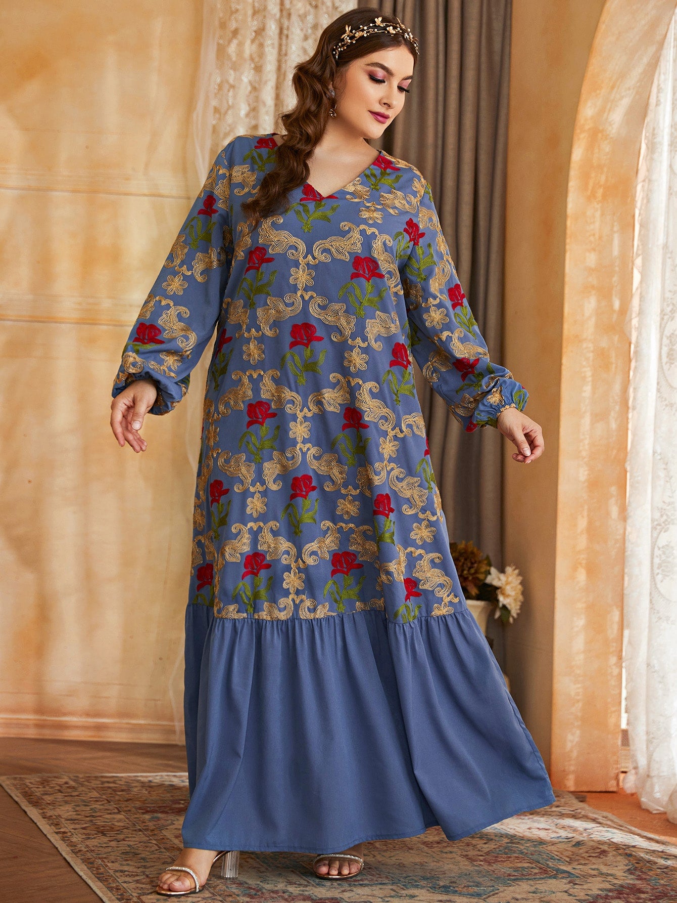 Plus Floral Appliques Lantern Sleeve Ruffle Hem Dress