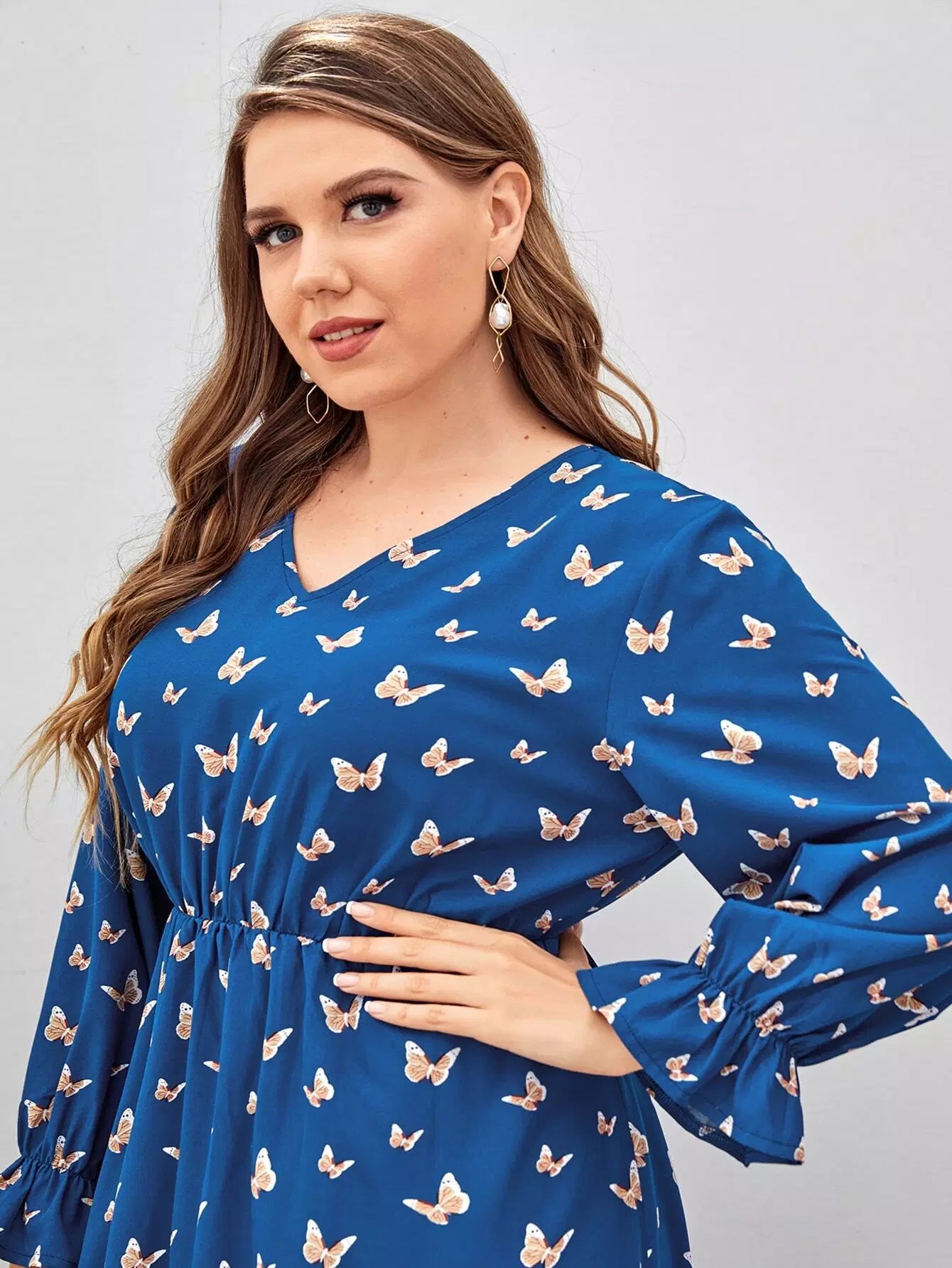 Plus Allover Butterfly Print V-neck Flounce Sleeve Dress