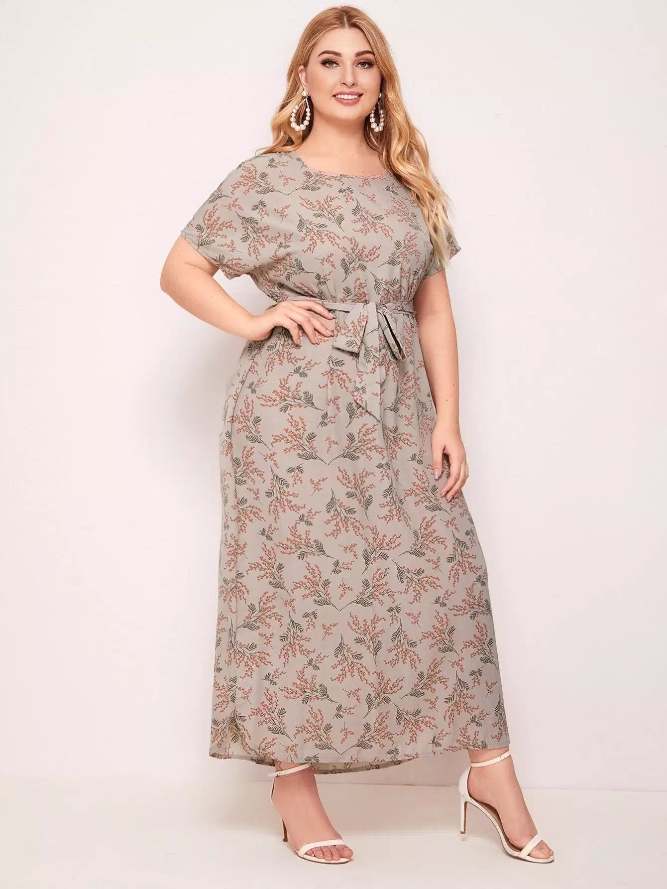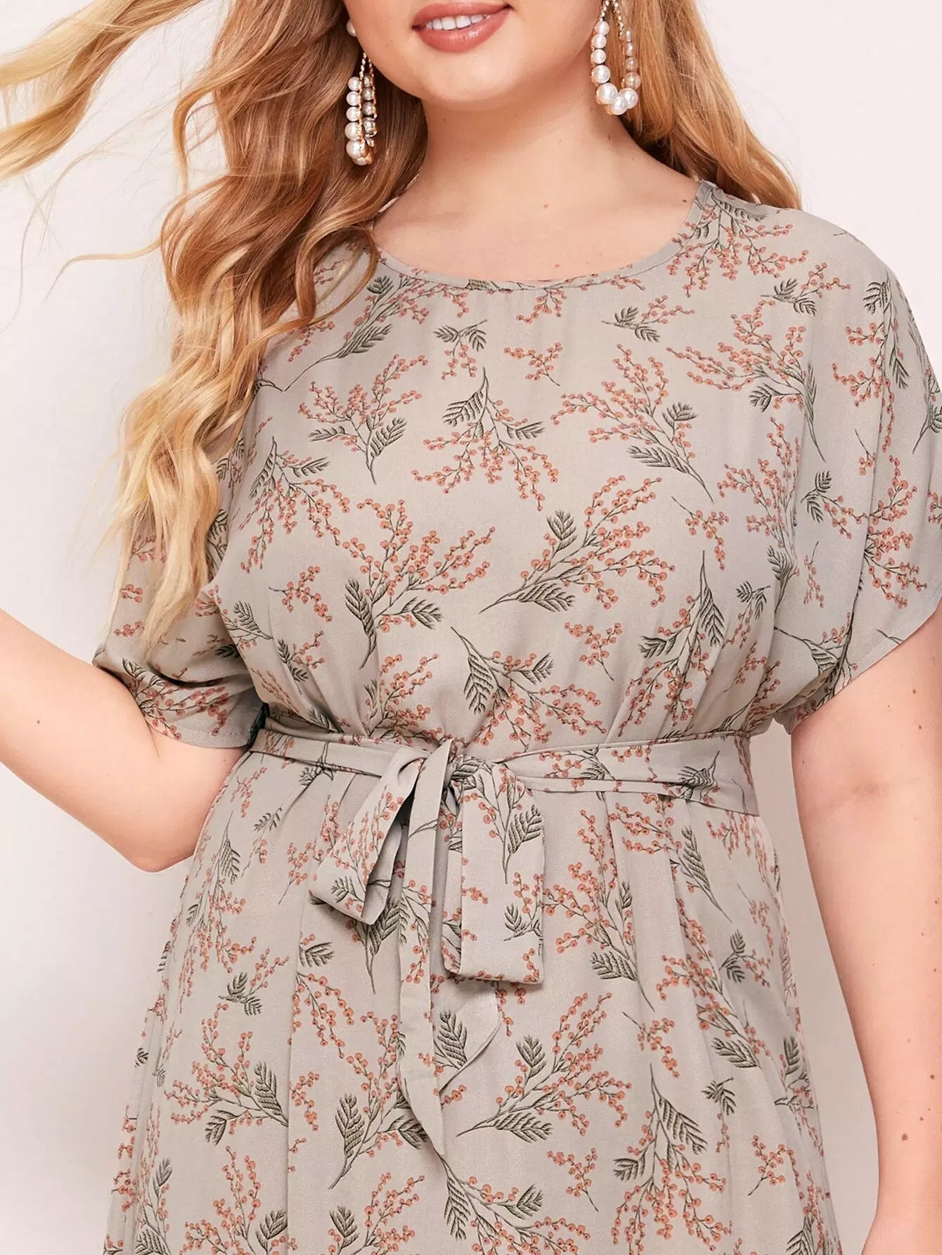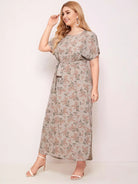 Plus Batwing Sleeve Curved Hem Floral Dress Without Belt