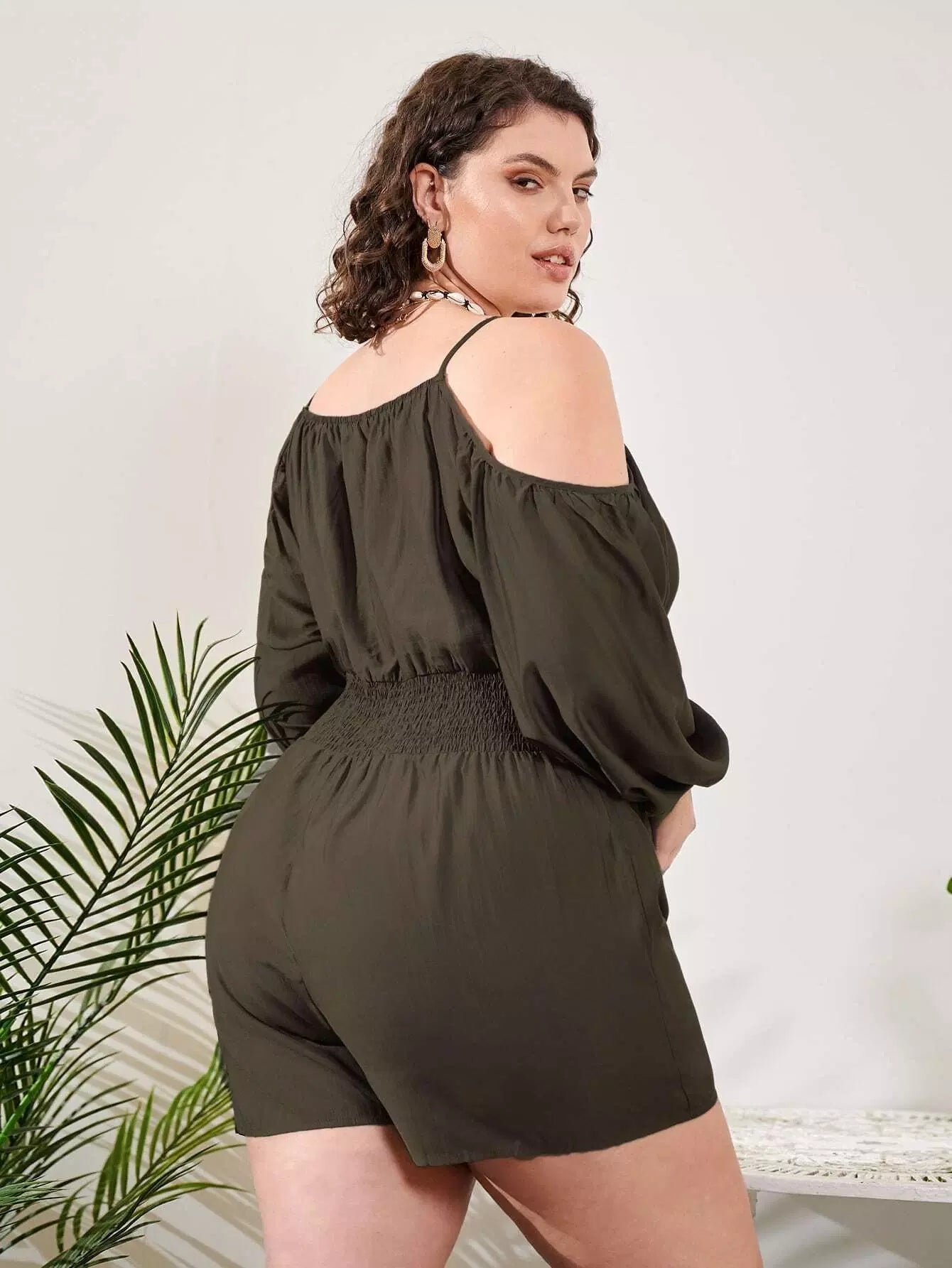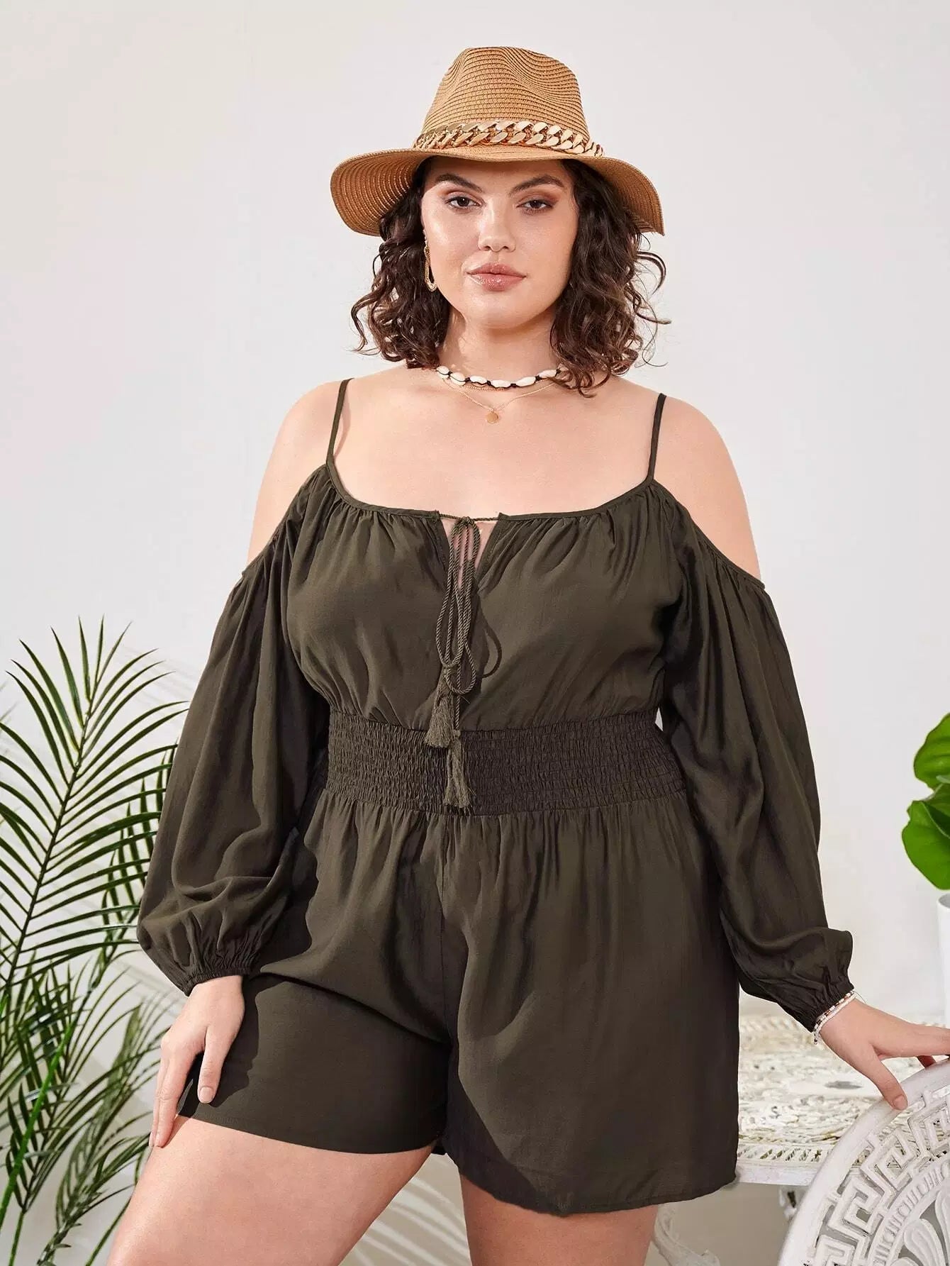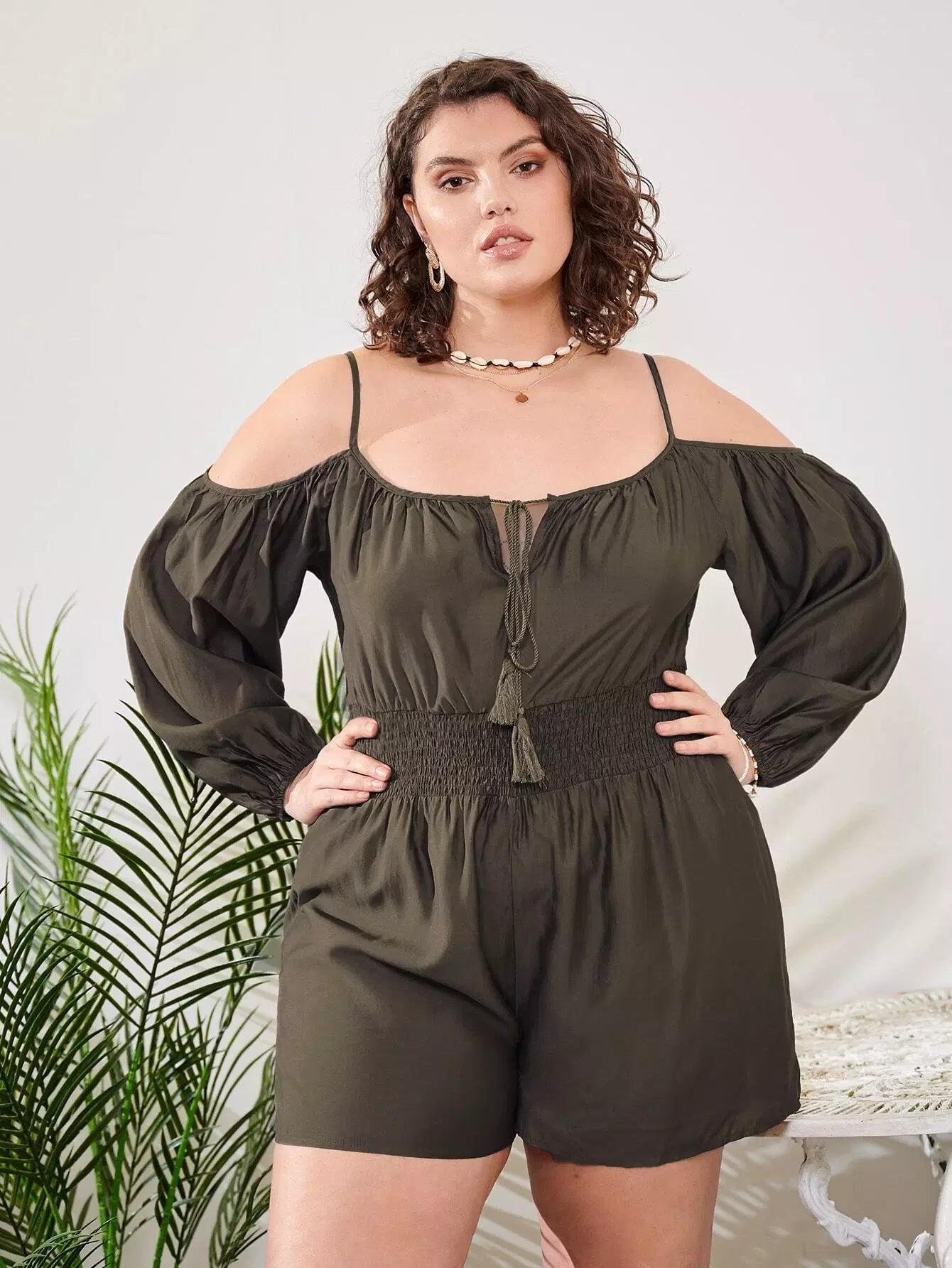 Plus Cold Shoulder Tassel Tie Shirred Romper