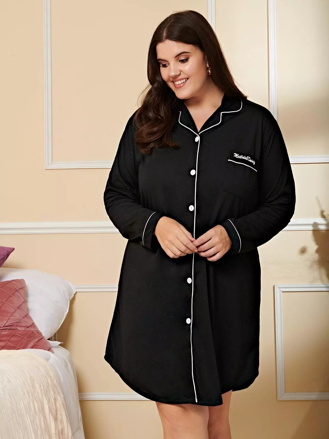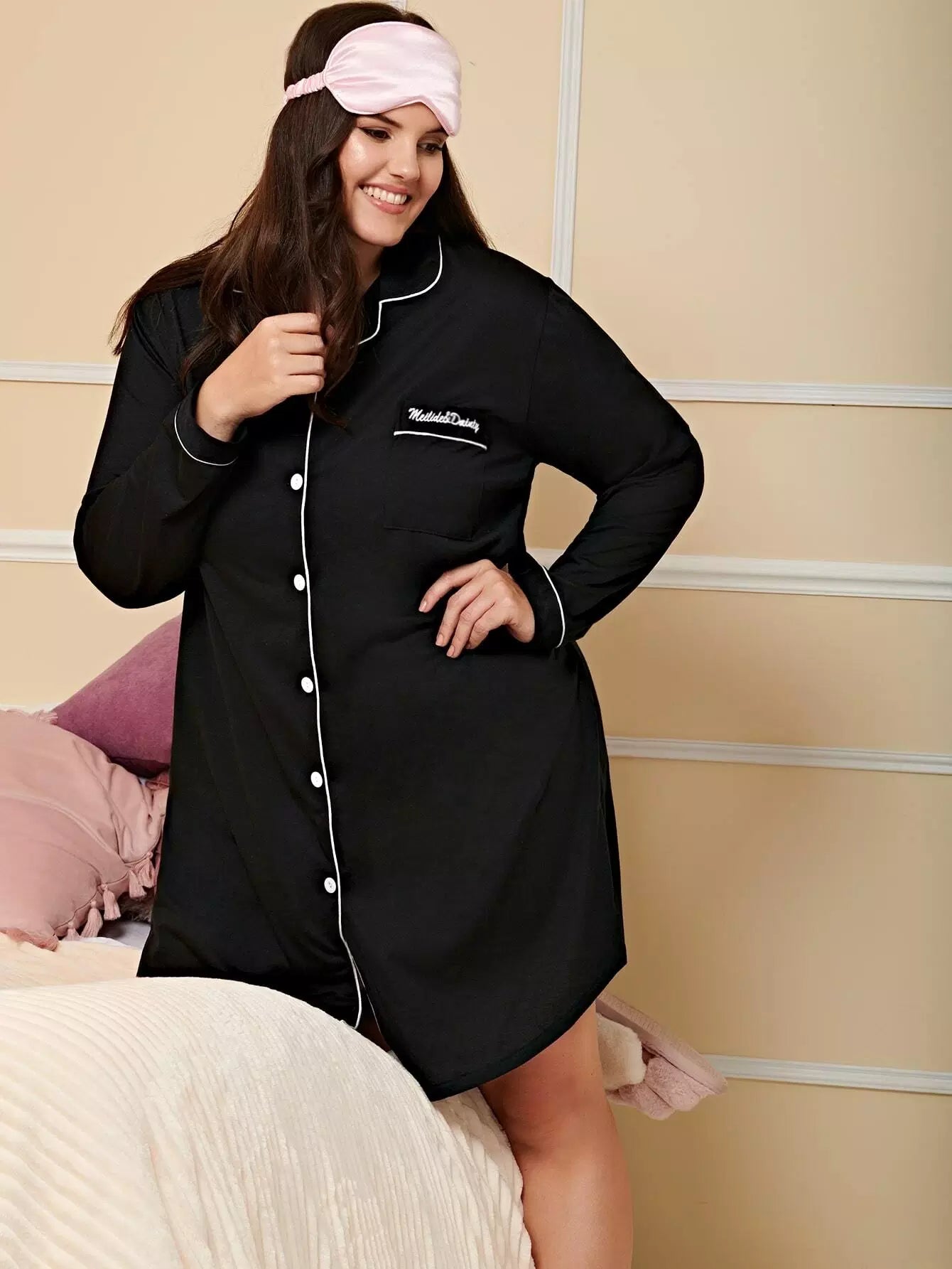 Plus Contrast Binding Letter Embroidery Night Dress Without Eye Mask