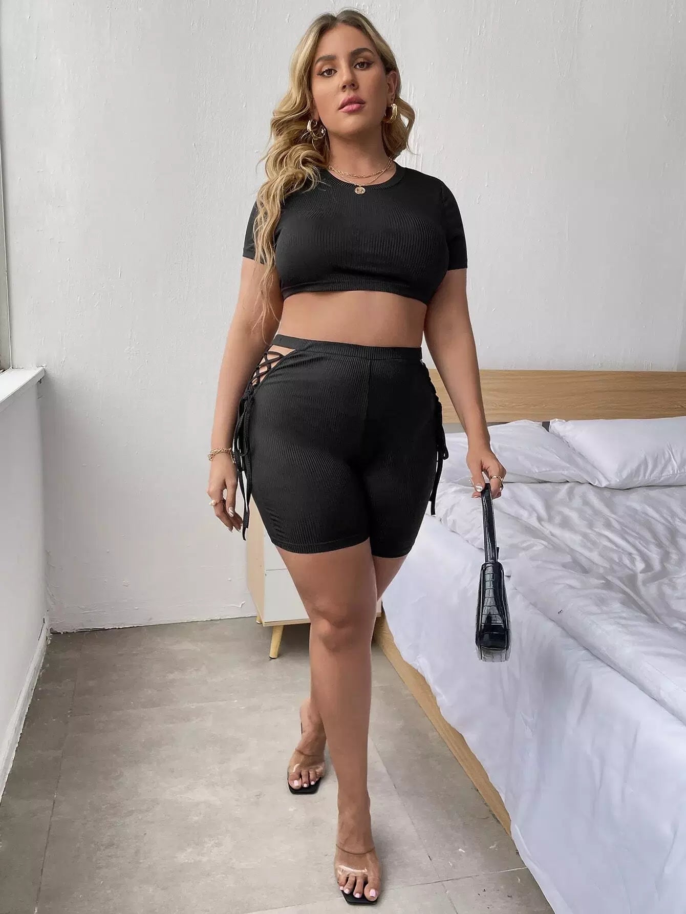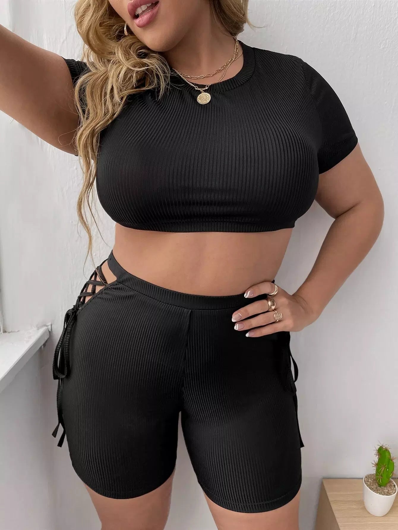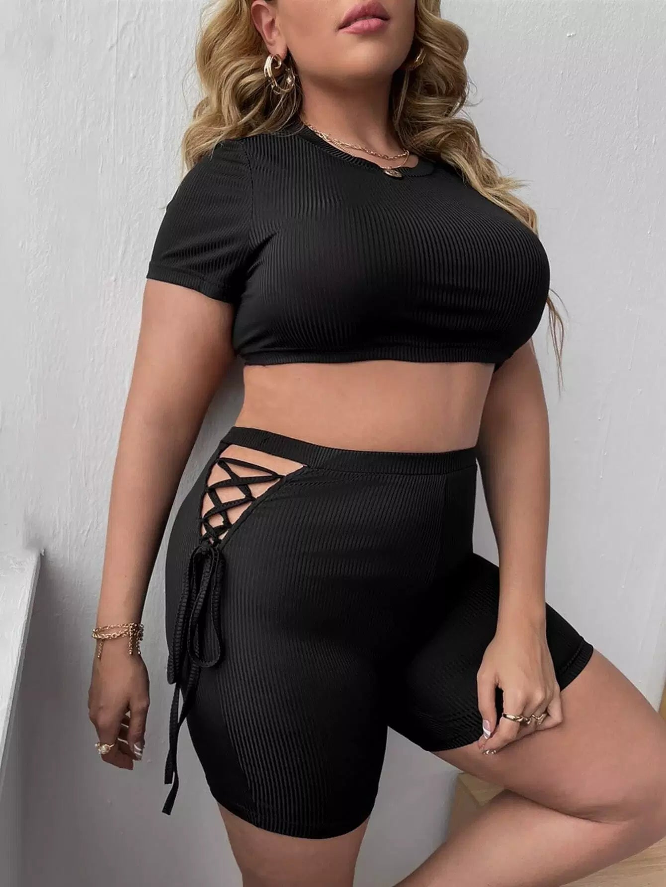 Plus Crop Rib-knit Tee With Lace Up Side Biker Shorts
