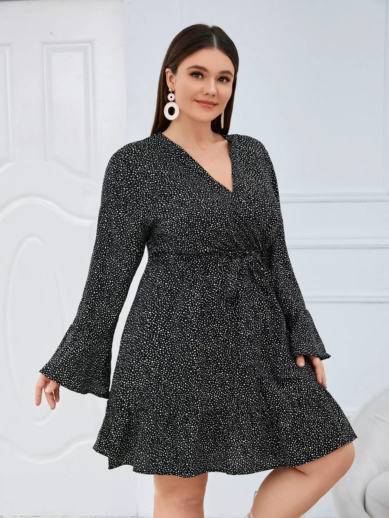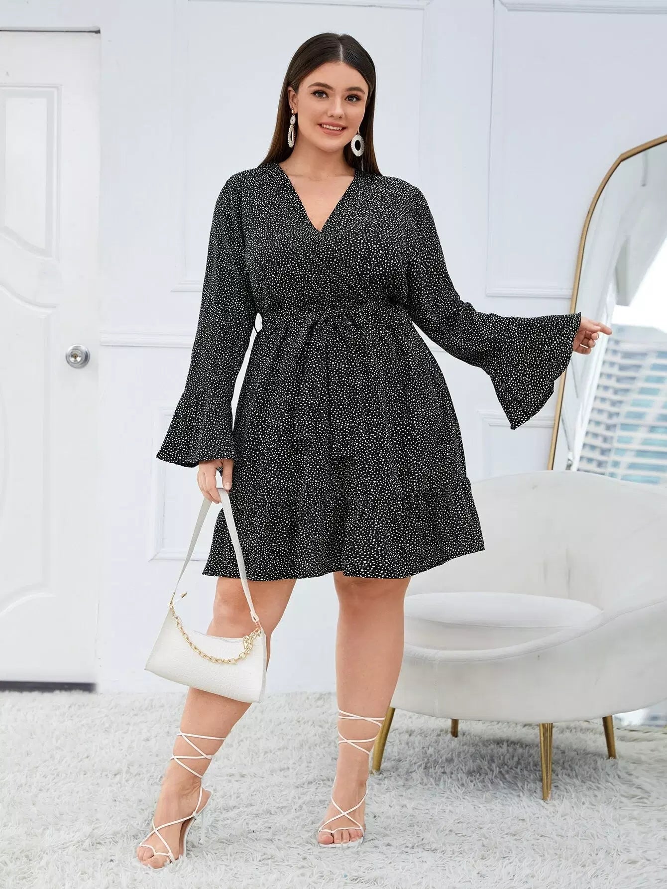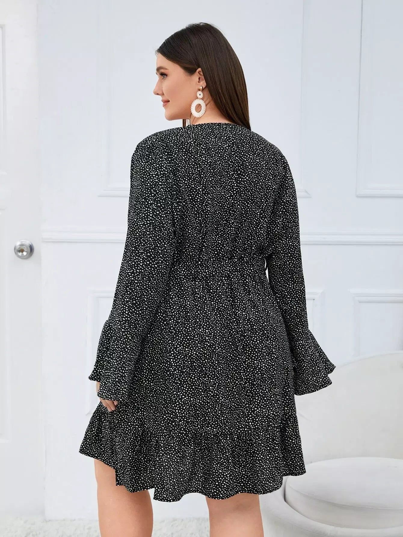 Plus Dalmatian Print Flounce Sleeve Ruffle Hem Dress Without Belt