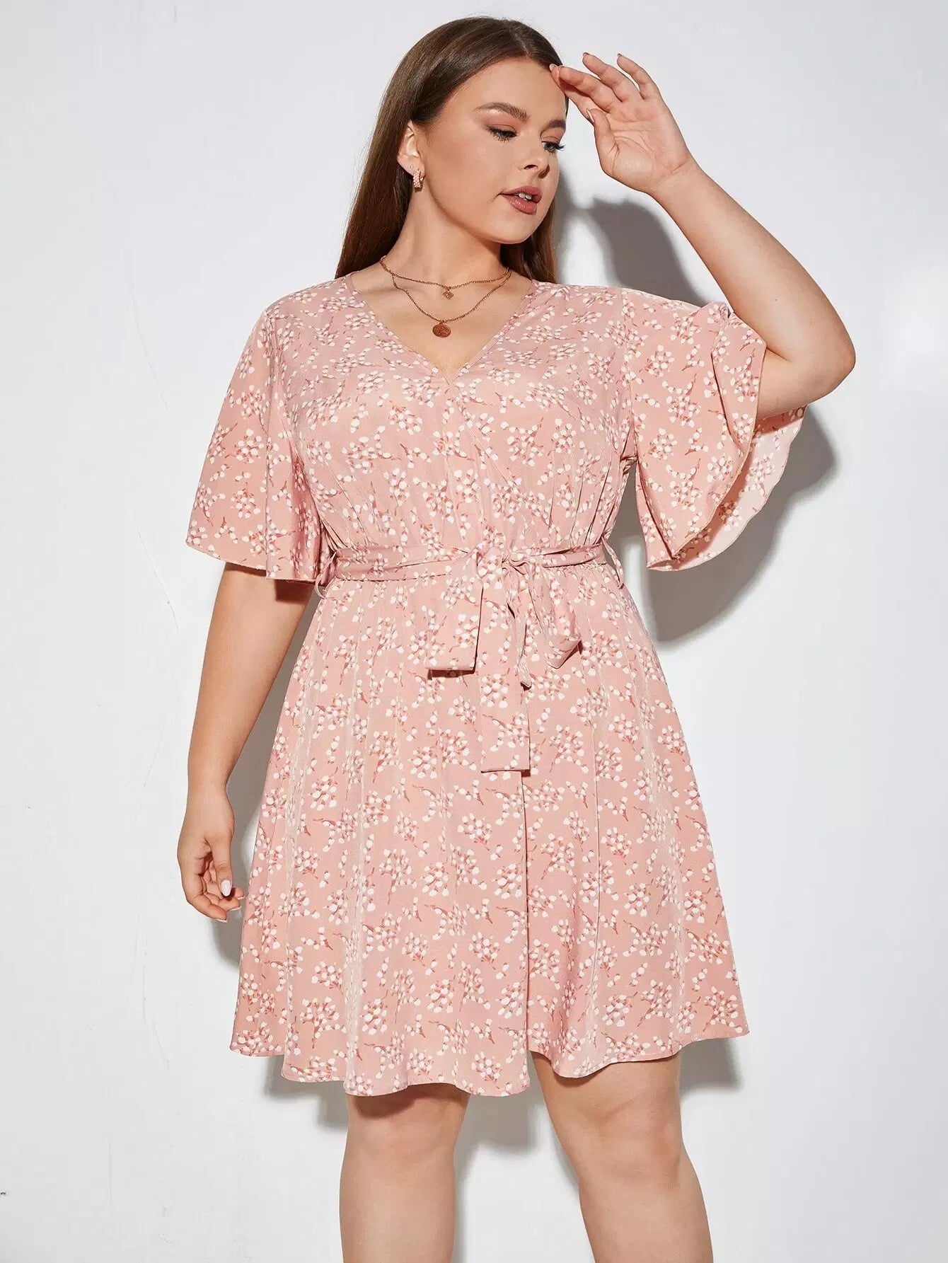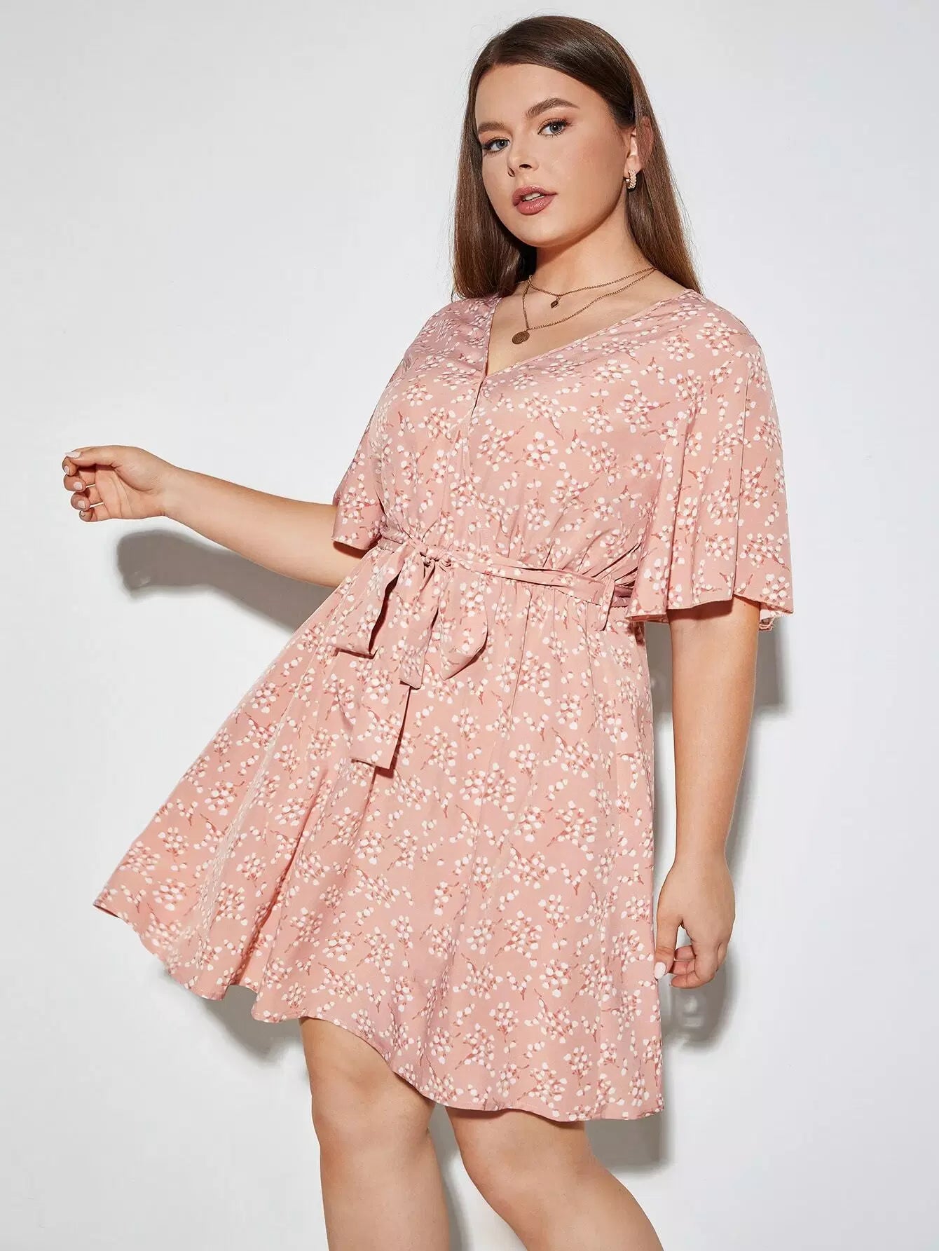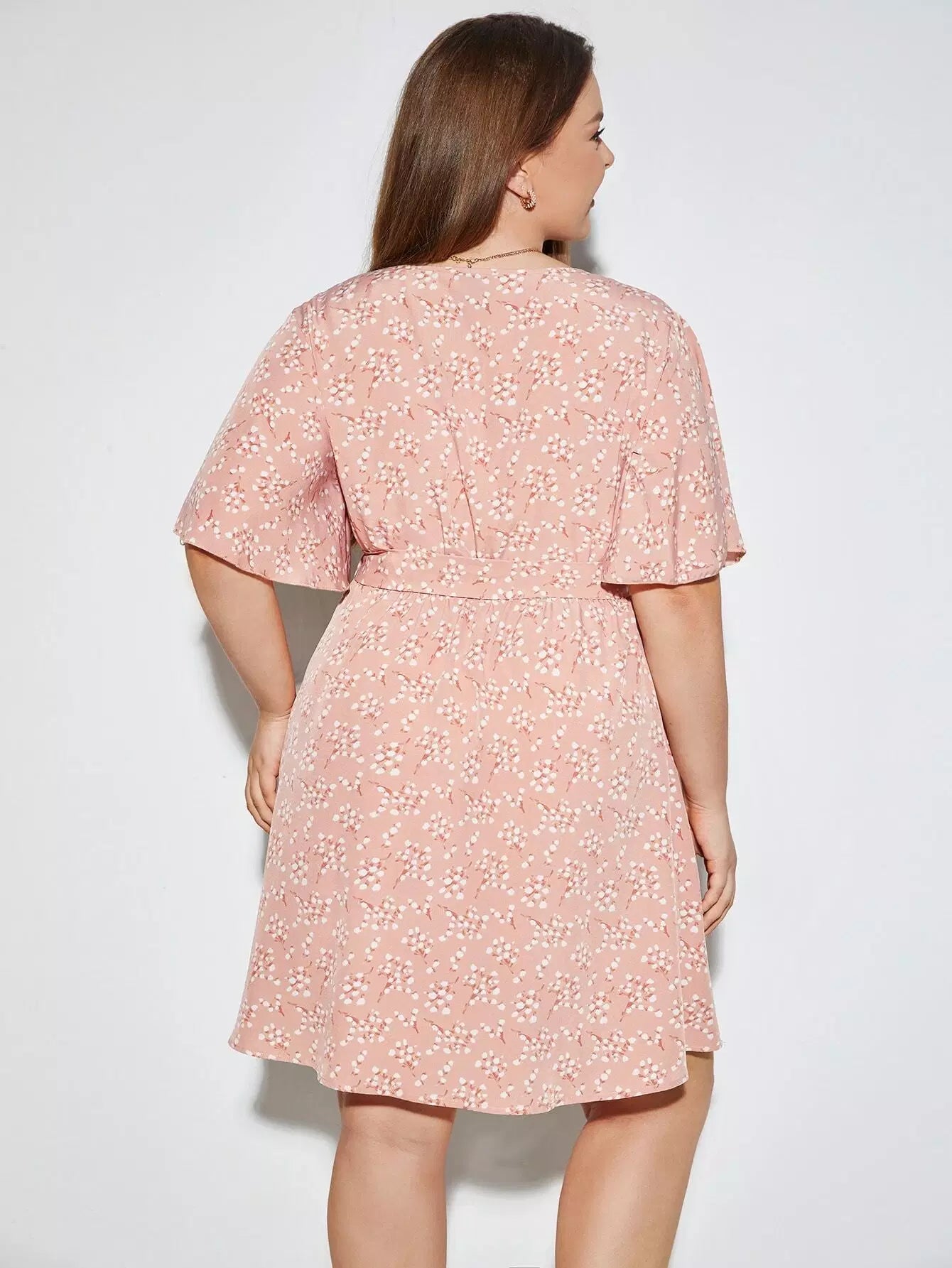 Plus Ditsy Floral Butterfly Sleeve Dress Without Belt