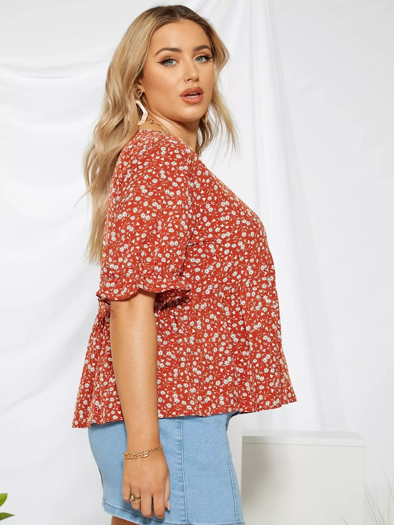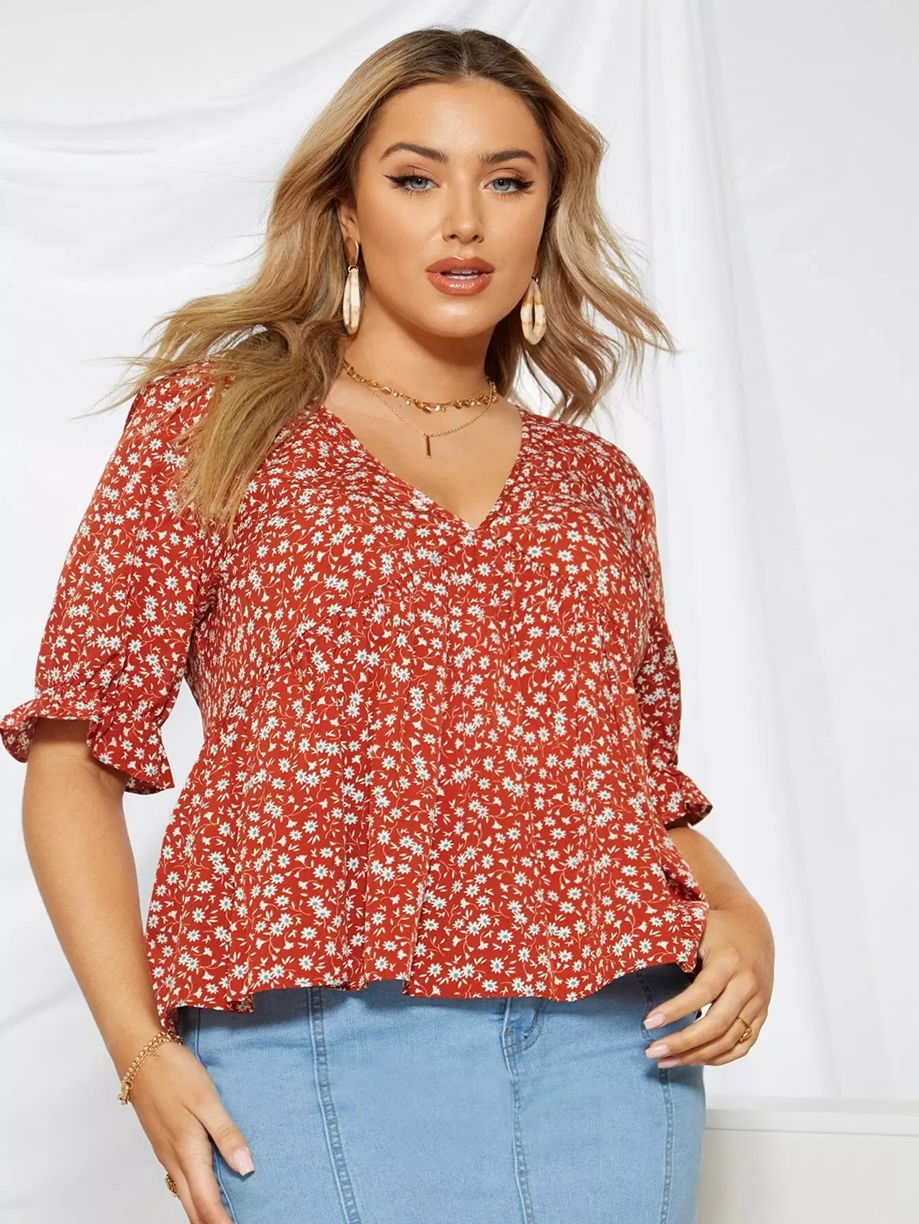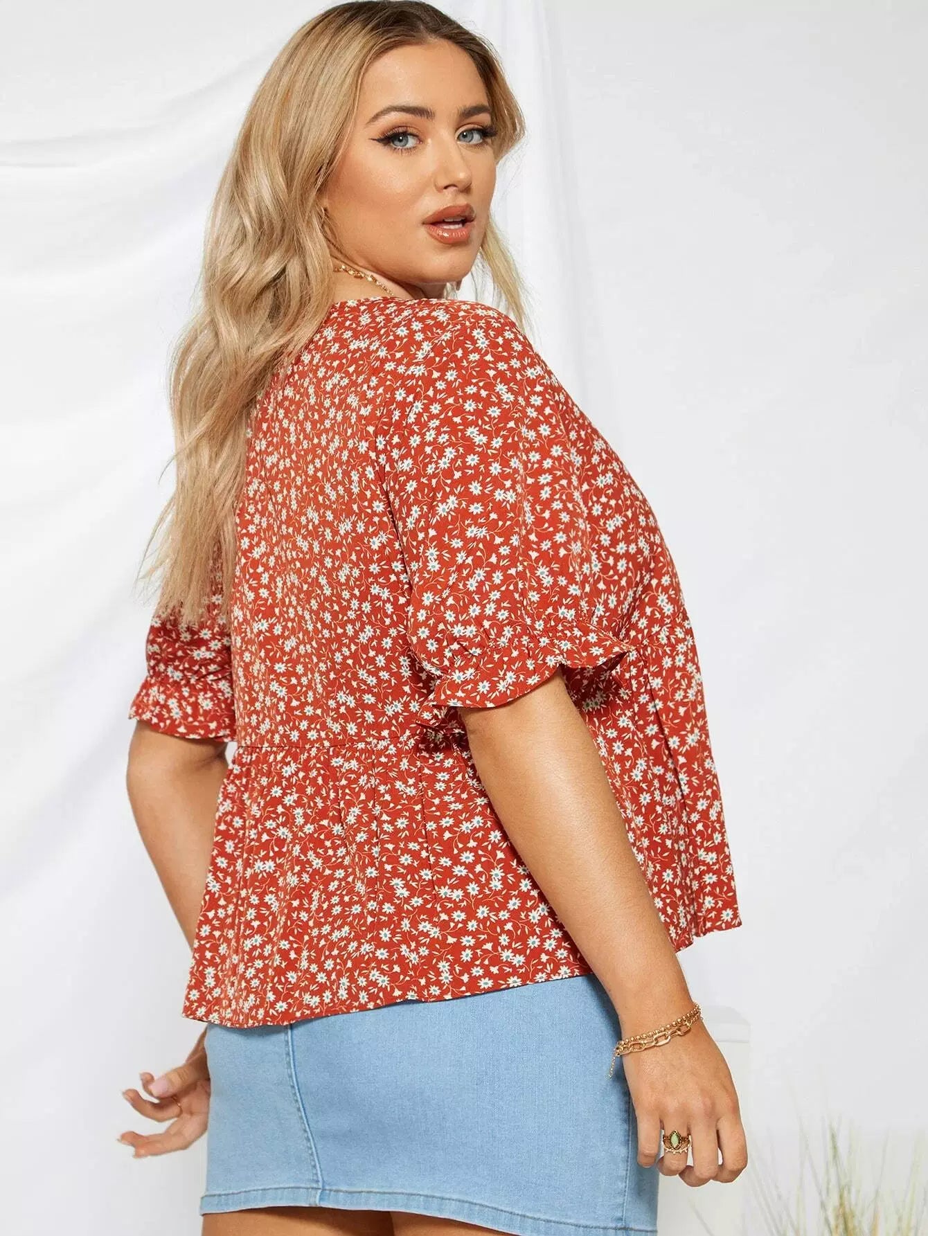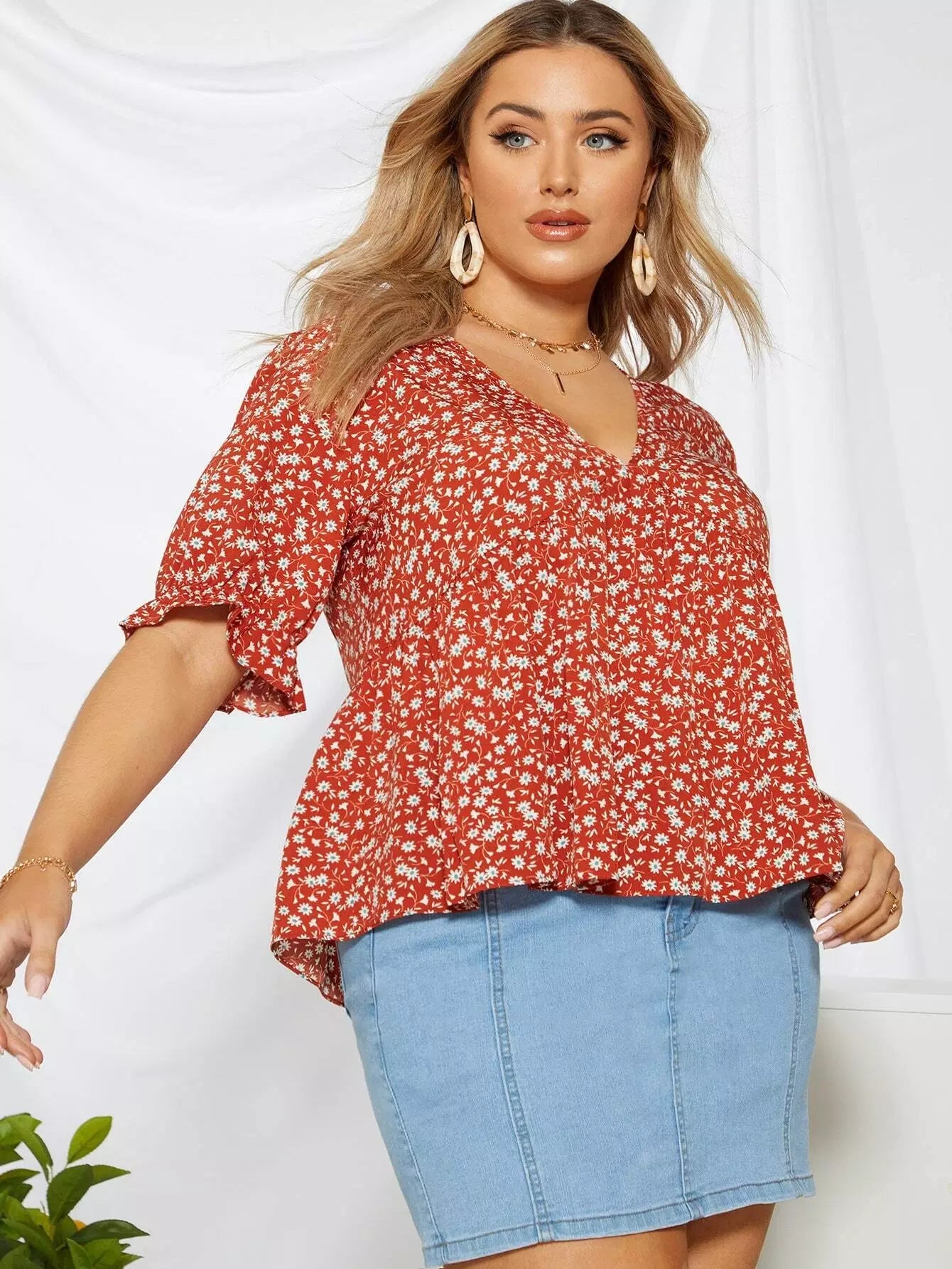 Plus Ditsy Floral Flounce Sleeve V Neck Blouse
