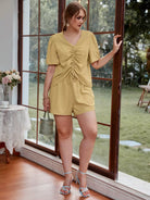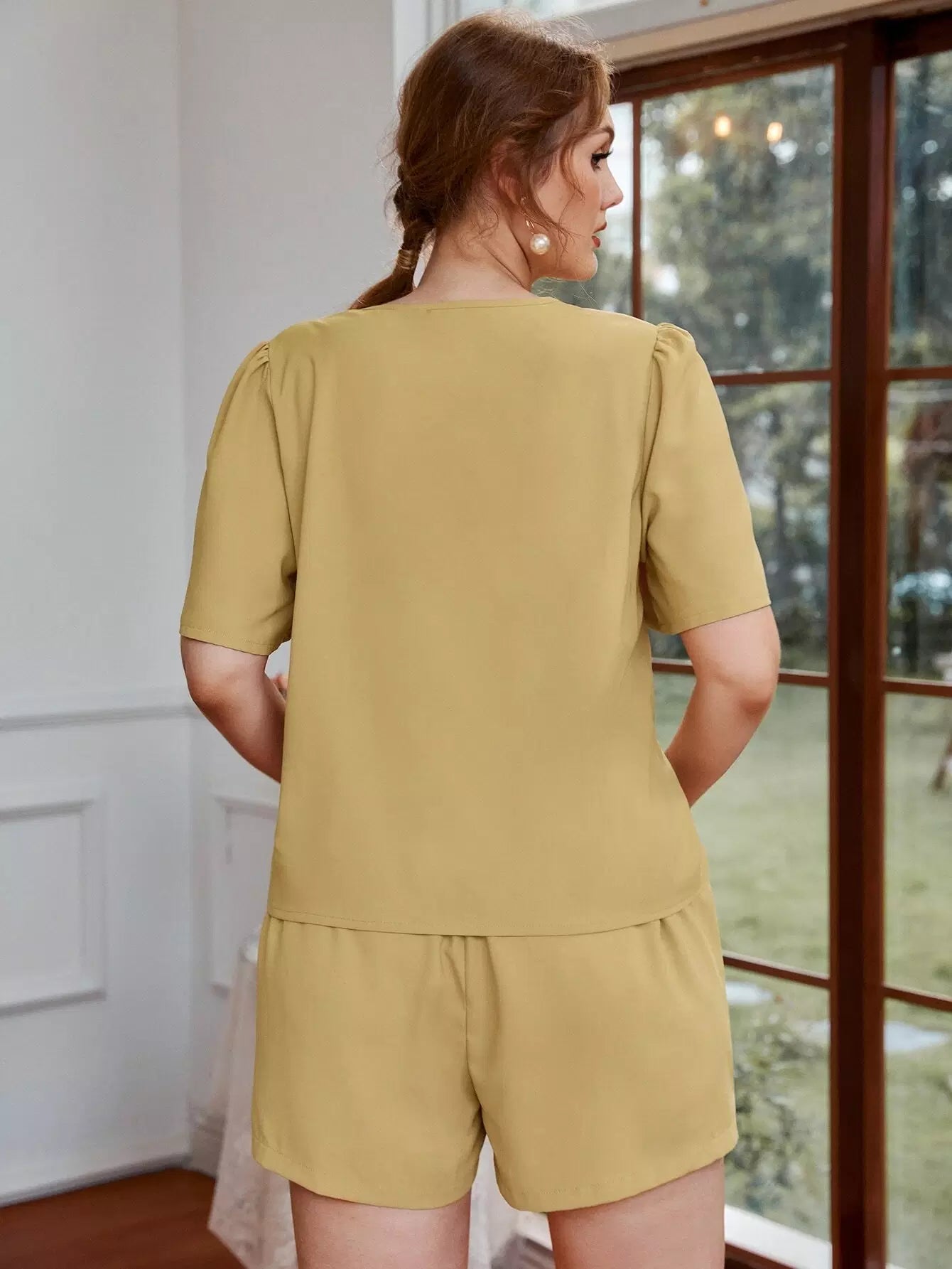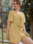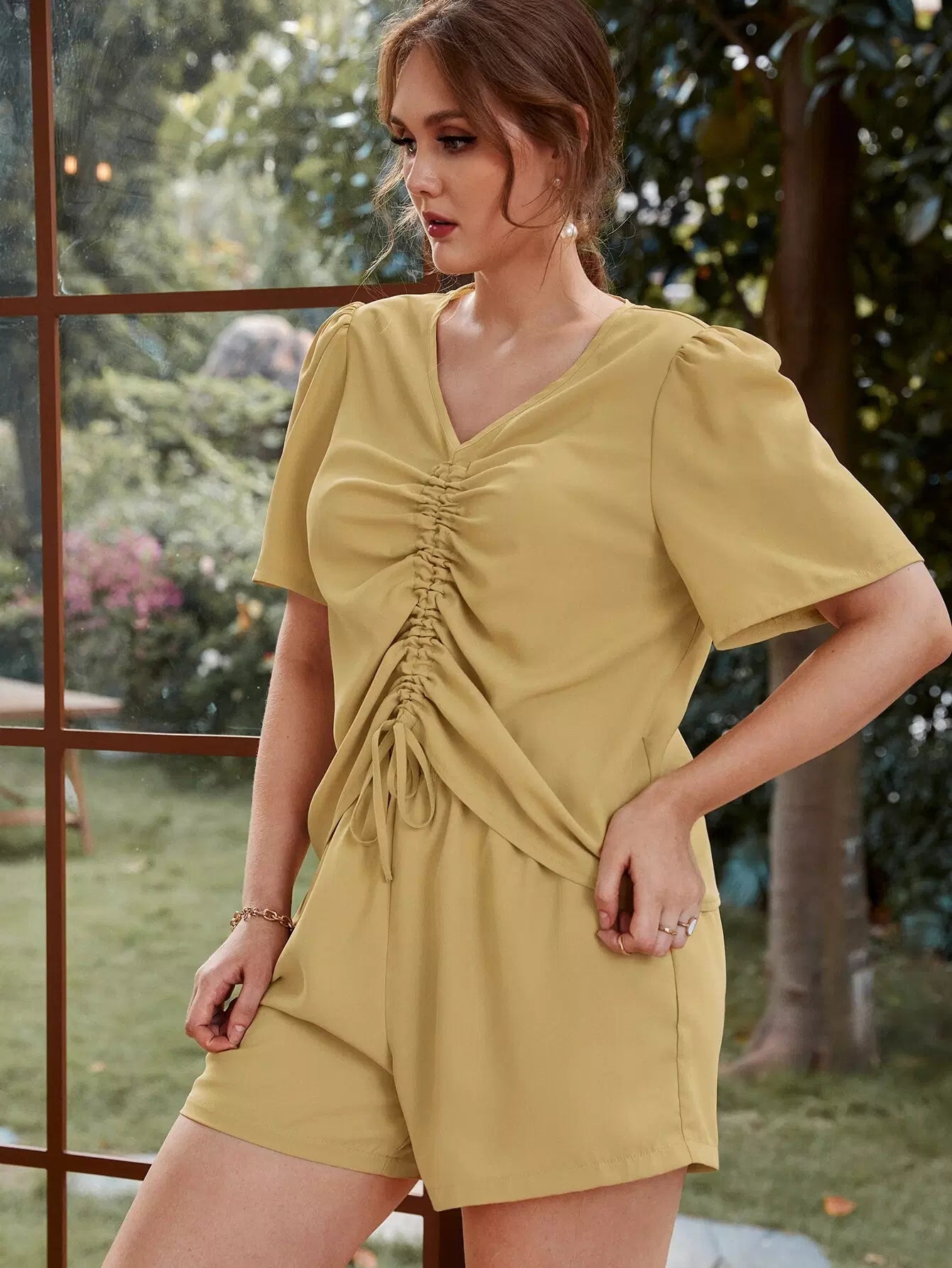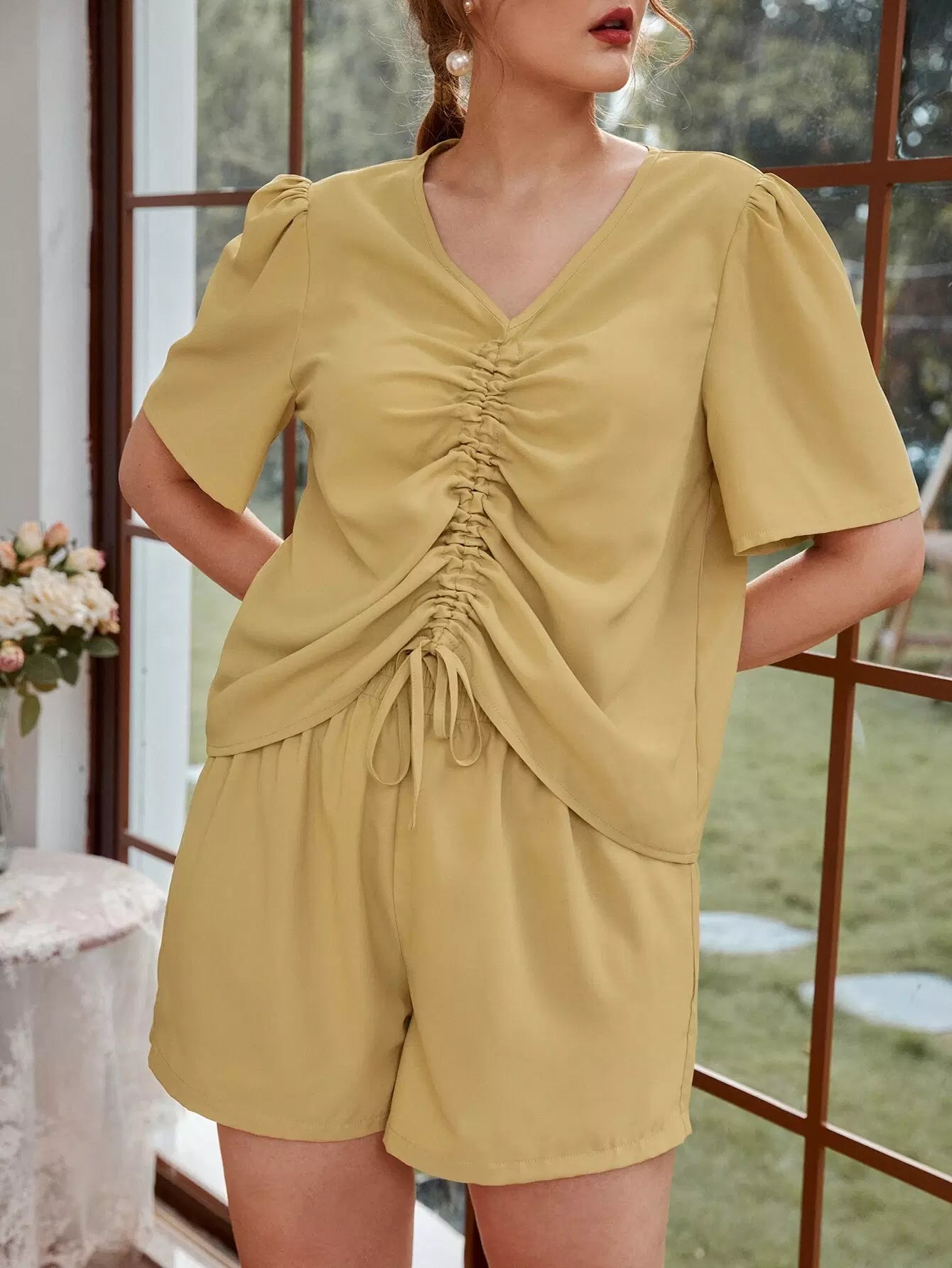 Plus Drawstring Front Puff Sleeve Top & Shorts