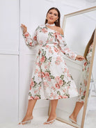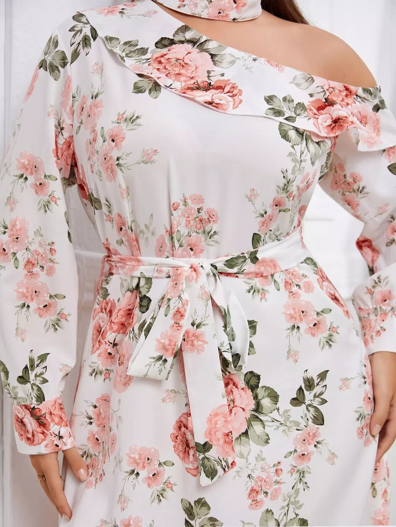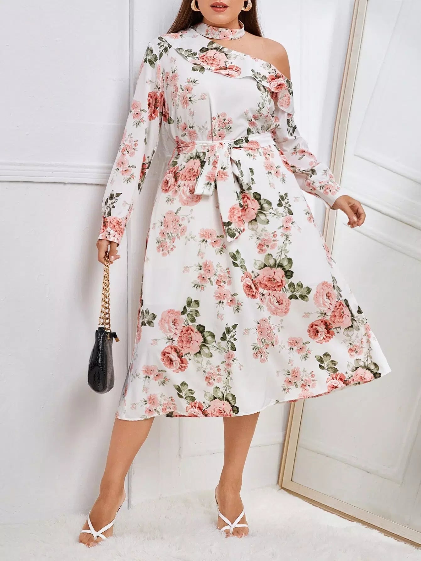 Women - Plus Floral Print Asymmetrical Neck Ruffle Trim Belted Dress