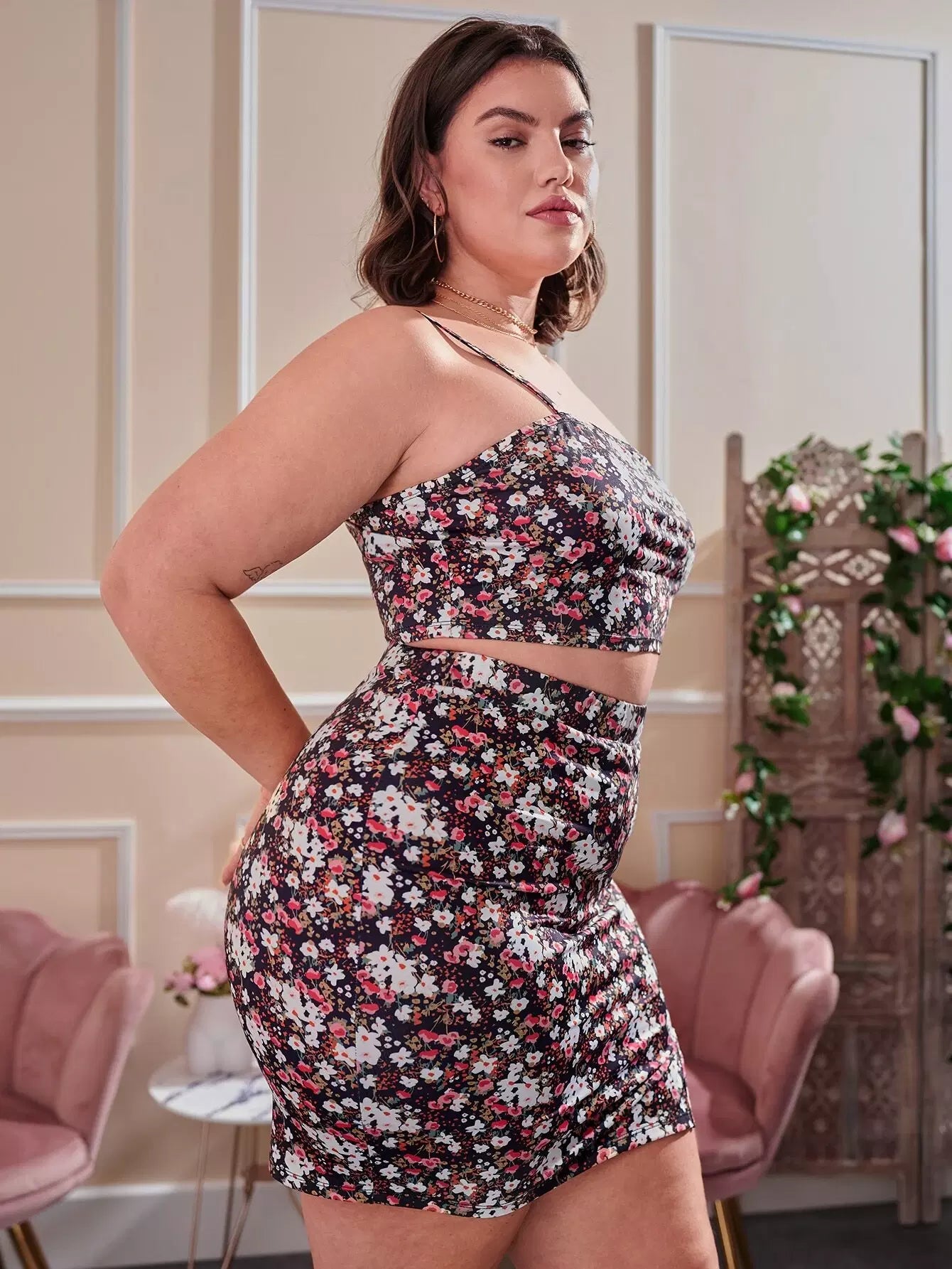 Plus Floral Print Cami Top & Split Hem Skirt Set Without Belt