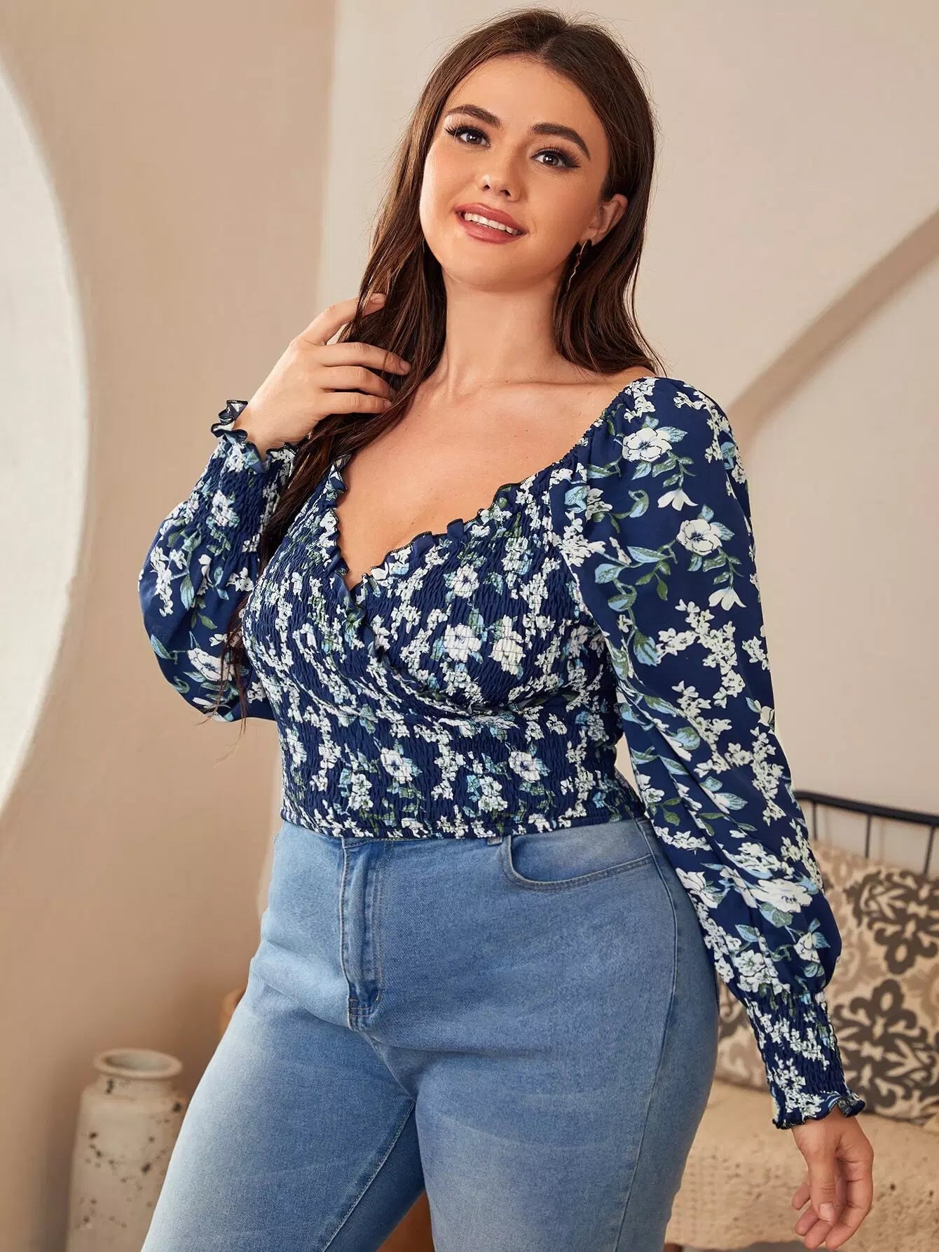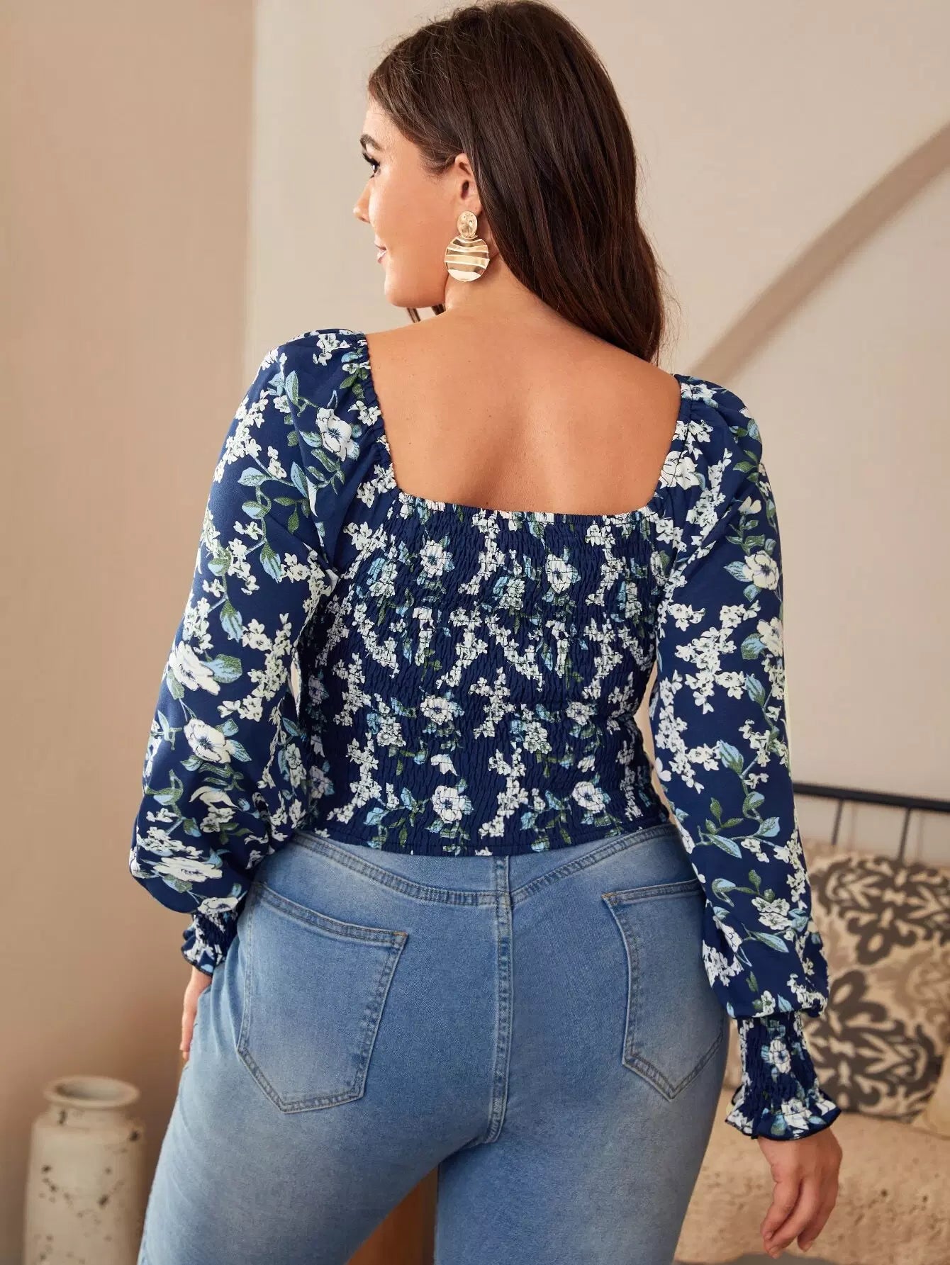 Plus Floral Print Shirred Lantern Sleeve Blouse