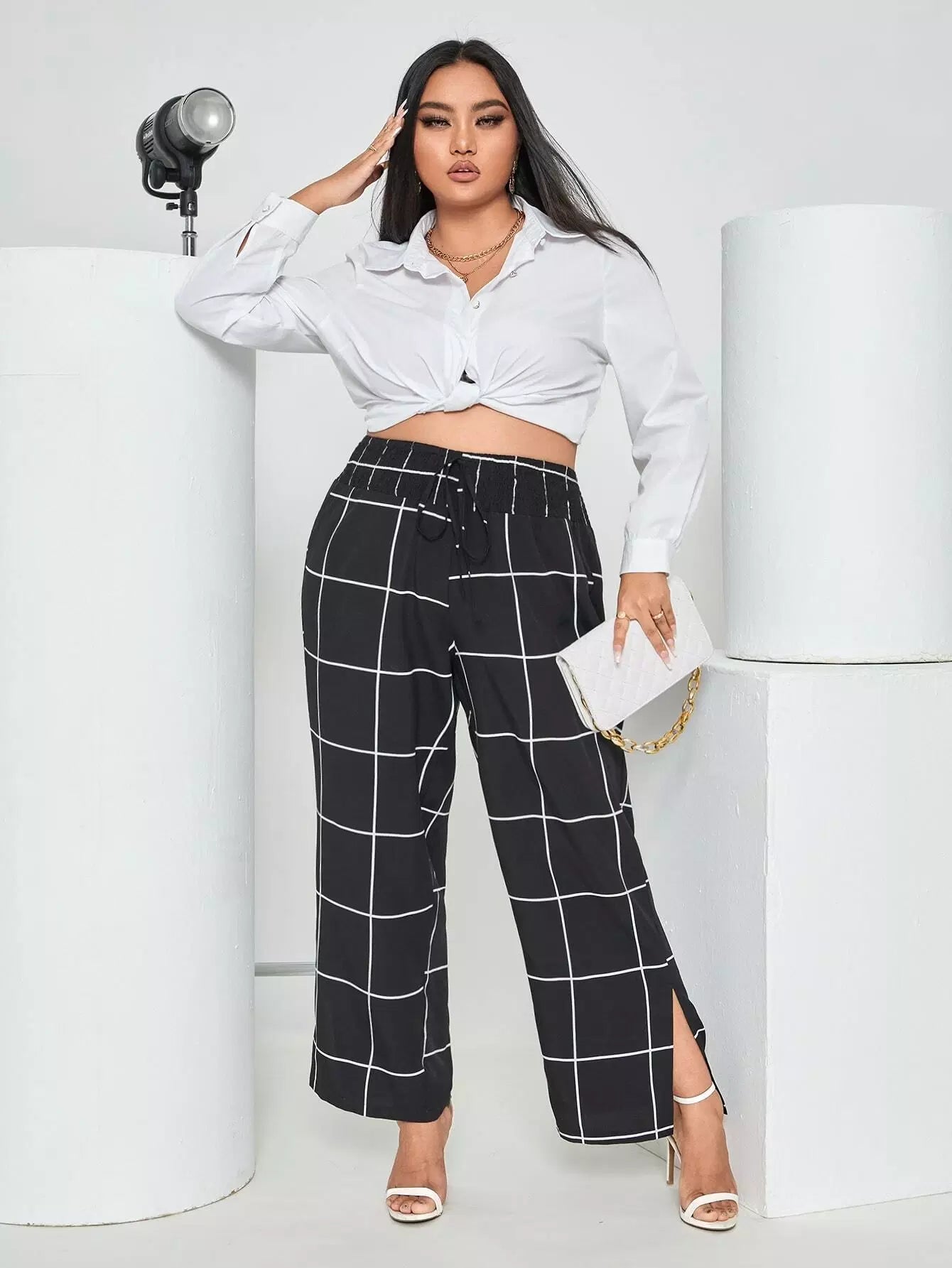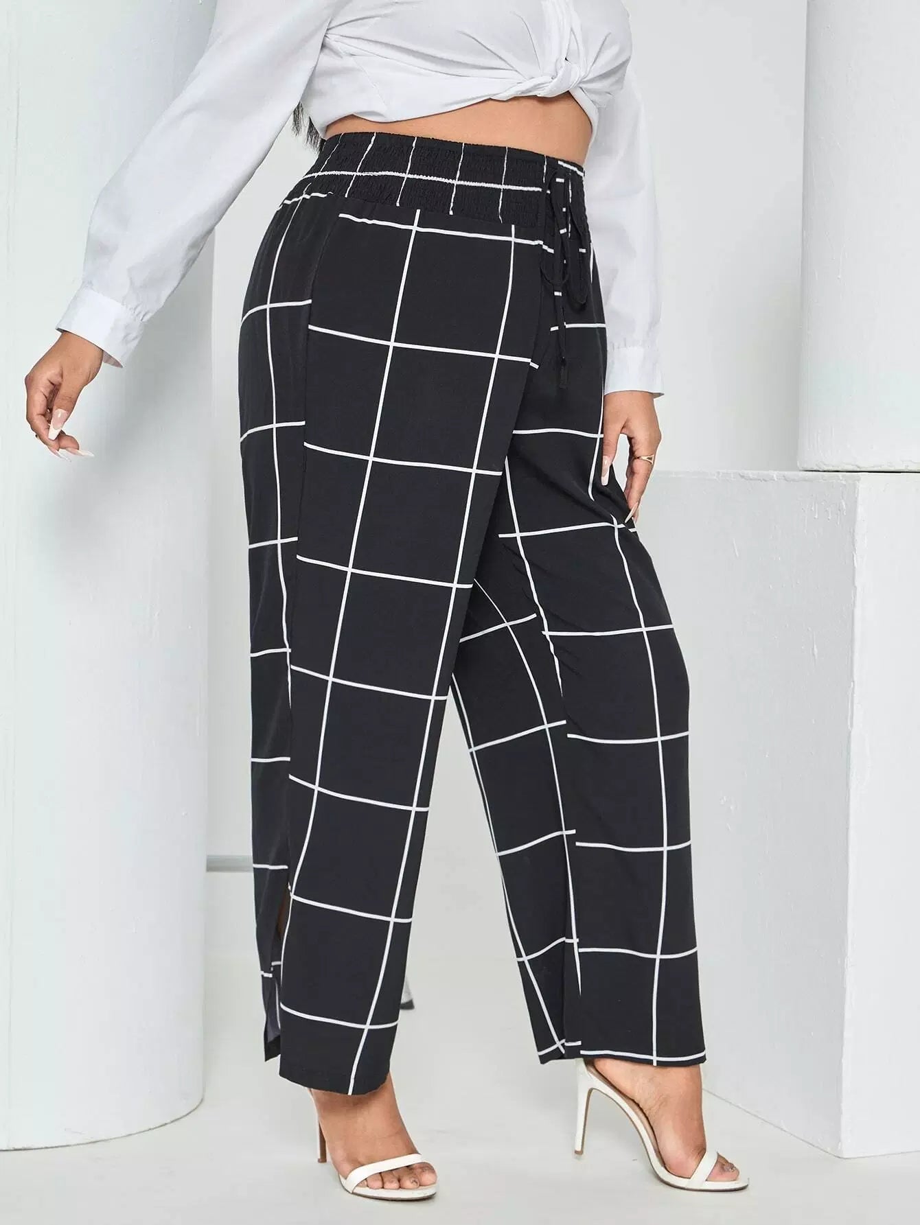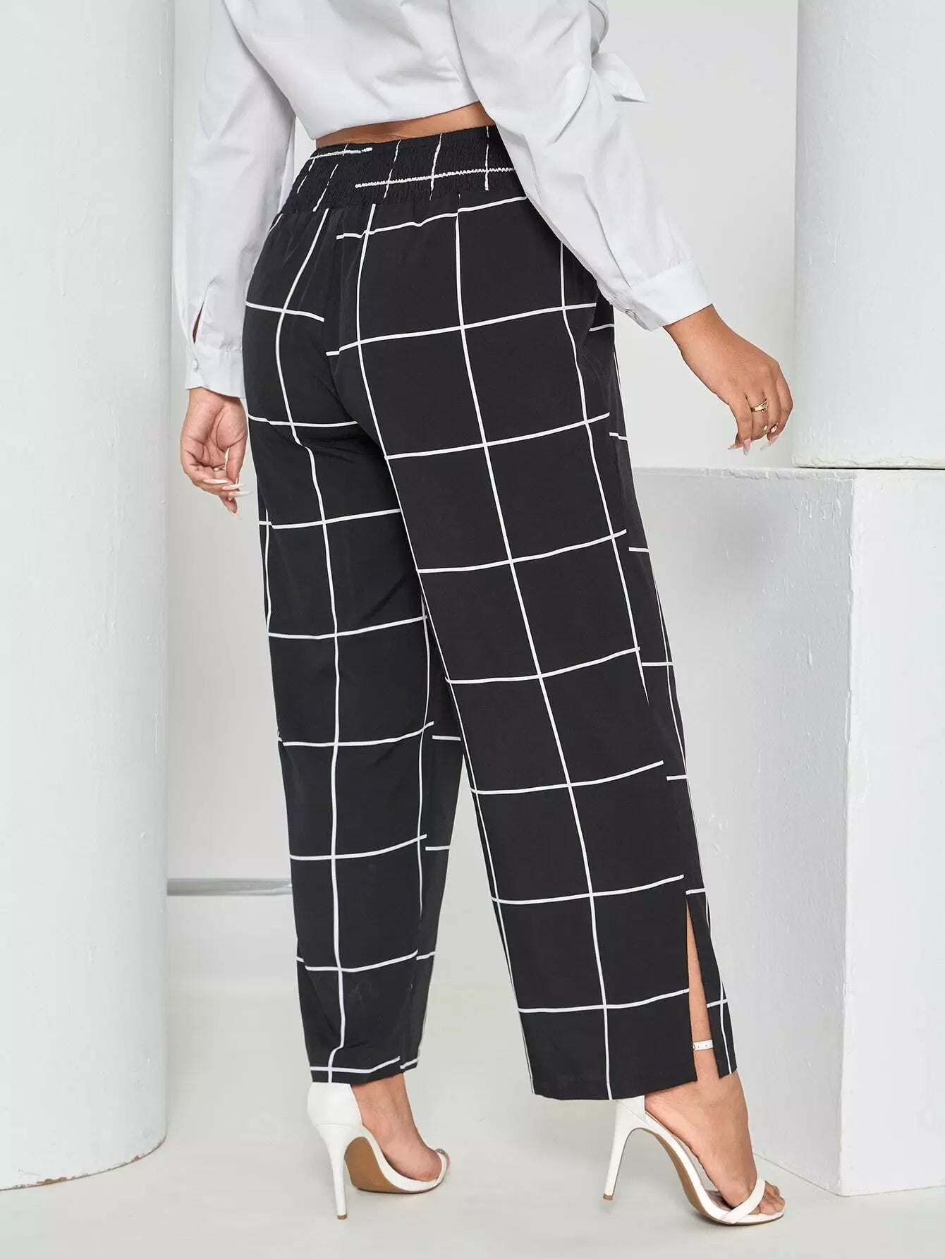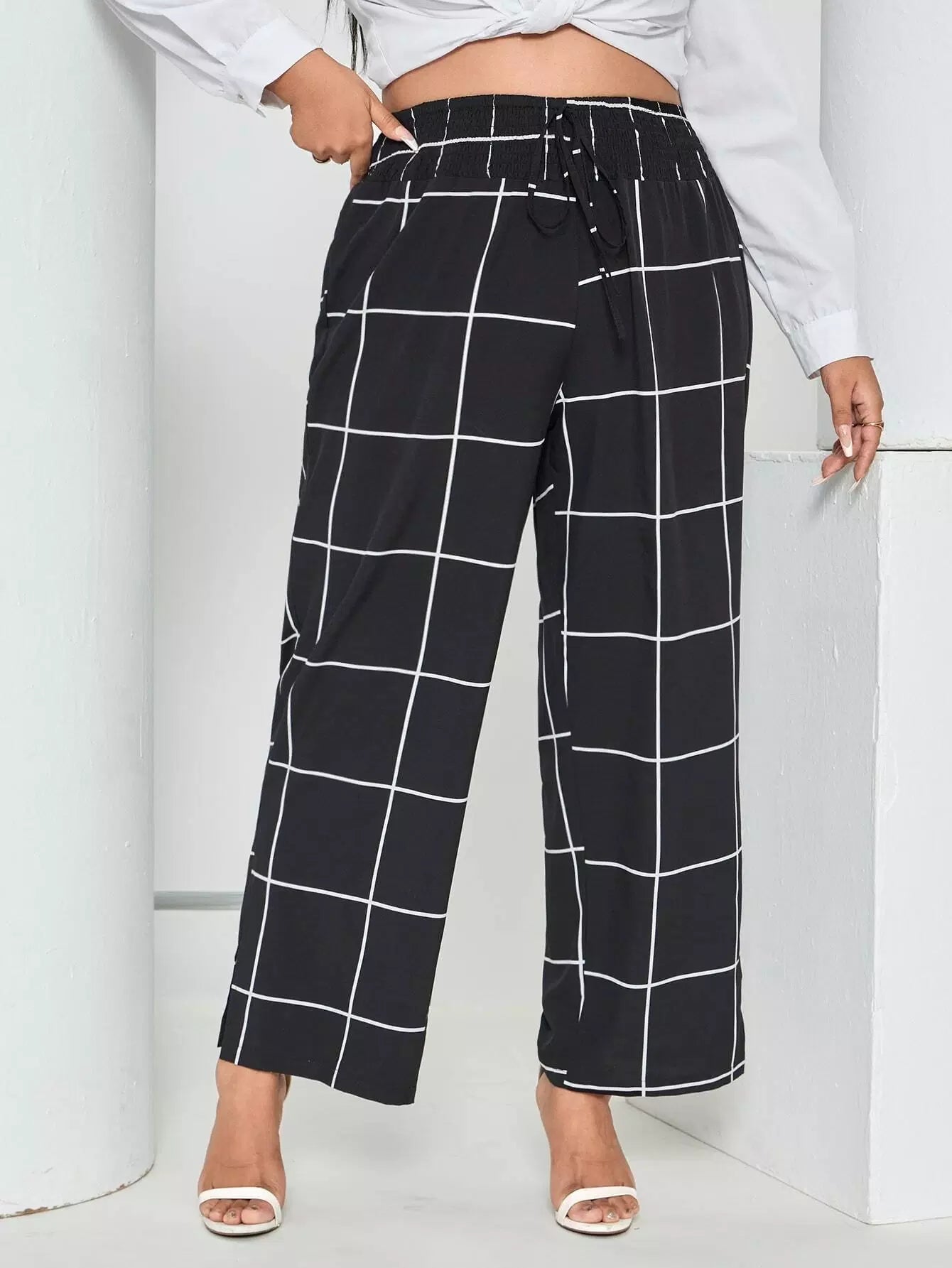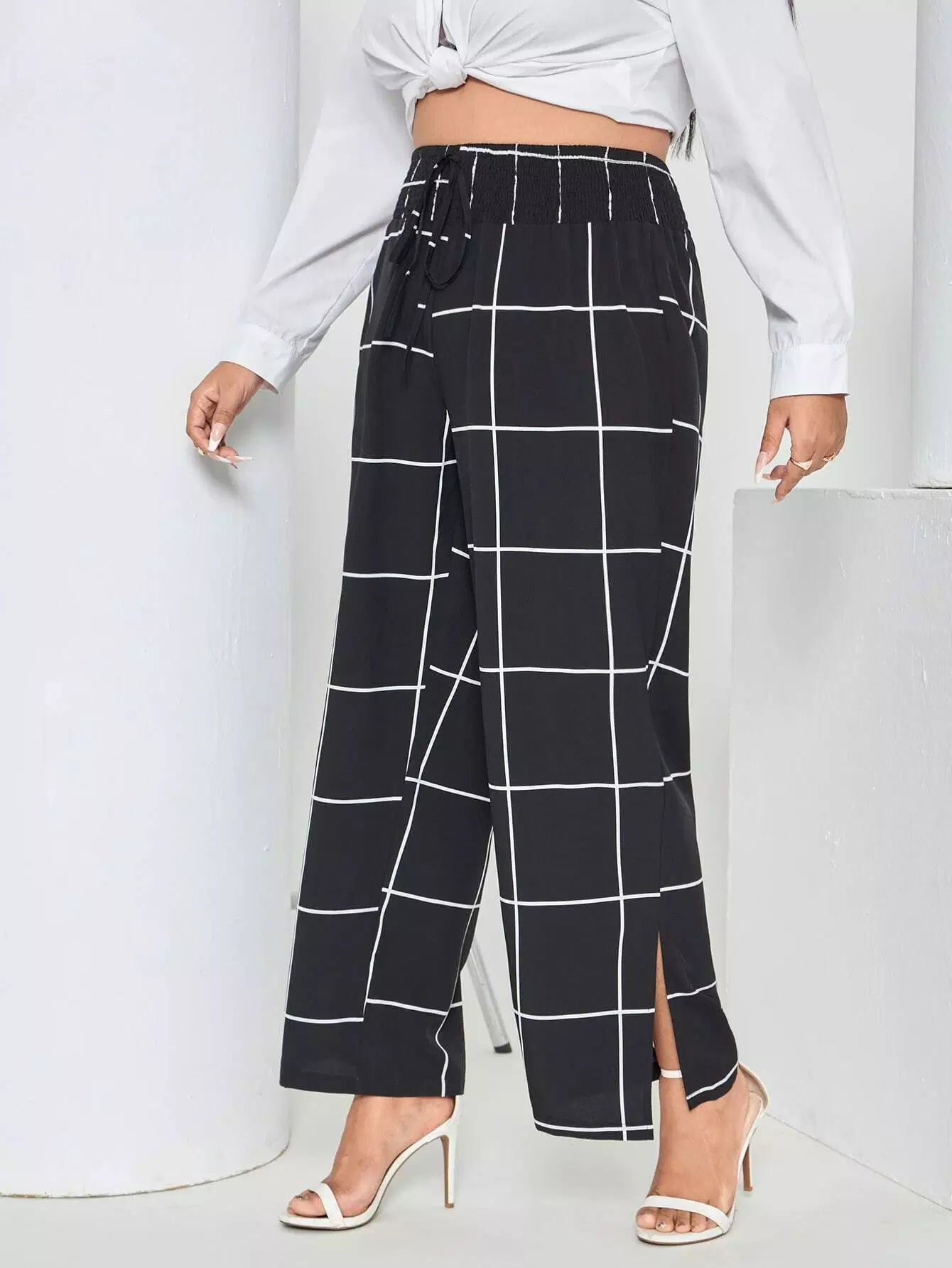 Plus Grid Print Shirred Waist Split Hem Wide Leg Pants