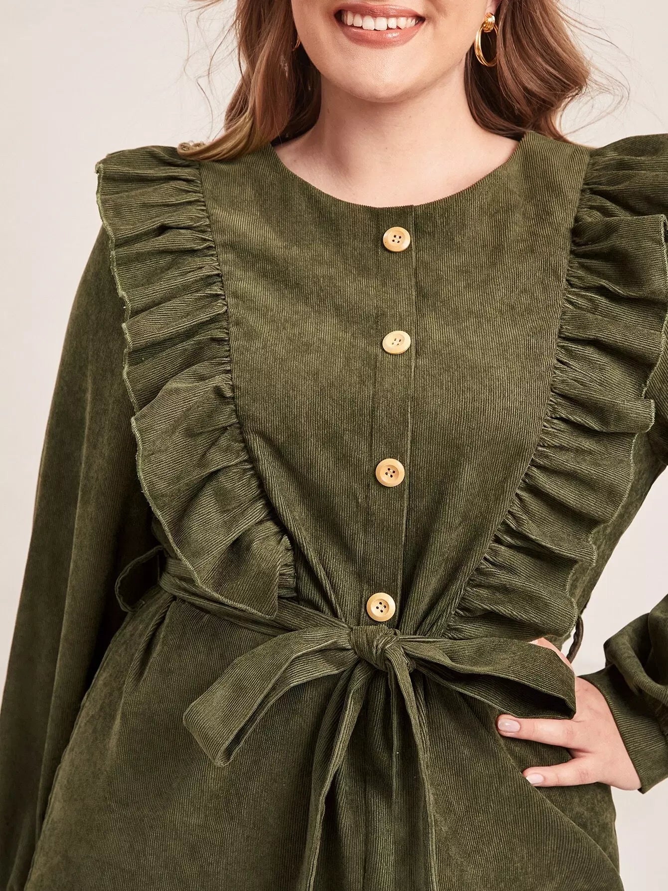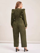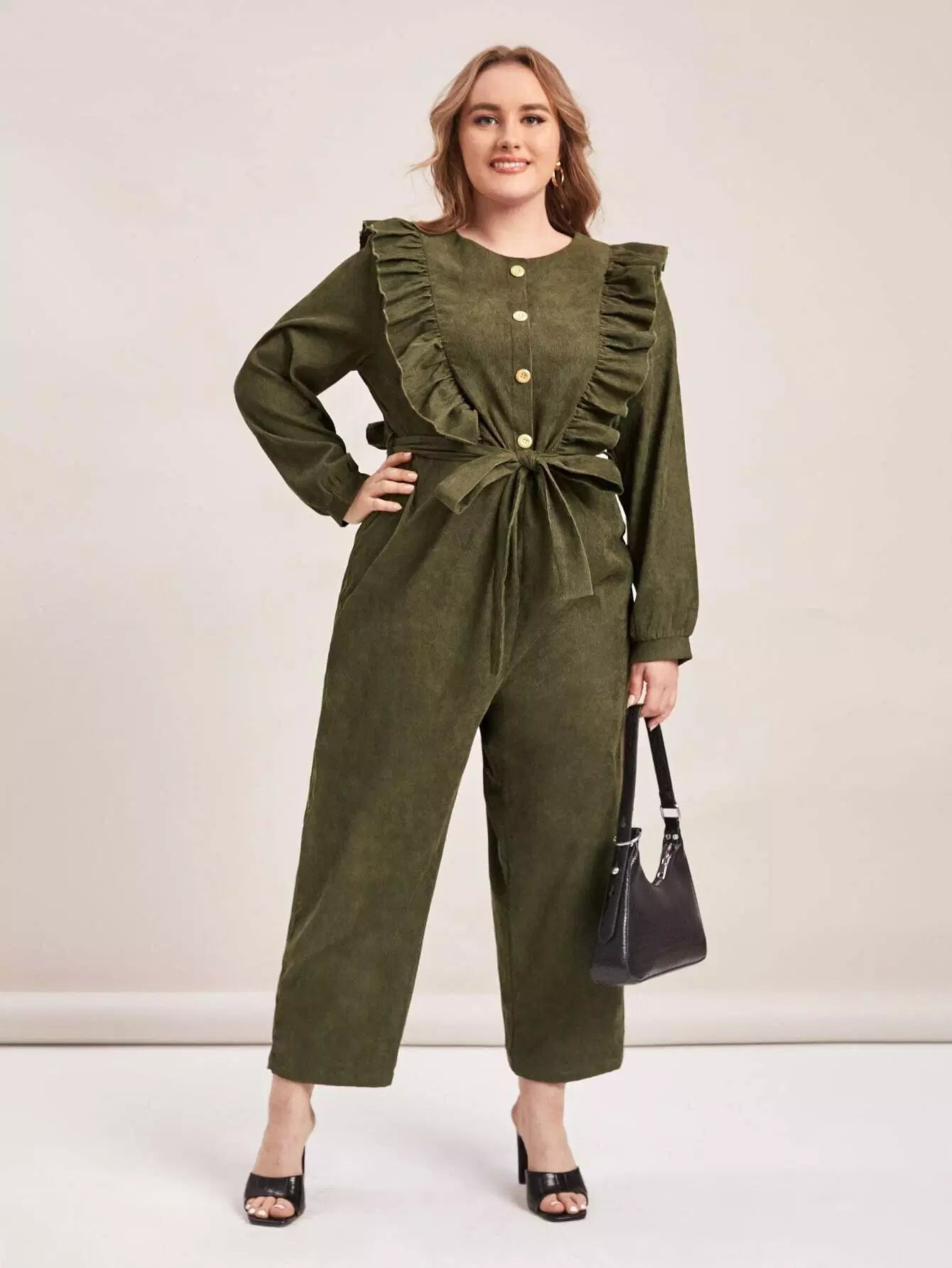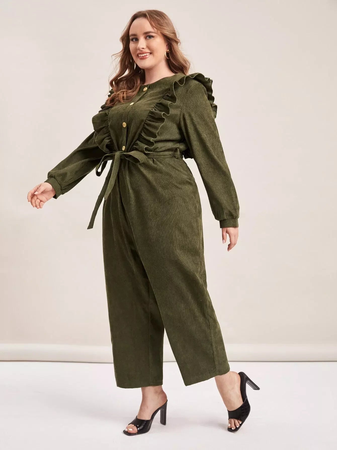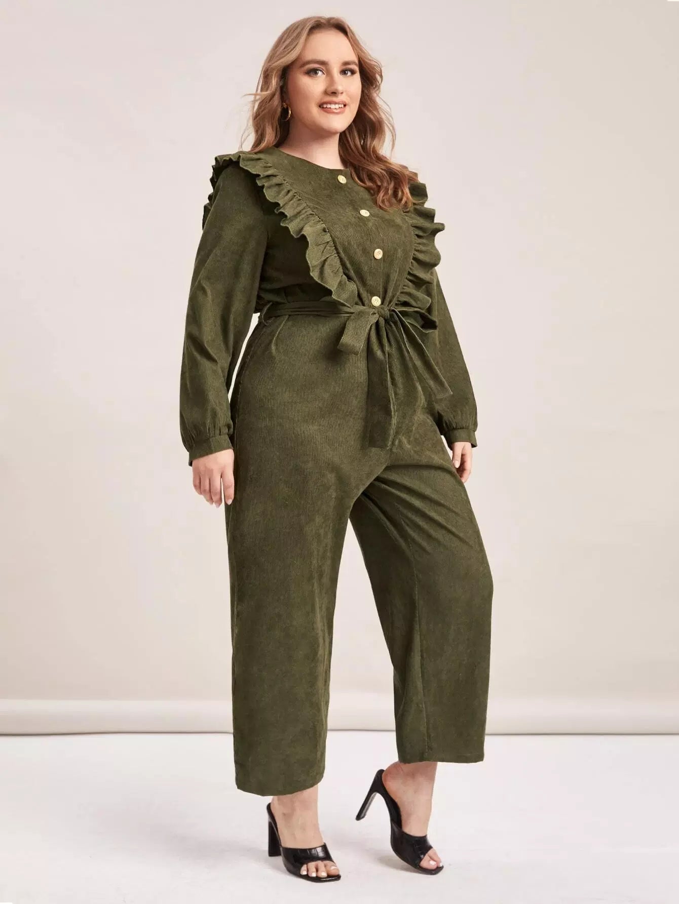 Plus Half Button Ruffle Trim Corduroy Jumpsuit Without Belt
