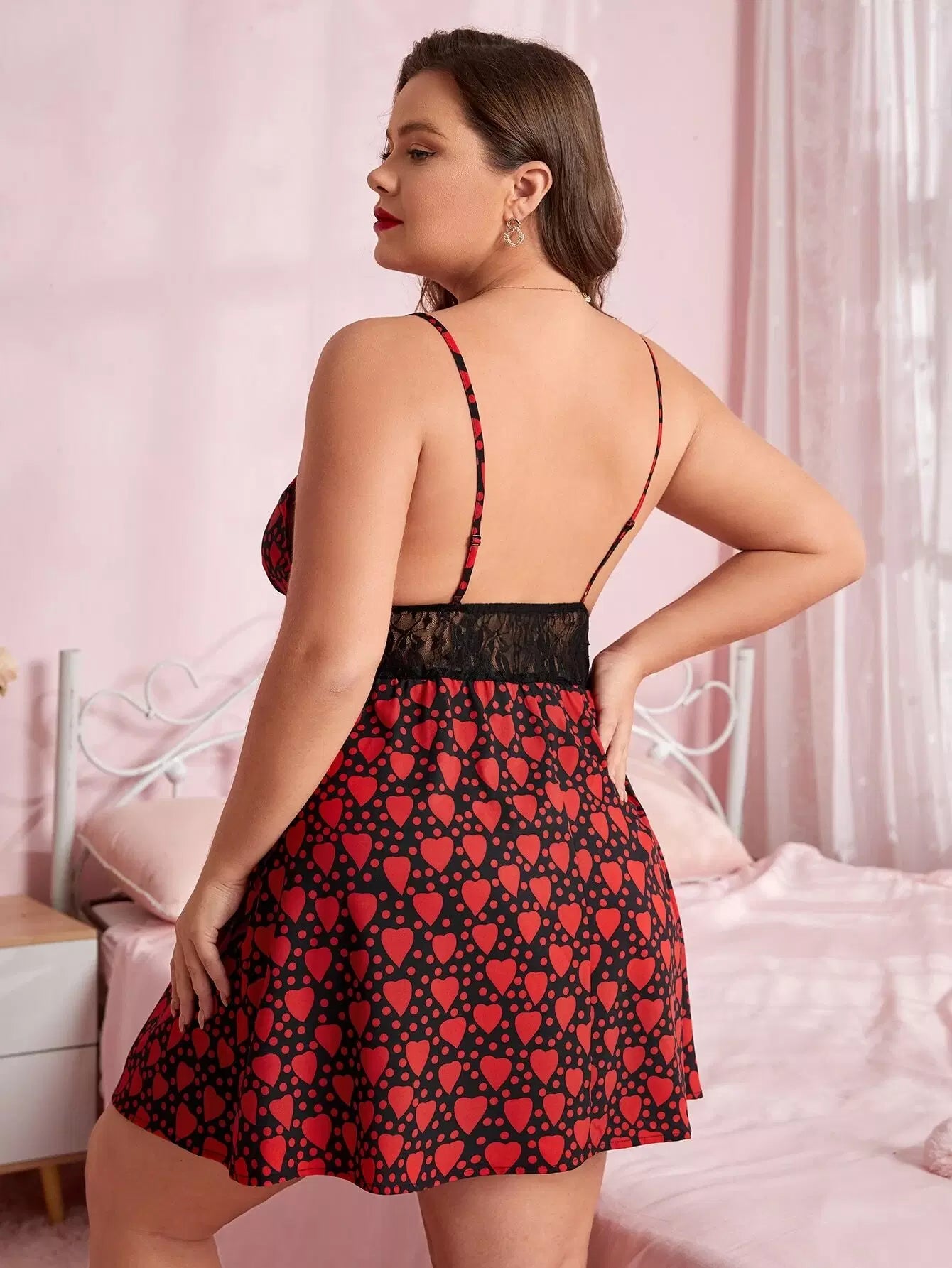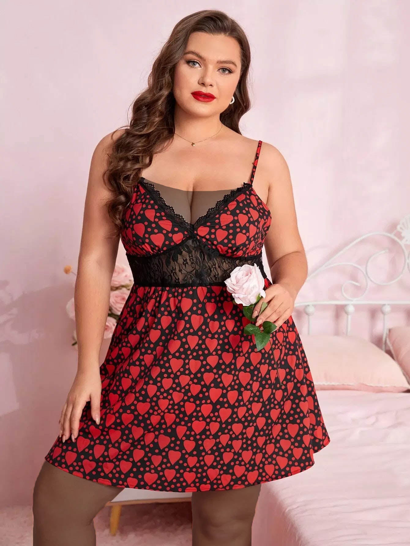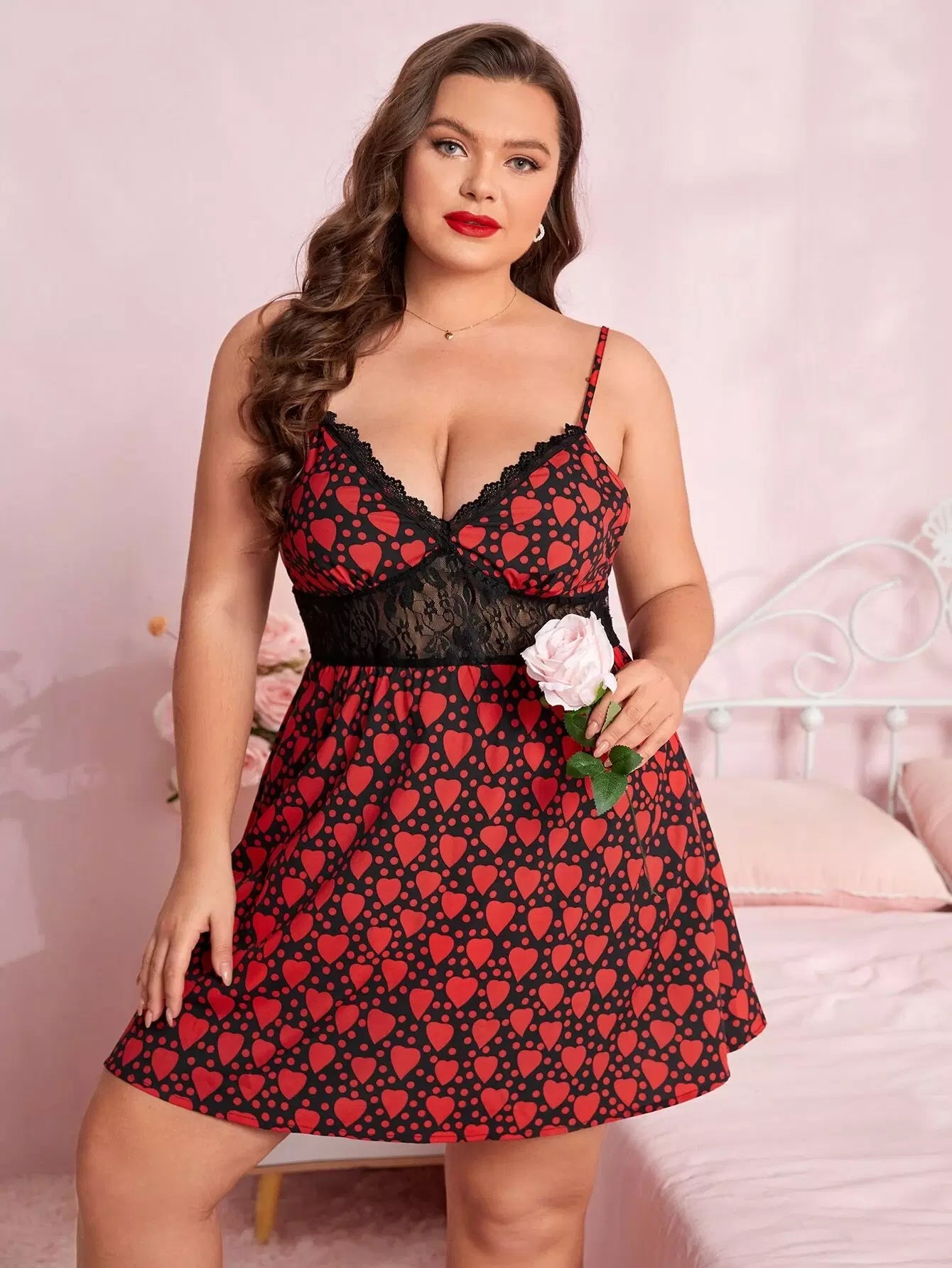 Women - Plus Heart and Polka Dot Print Contrast Lace Insert Slip Nightdress