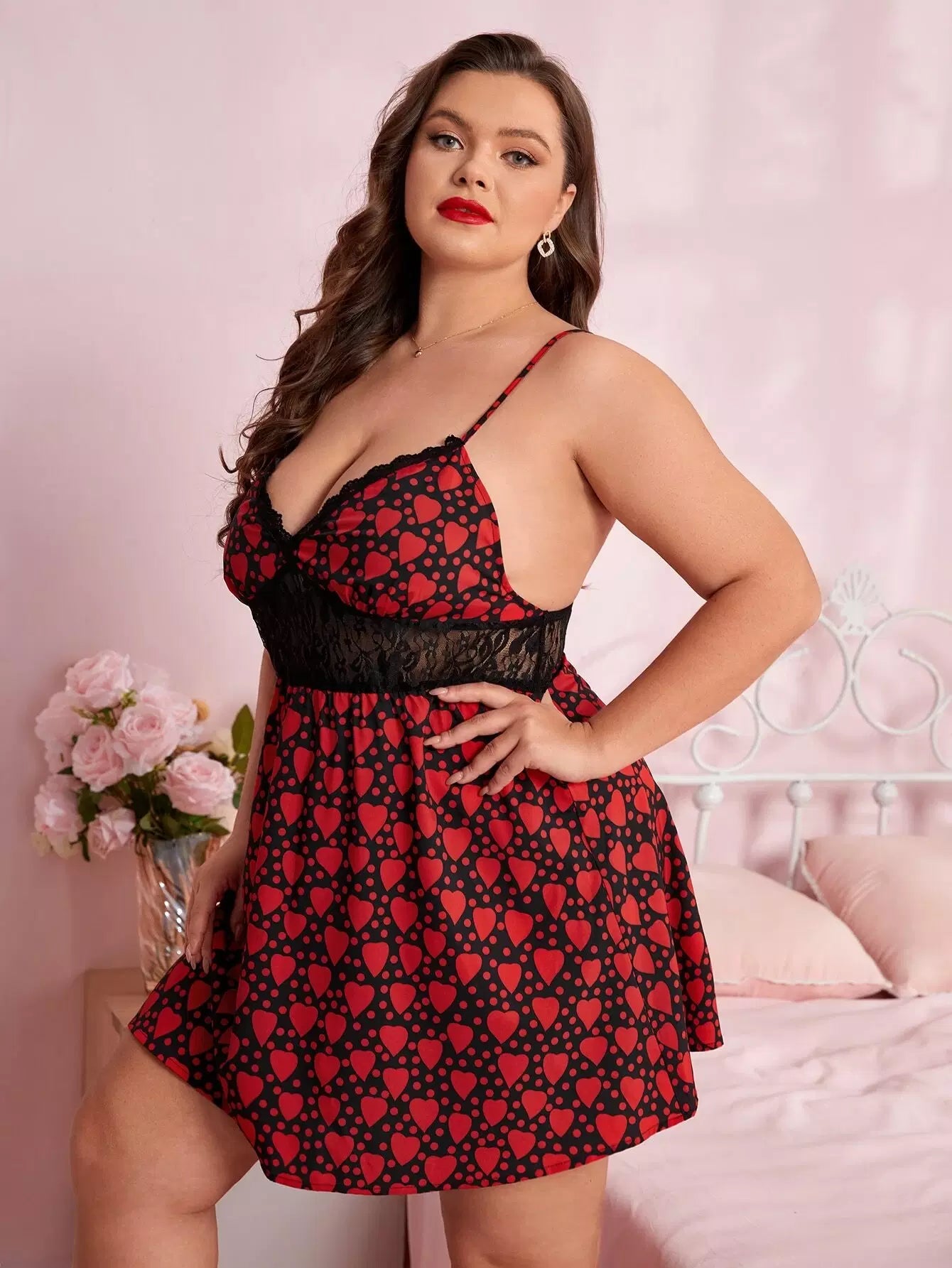 Plus Heart and Polka Dot Print Contrast Lace Insert Slip Nightdress