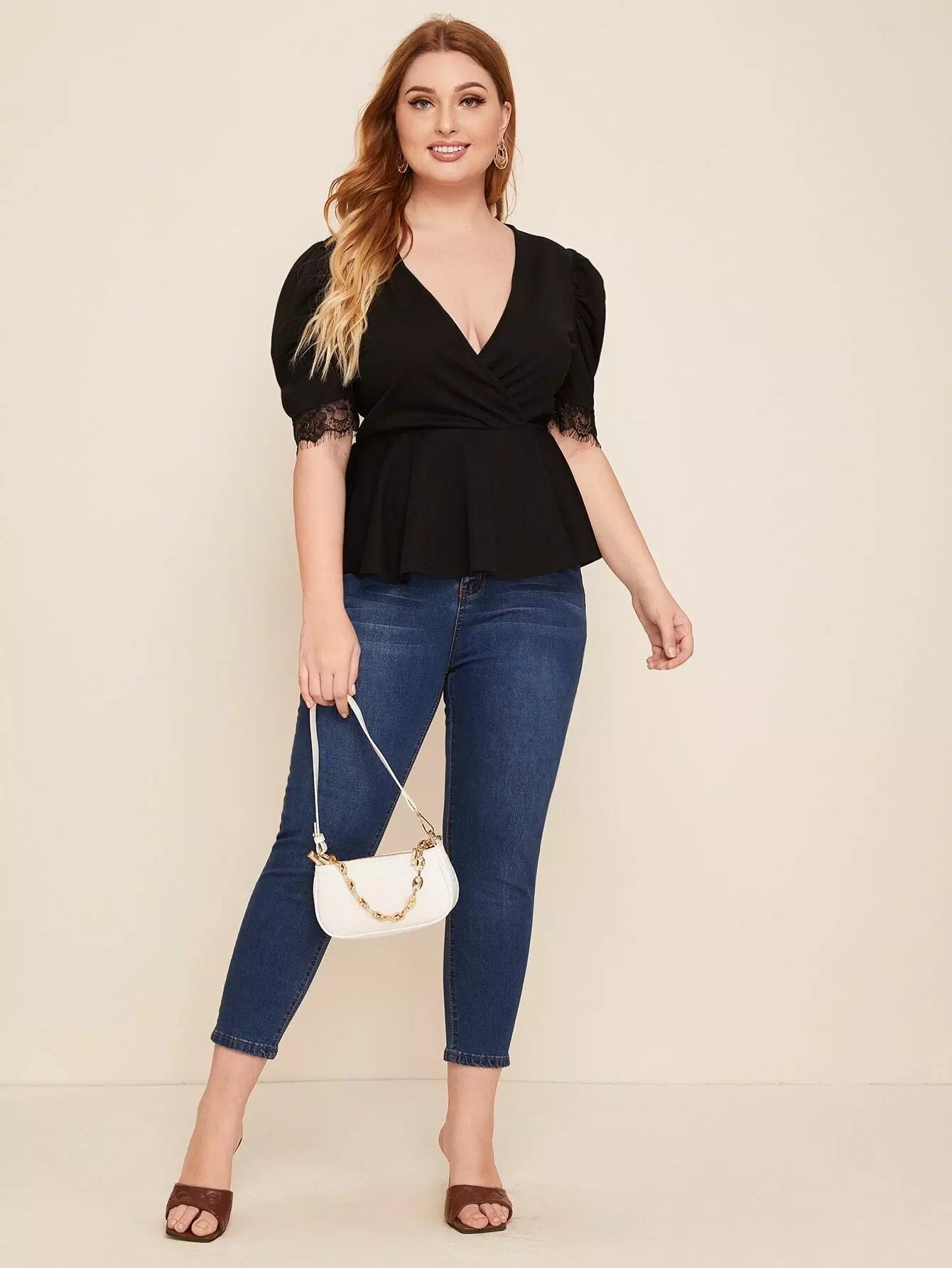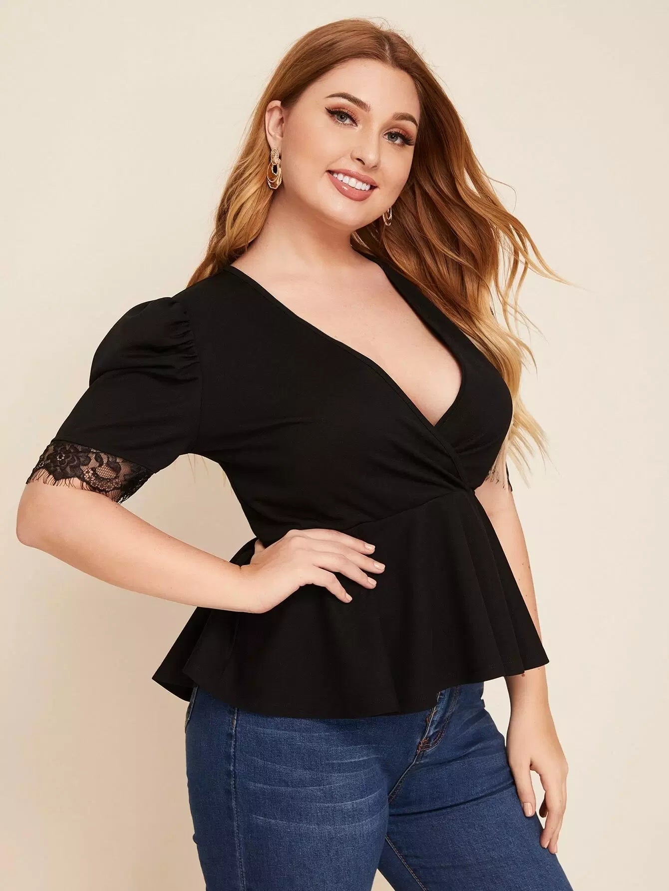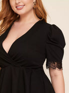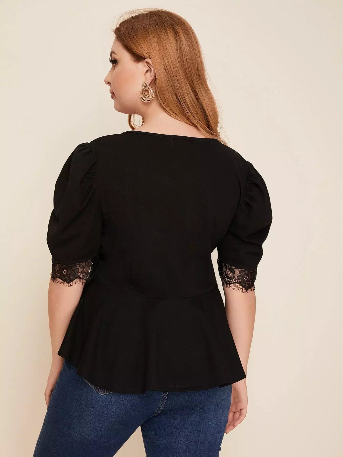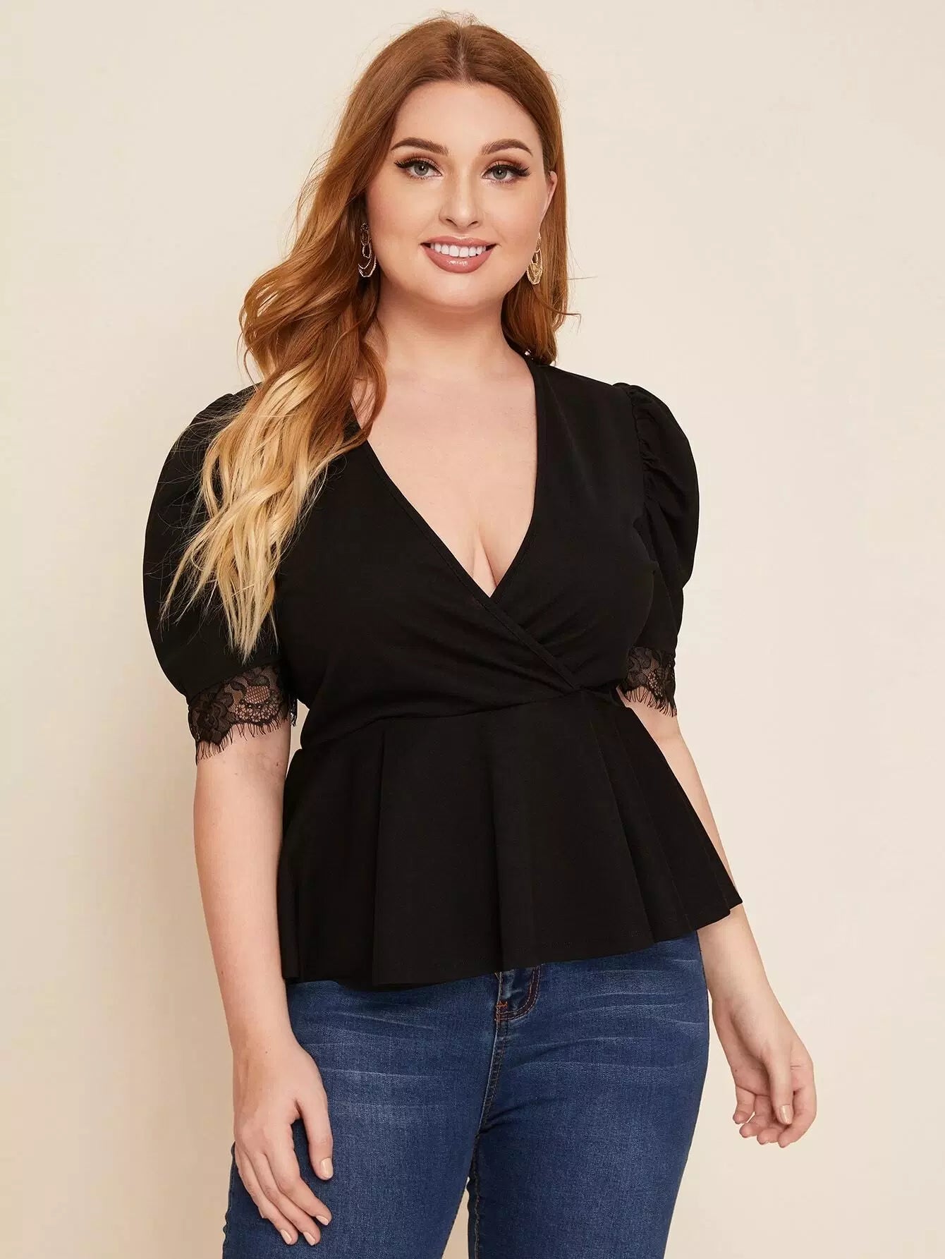 Plus Lace Trim Puff Sleeve Peplum Top