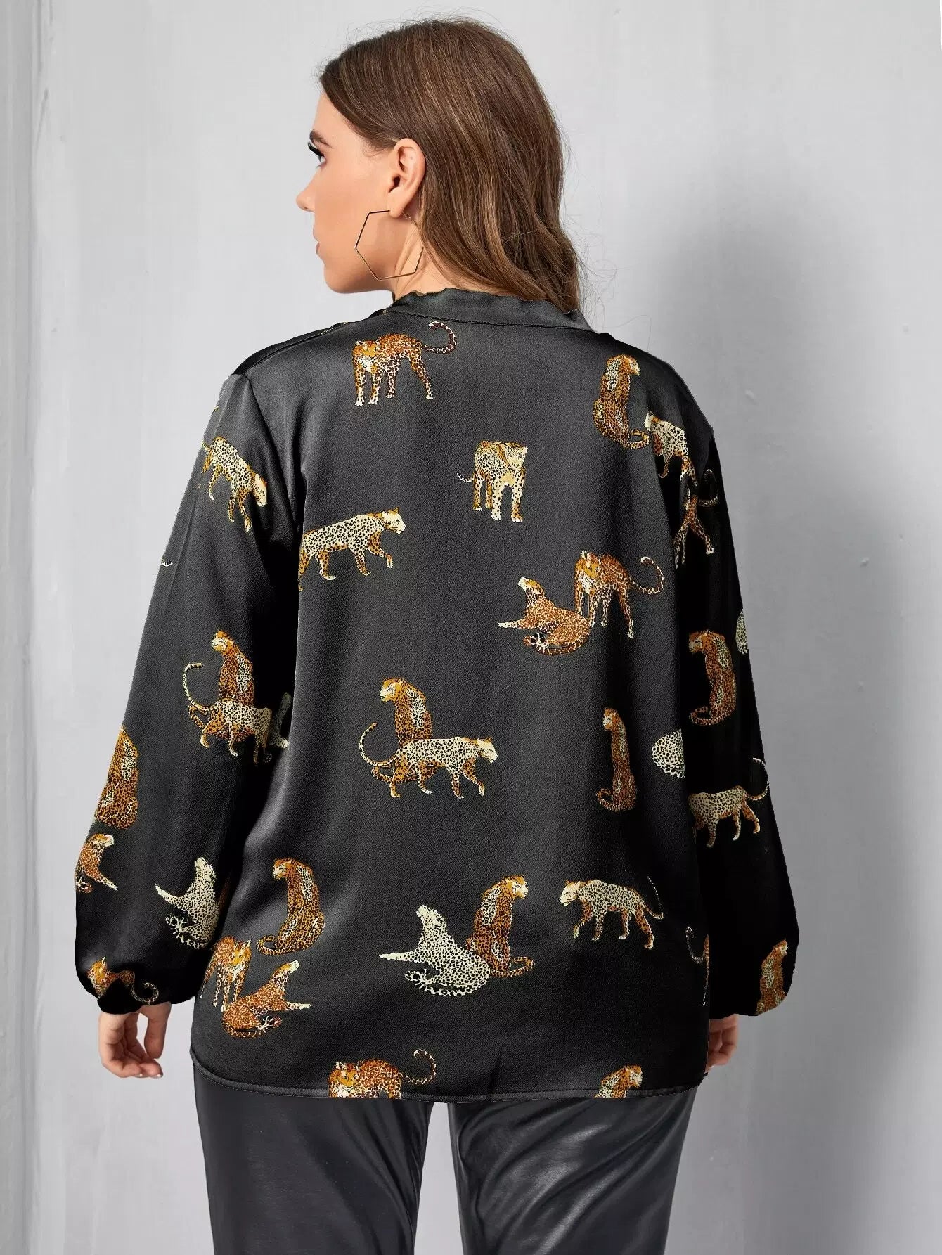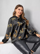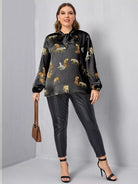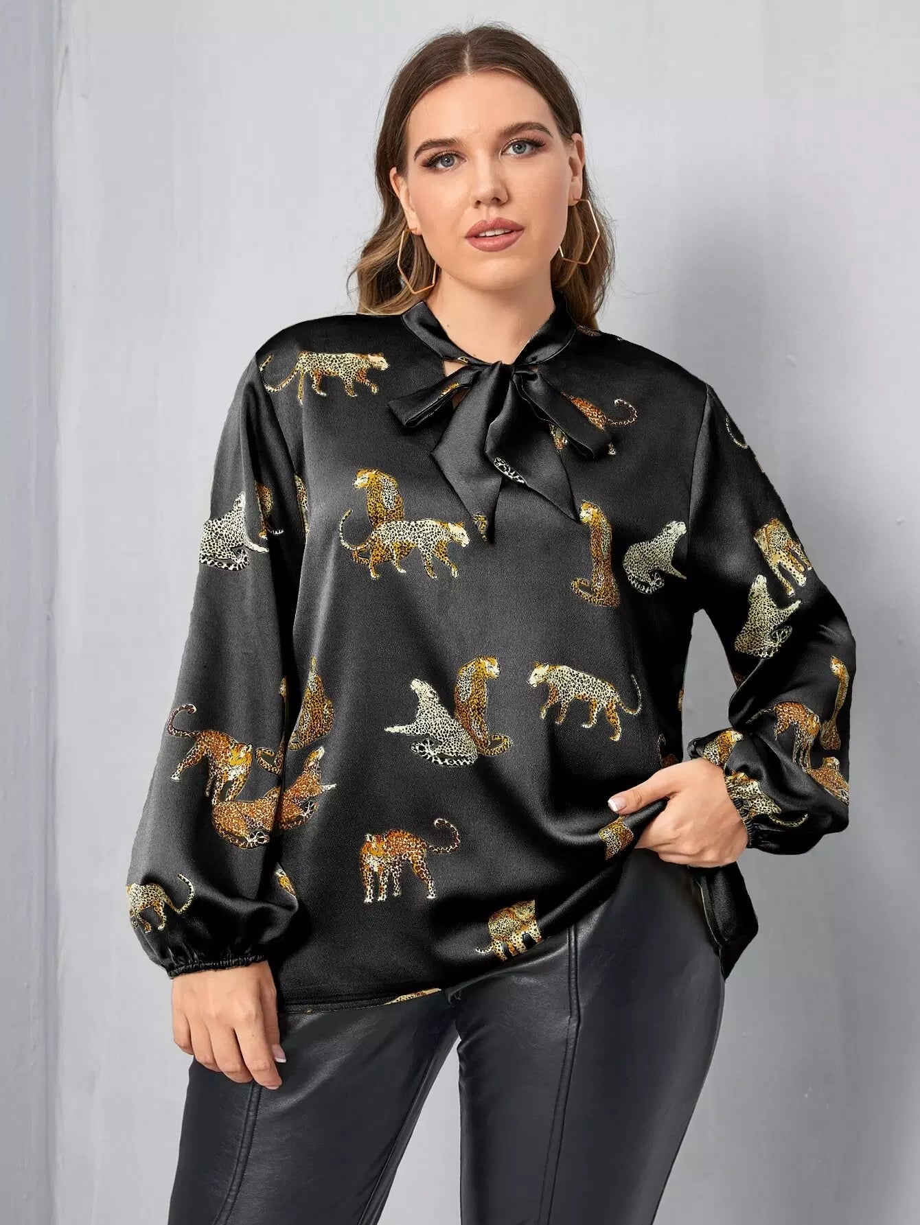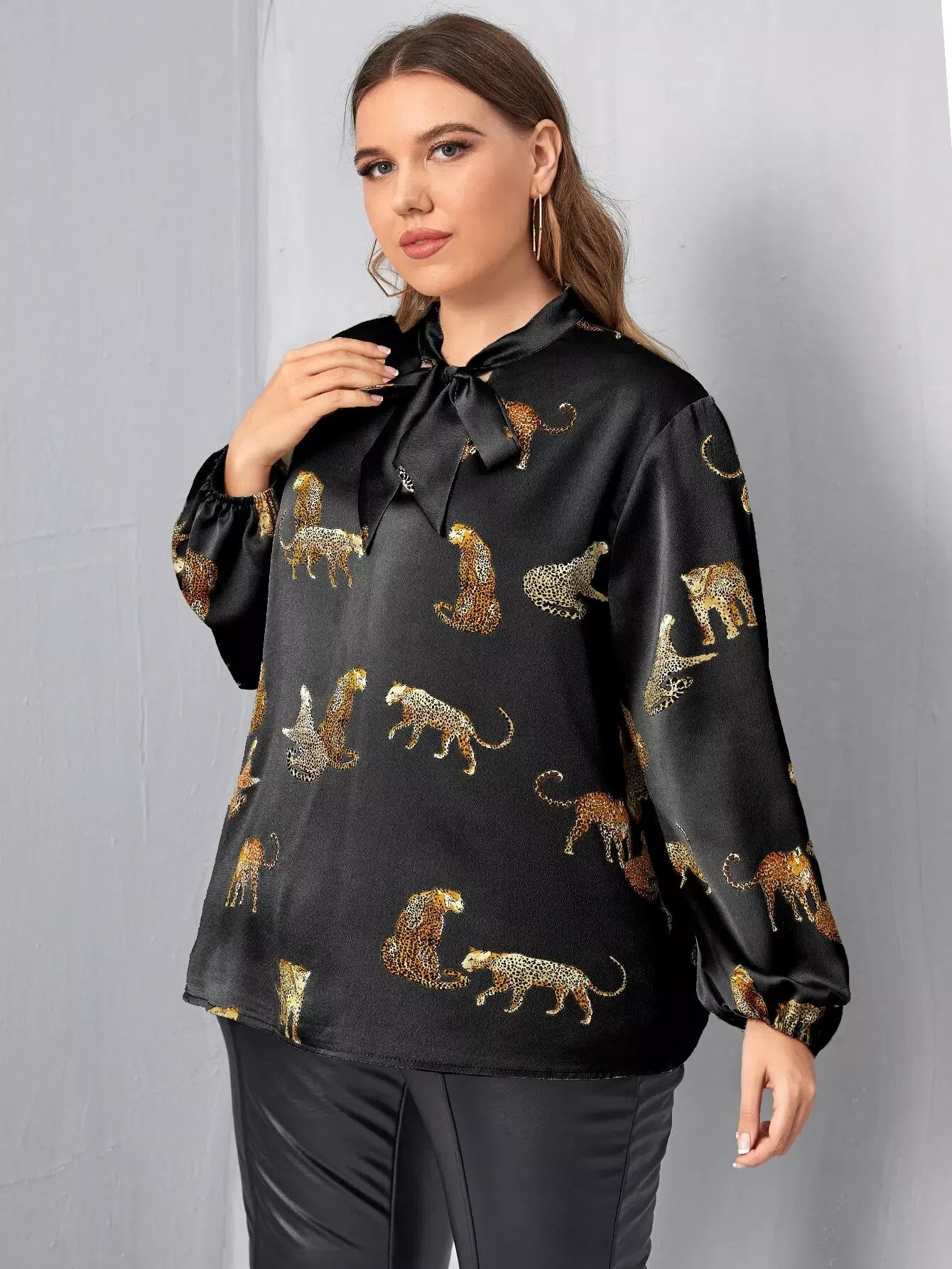 Plus Leopard Print Tie Neck Blouse